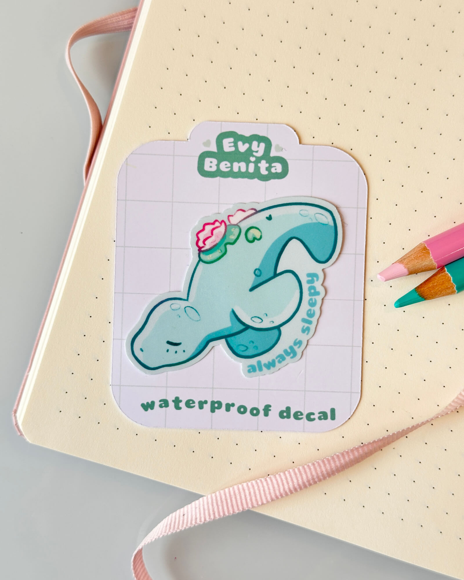 A super cute water-resistant die-cut sticker featuring the Always Sleepy Manatee. Illustrated by Evy Benita. This sticker is approximately two inches on the longest side.