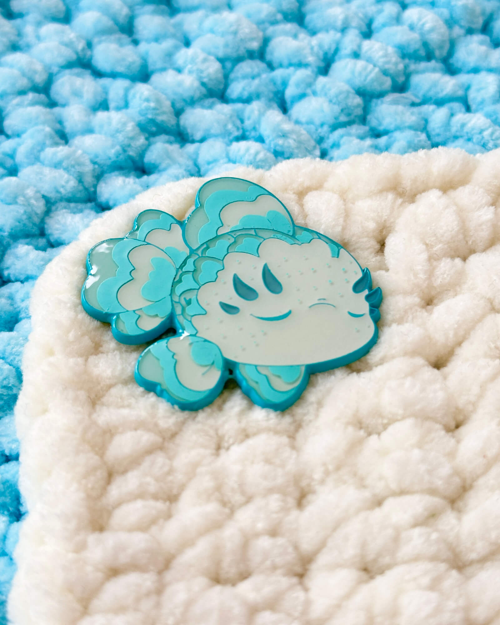 A lovely enamel pin featuring a baby blue flower fish.