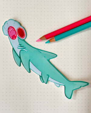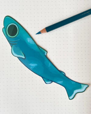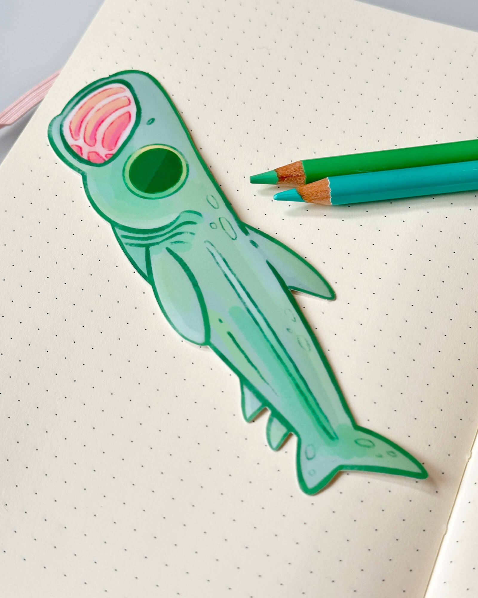 A lovely long boiii sticker featuring the Basking Shark Illustrated by Evy Benita. This sticker is approximately 15cm (6 inches) long.