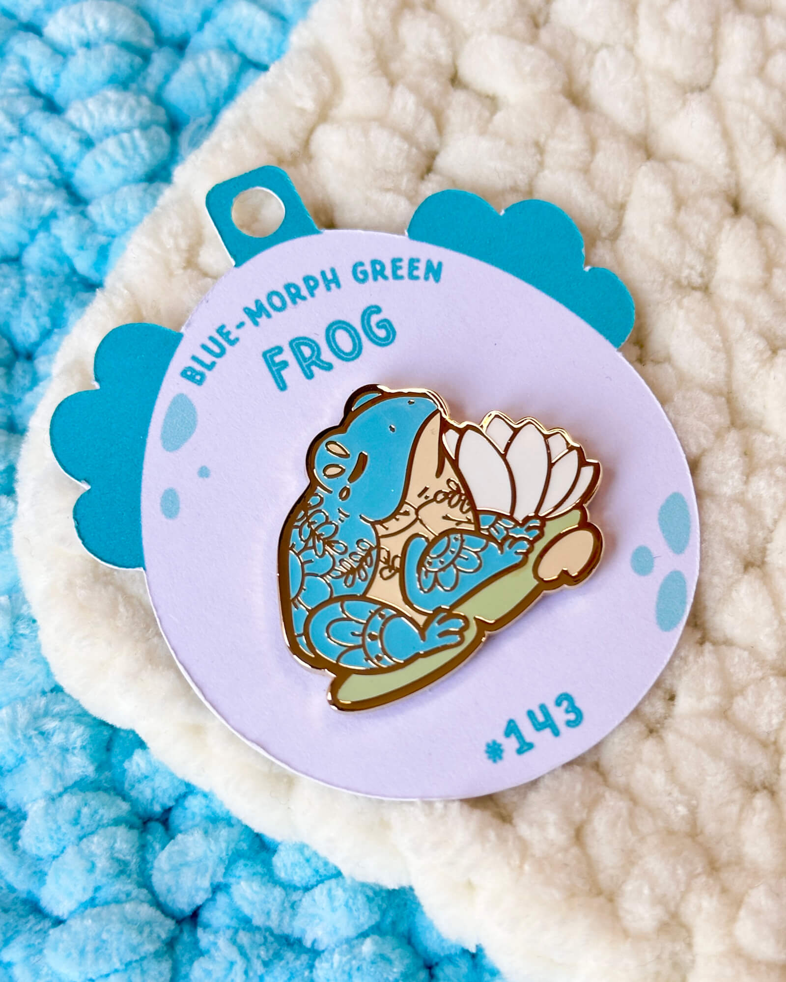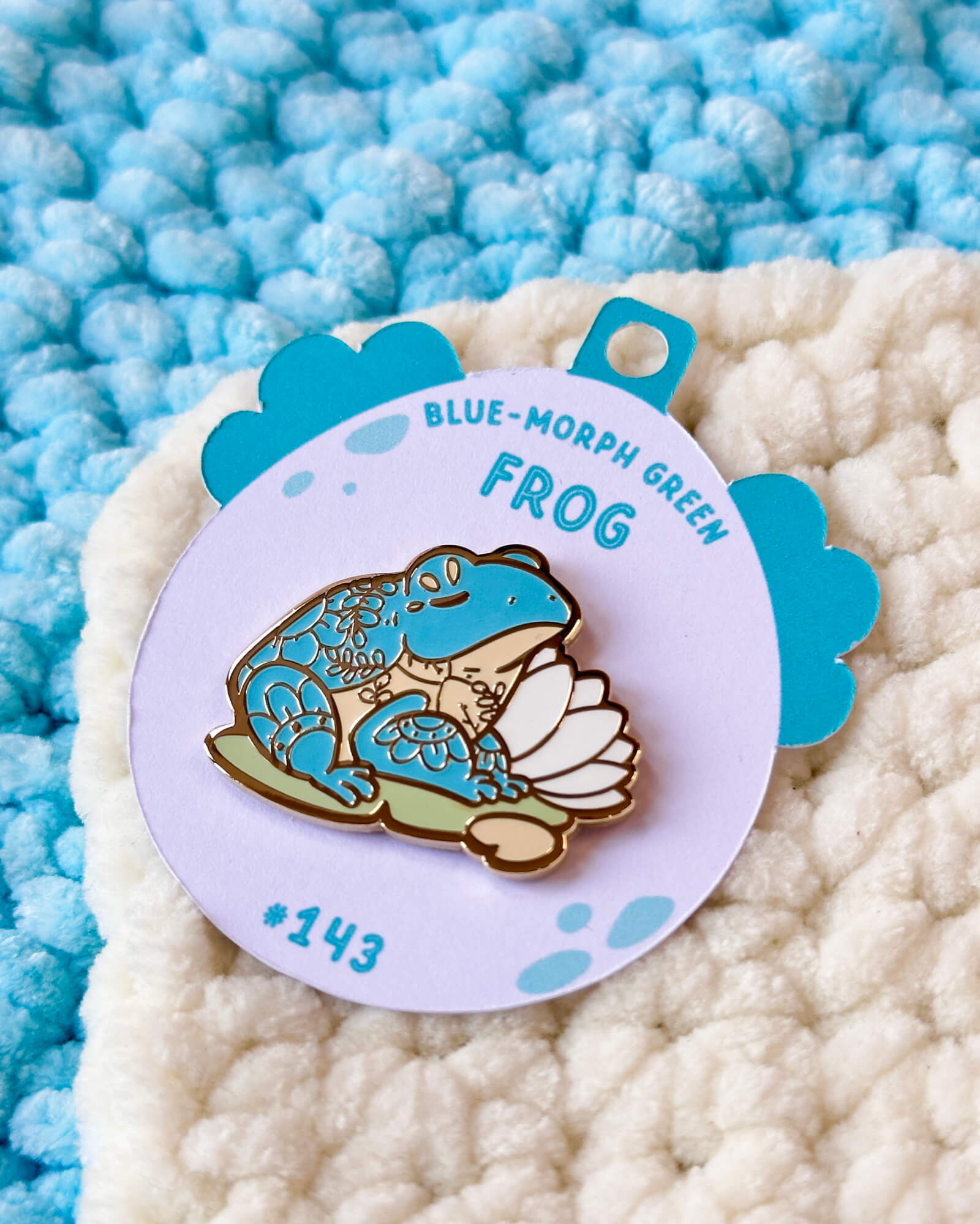 A cute enamel pin featuring the blue morph frog! This cozy enamel pin is part of my Critumi wildlife series and makes a wonderful gift for both pin badge and animal lovers. Made with gold plated metal, blue glow powder and hard enamel.