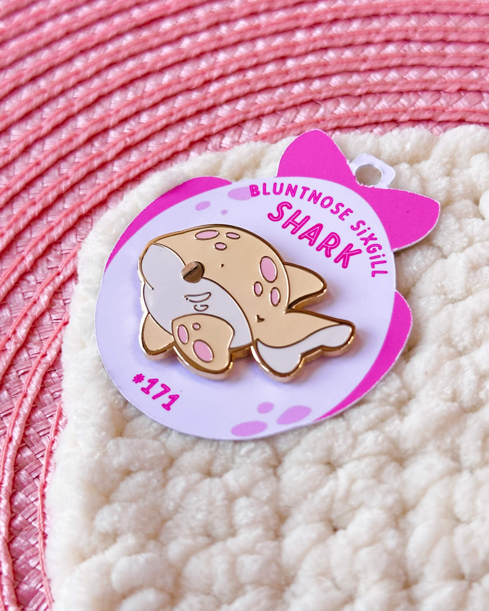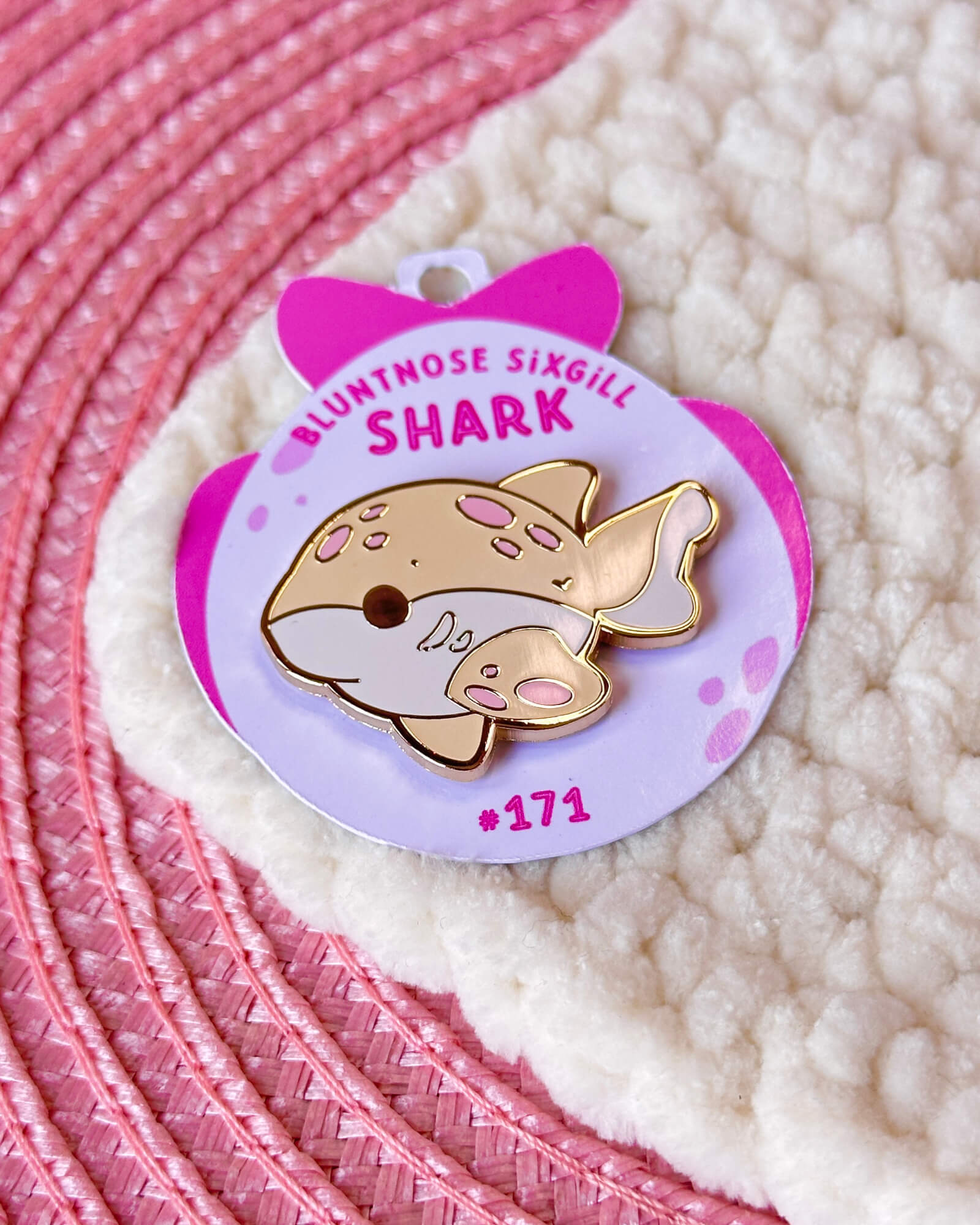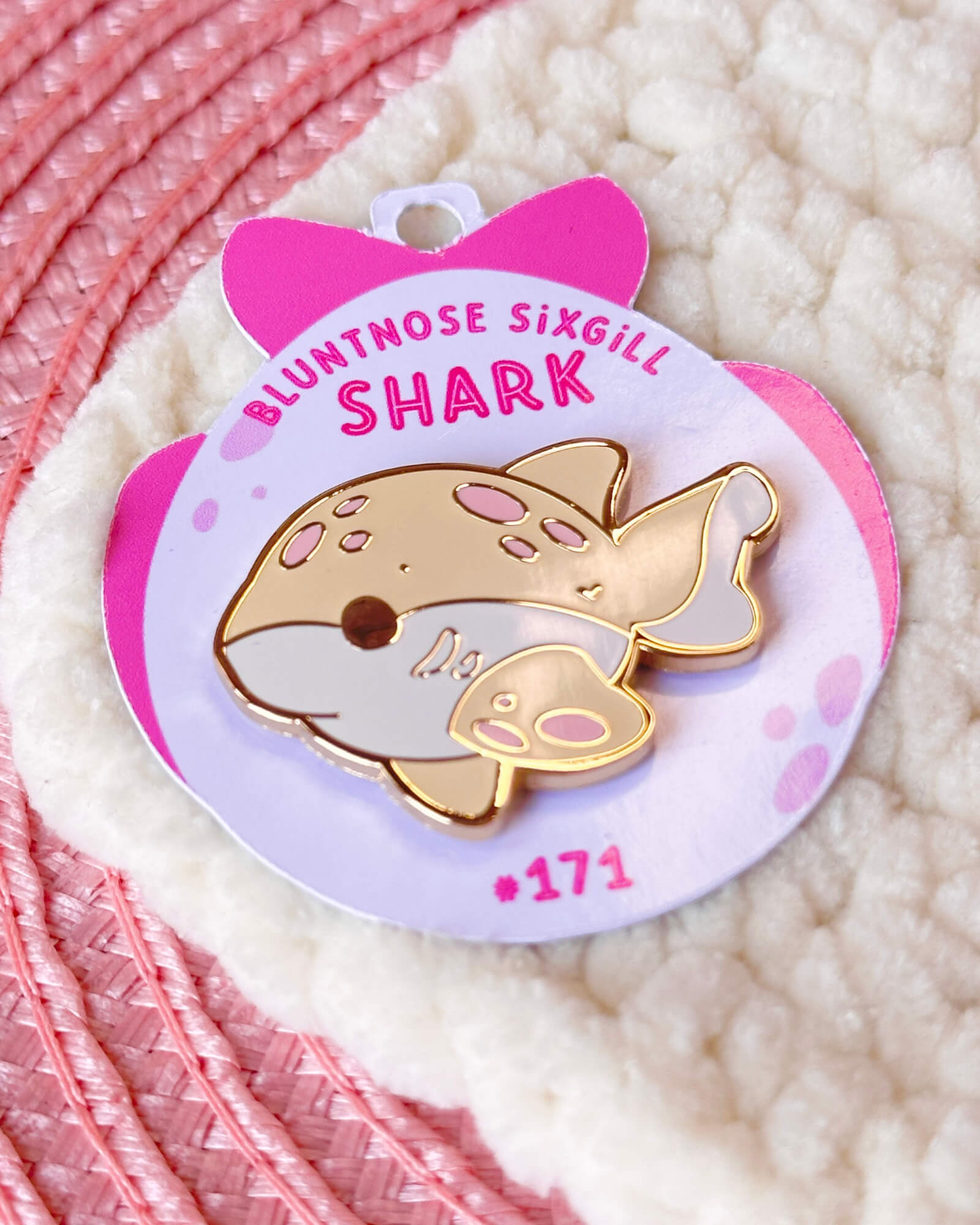 A cute enamel pin featuring a bluntnose sixgill shark.