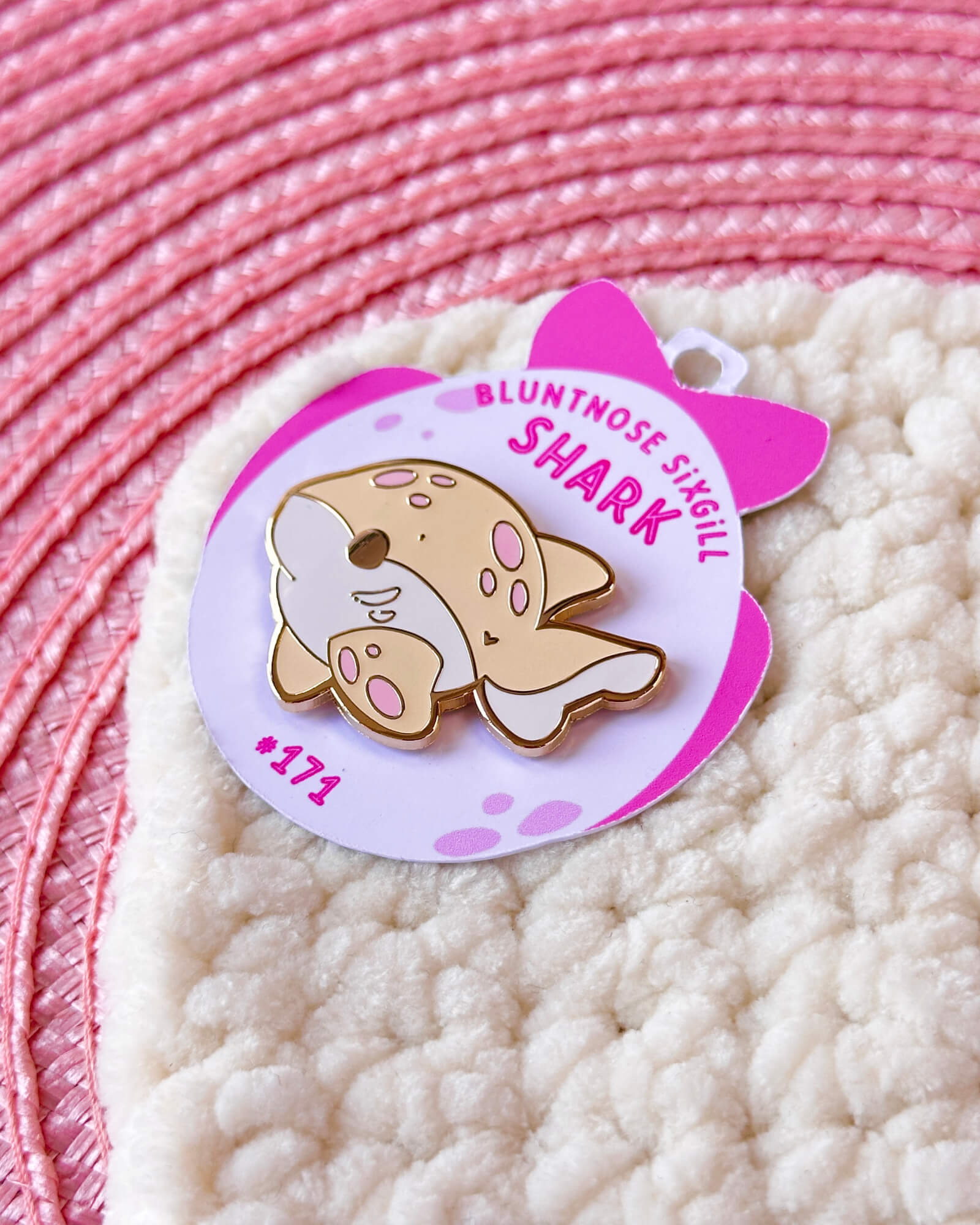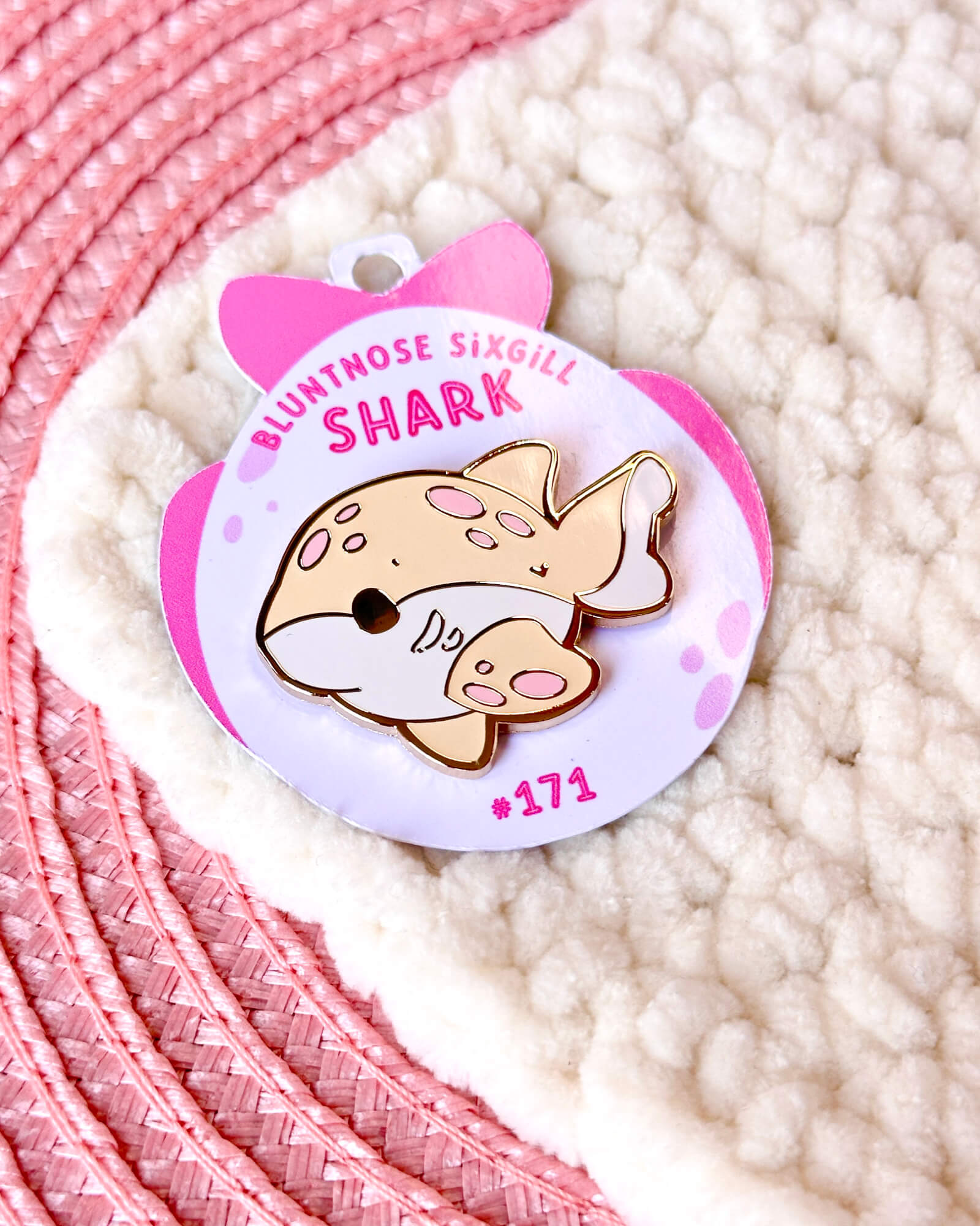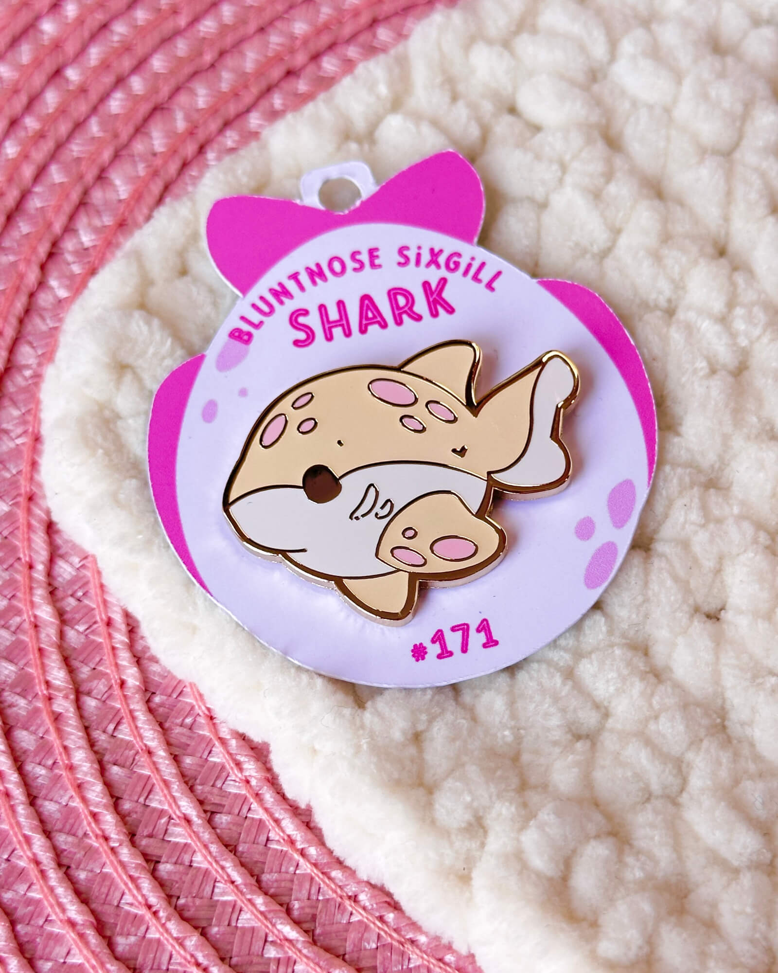 A cute enamel pin featuring a bluntnose sixgill shark.