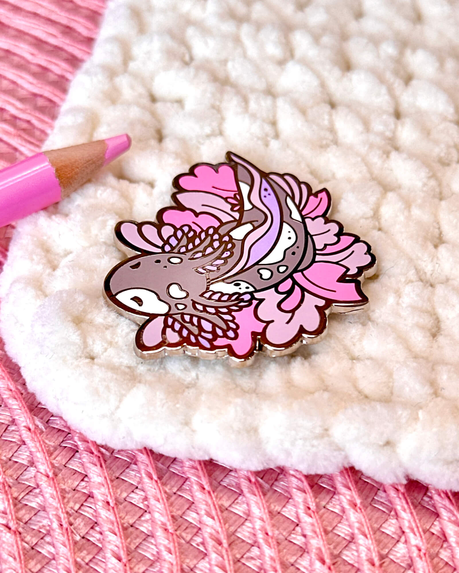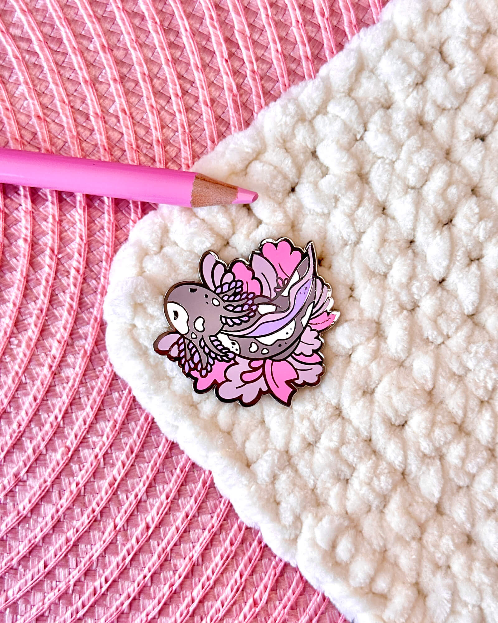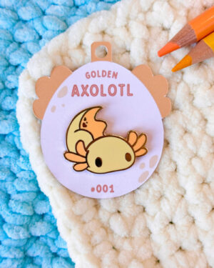 A lovely enamel pin featuring a coral speckled axolotl.