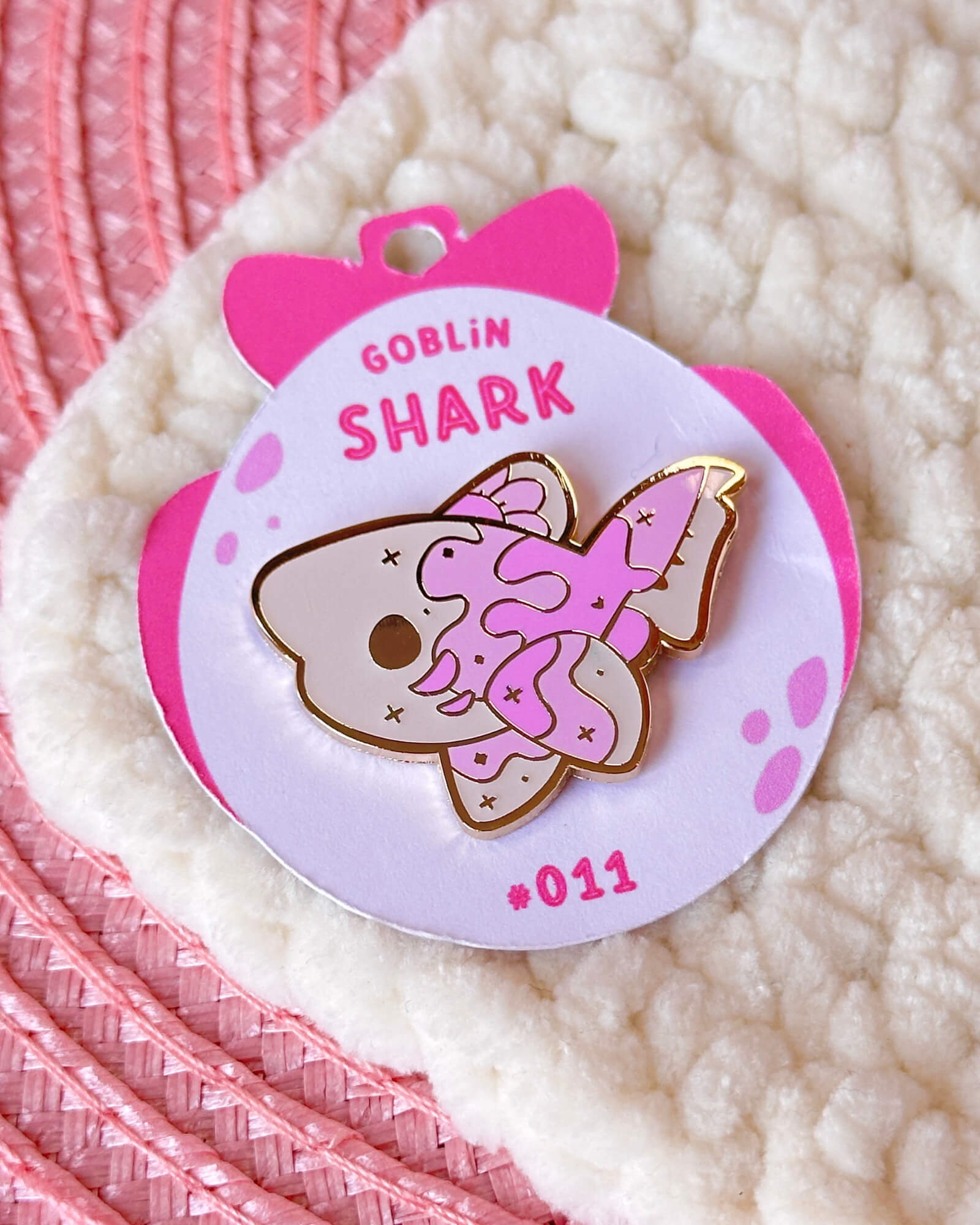 A cute enamel pin featuring the cosmic goblin shark! This cozy enamel pin is part of my Critumi wildlife series and makes a wonderful gift for both pin badge and animal lovers. Made with gold plated metal and hard enamel.