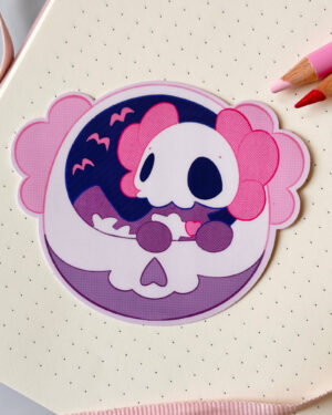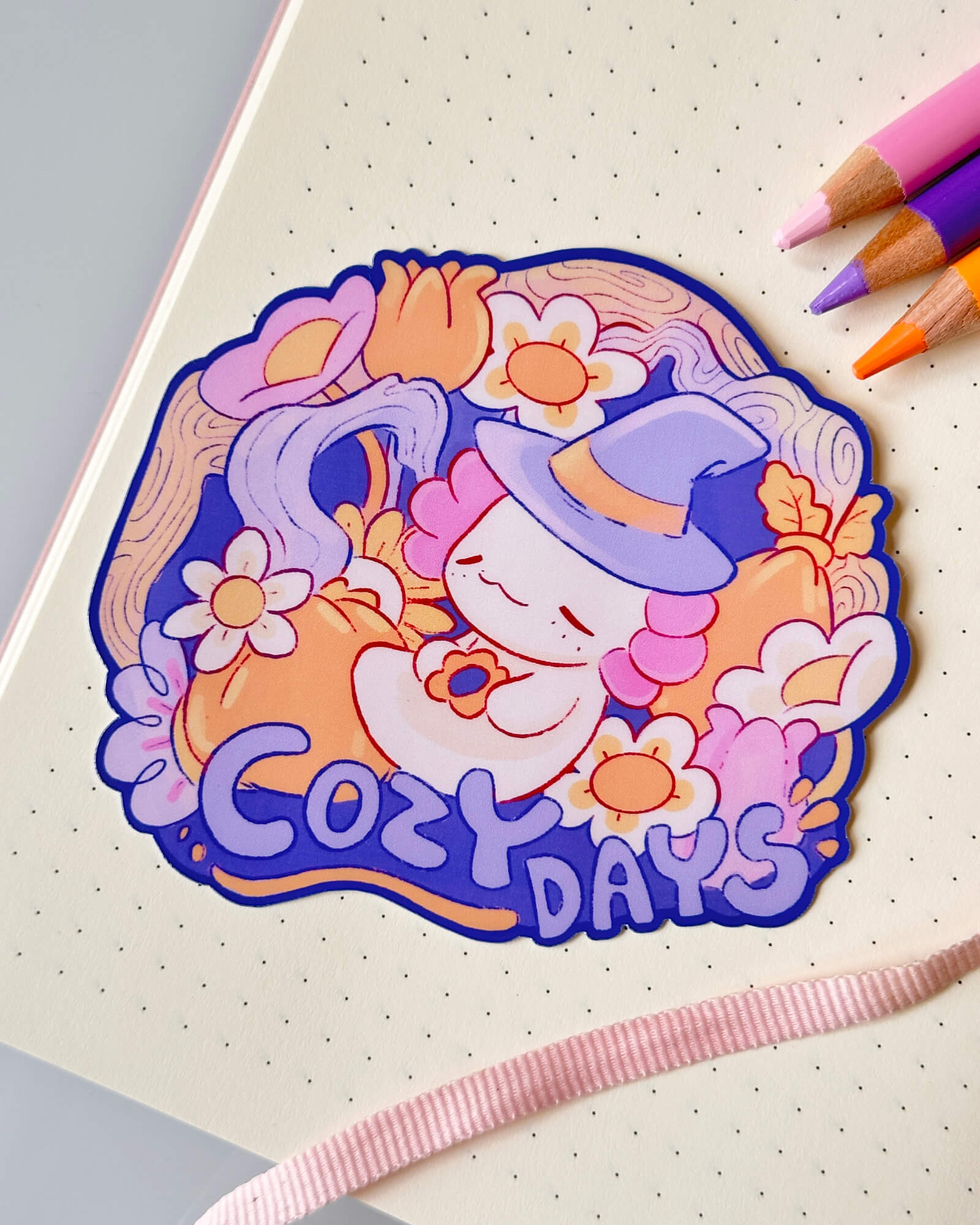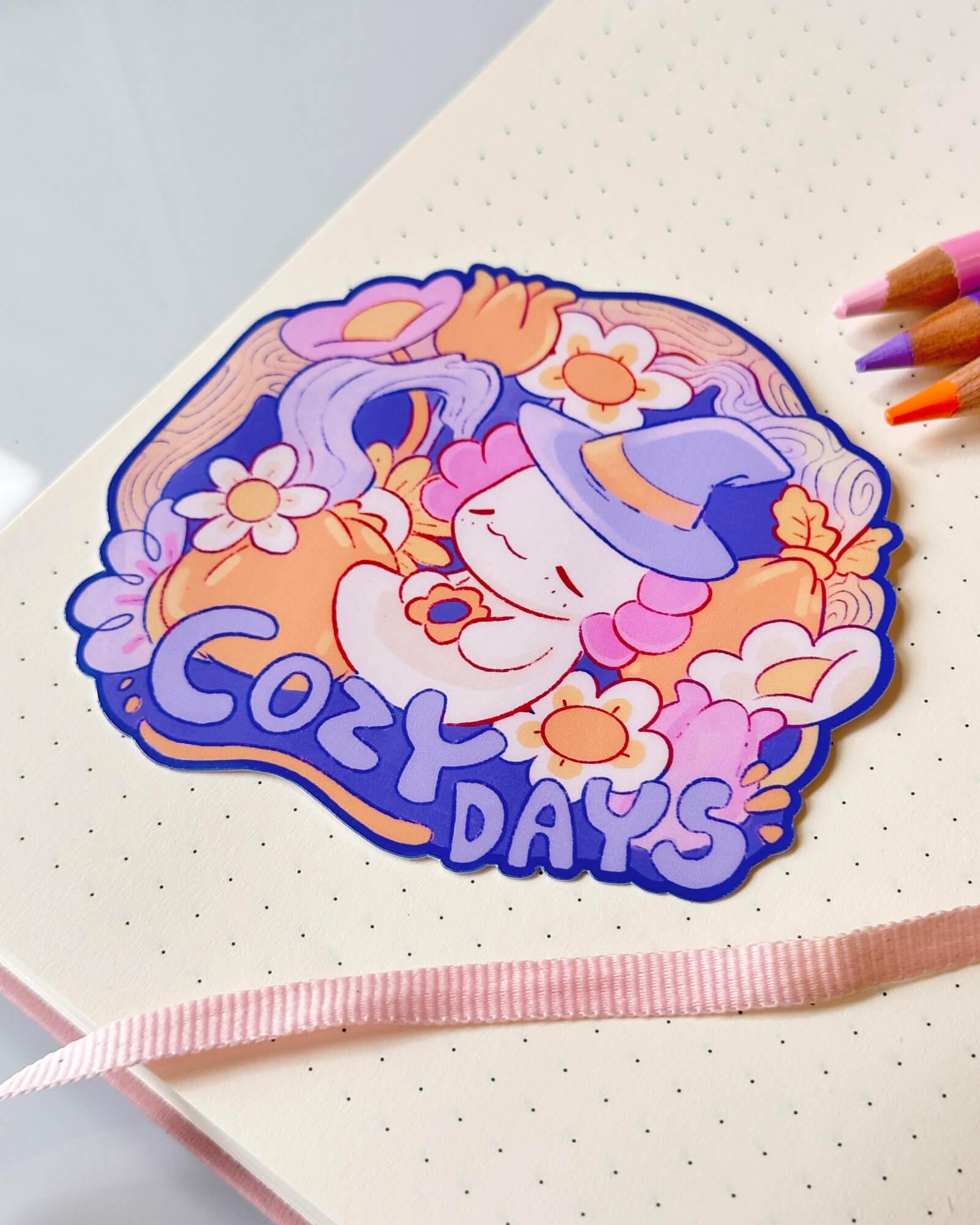A super cute water-resistant die-cut sticker featuring the Cozy Days Lotl Witch. Illustrated by Evy Benita. This sticker is approximately two inches on the longest side.