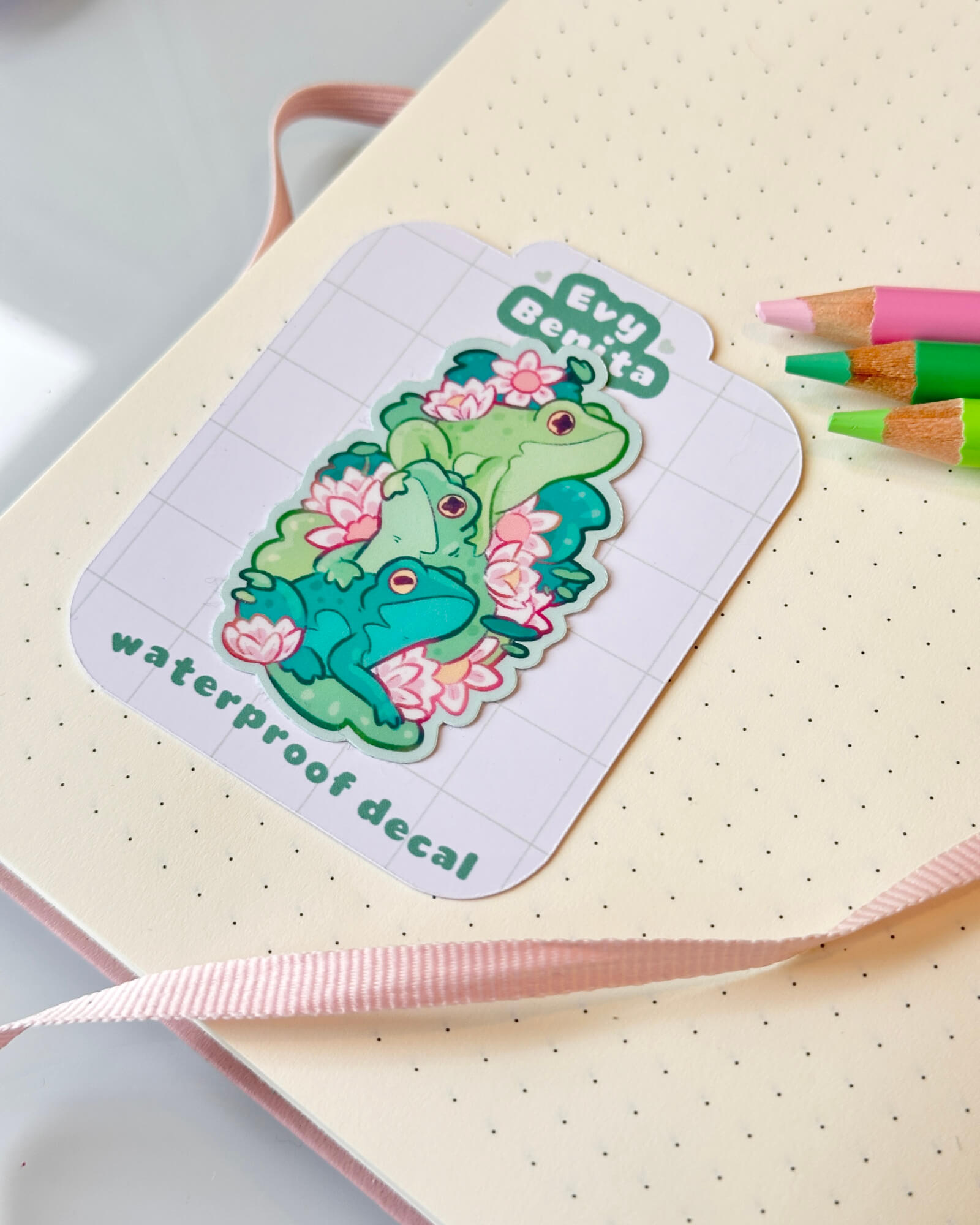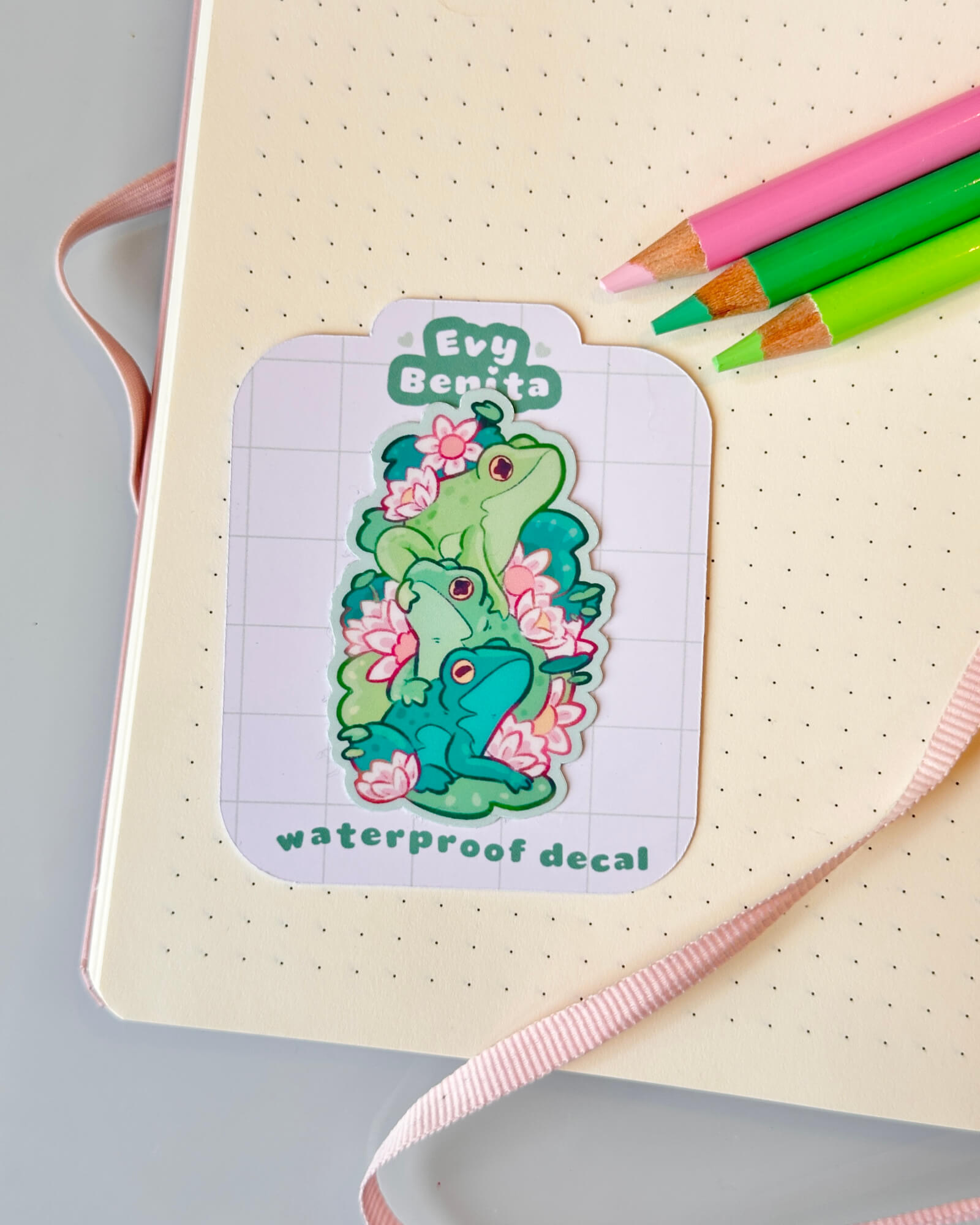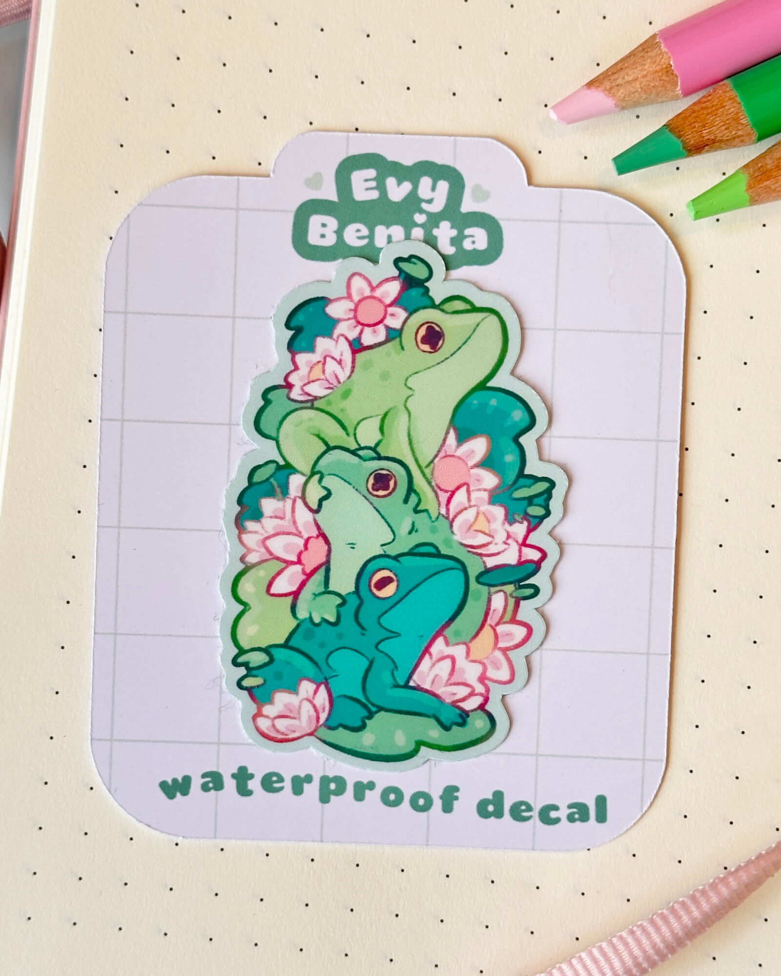 A super cute water-resistant die-cut sticker featuring the Cozy Frog Stack. Illustrated by Evy Benita. This sticker is approximately two inches on the longest side.