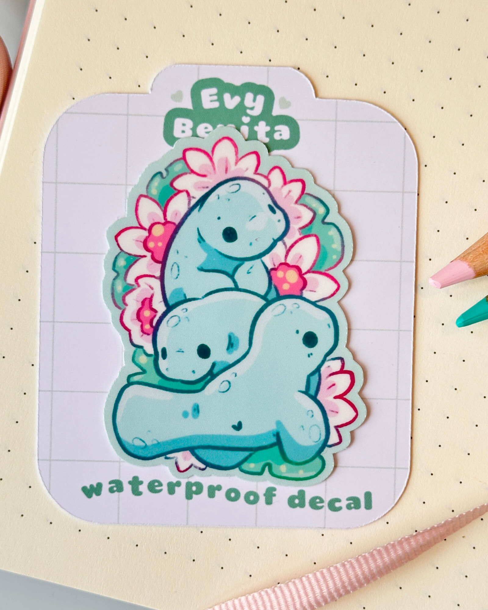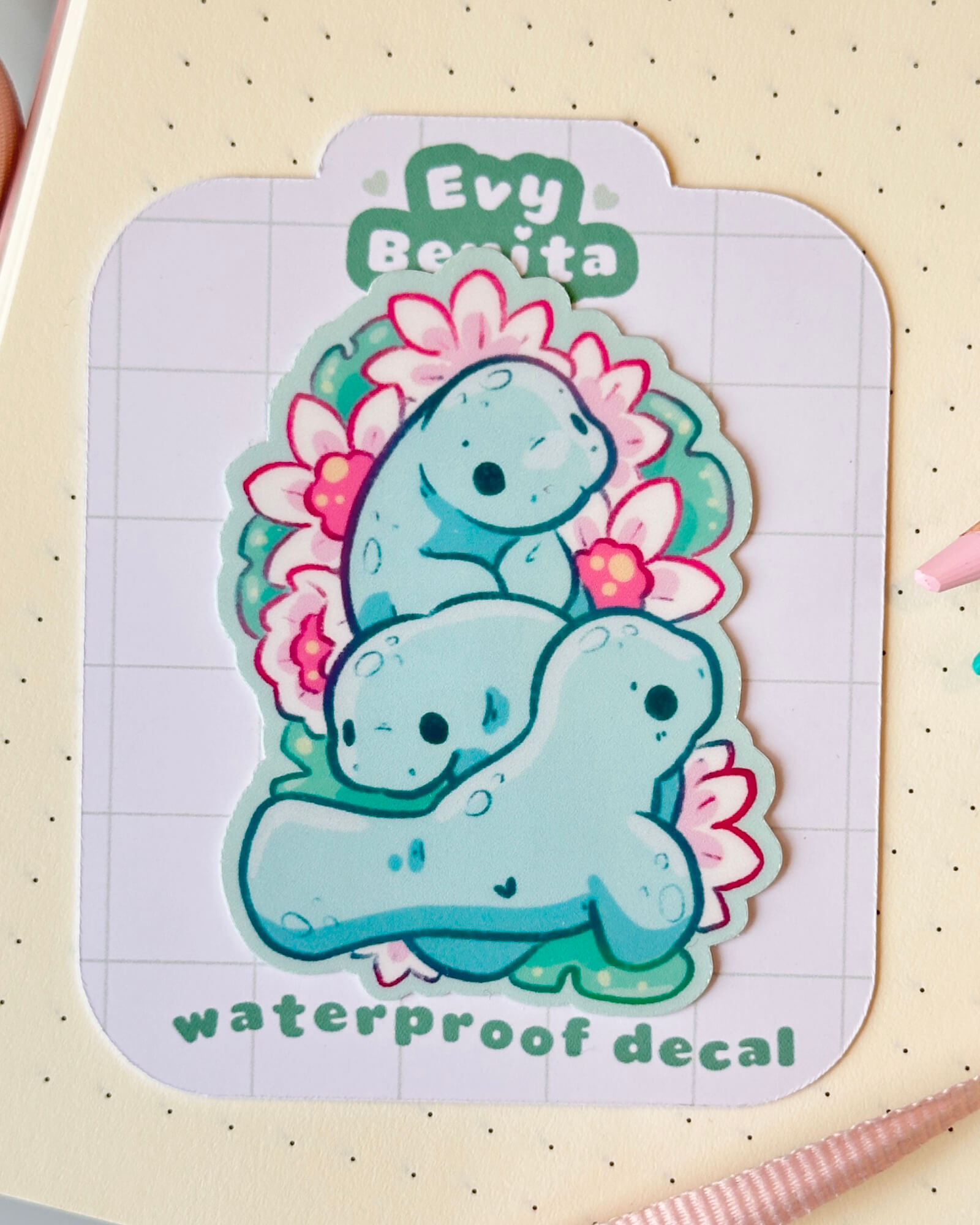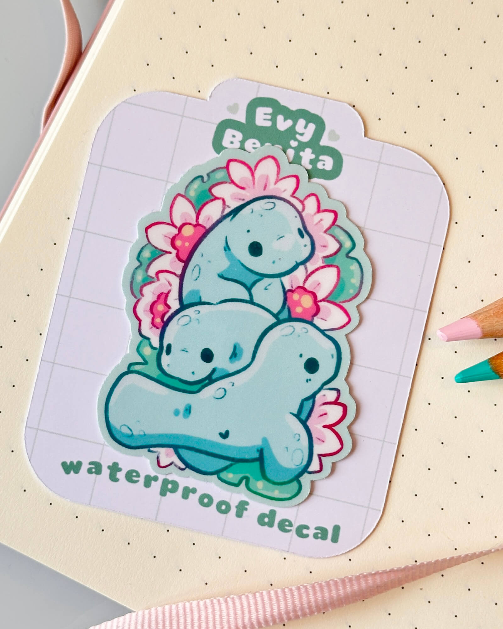 A super cute water-resistant die-cut sticker featuring the Cozy Manatee Stack. Illustrated by Evy Benita. This sticker is approximately two inches on the longest side.