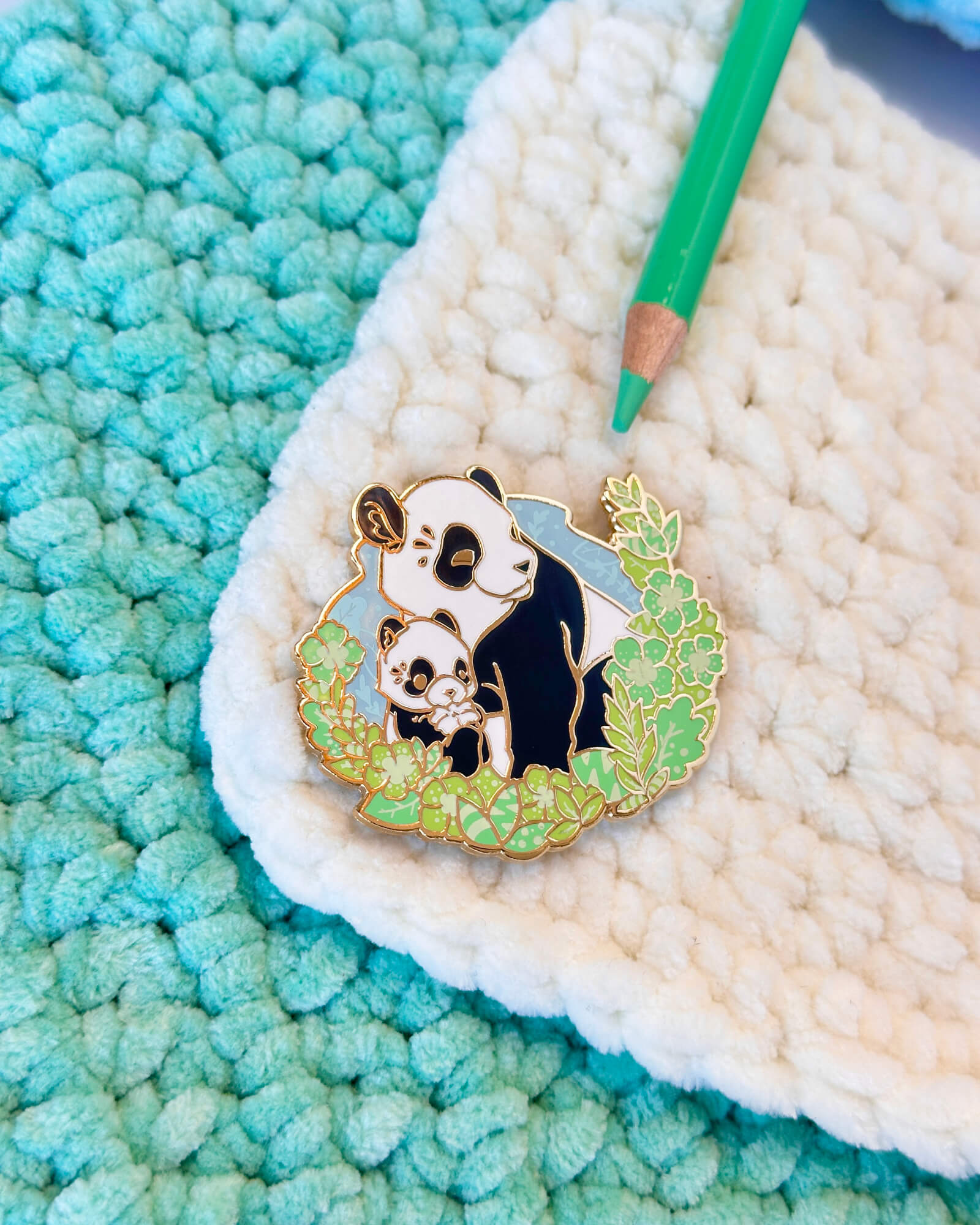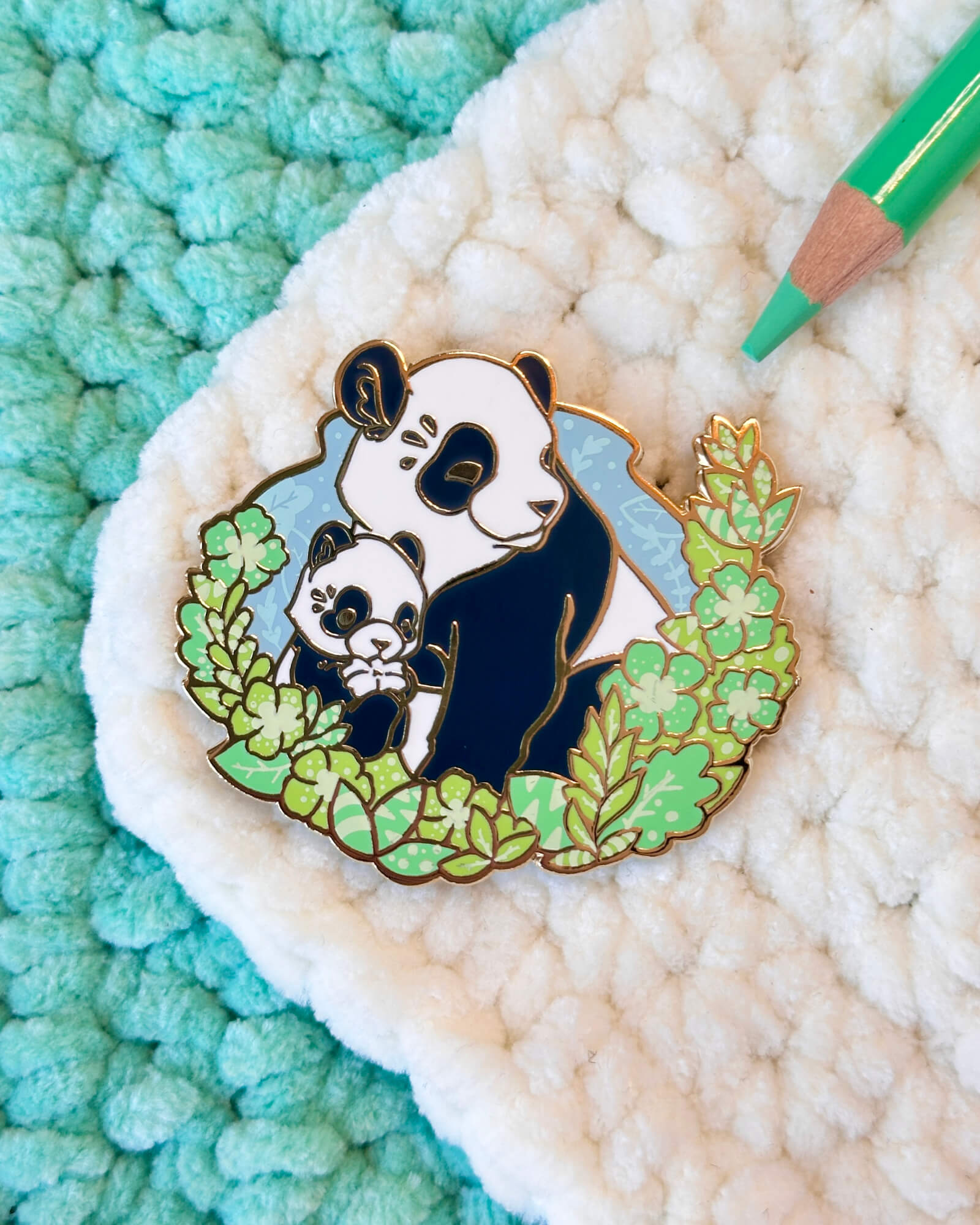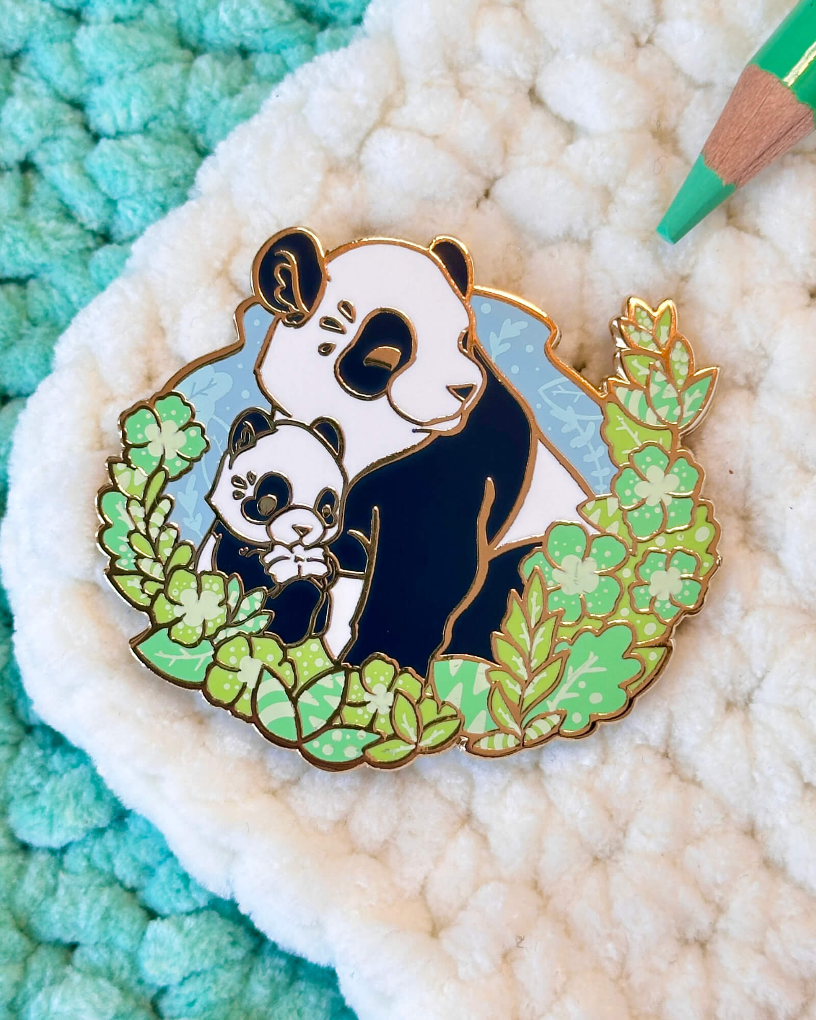 A lovely enamel pin featuring a daylight panda family.