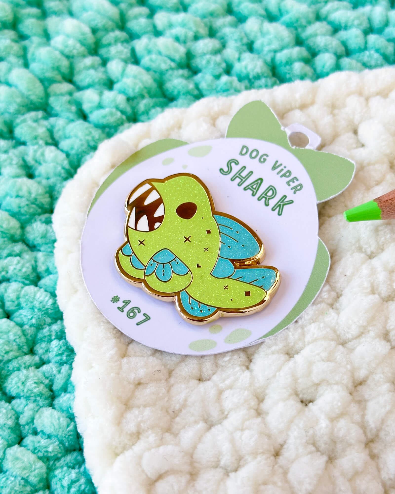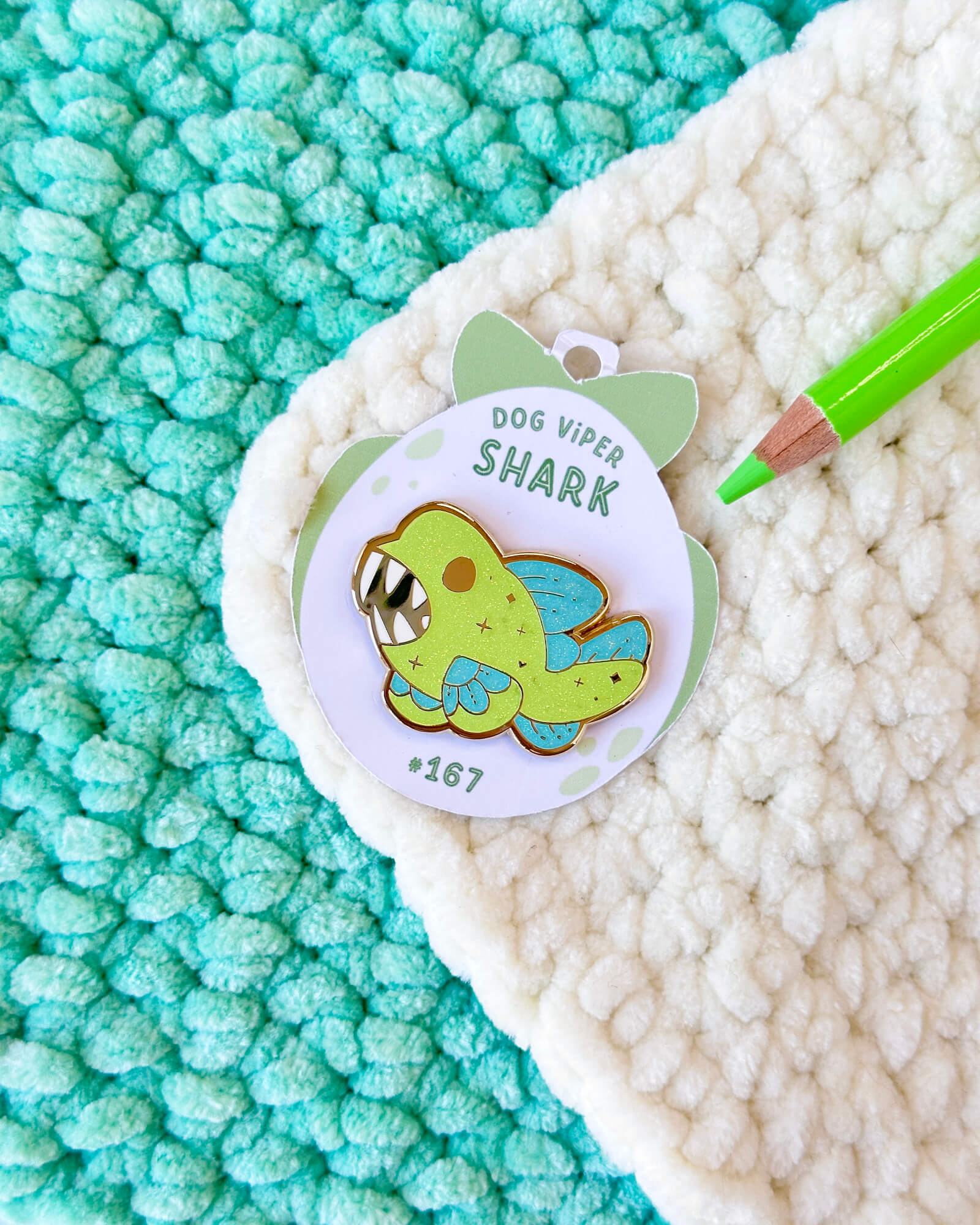 A cute enamel pin featuring the dog viper shark! This cozy enamel pin is part of my Critumi wildlife series and makes a wonderful gift for both pin badge and animal lovers. Made with gold plated metal, iridescent glitter and hard enamel.