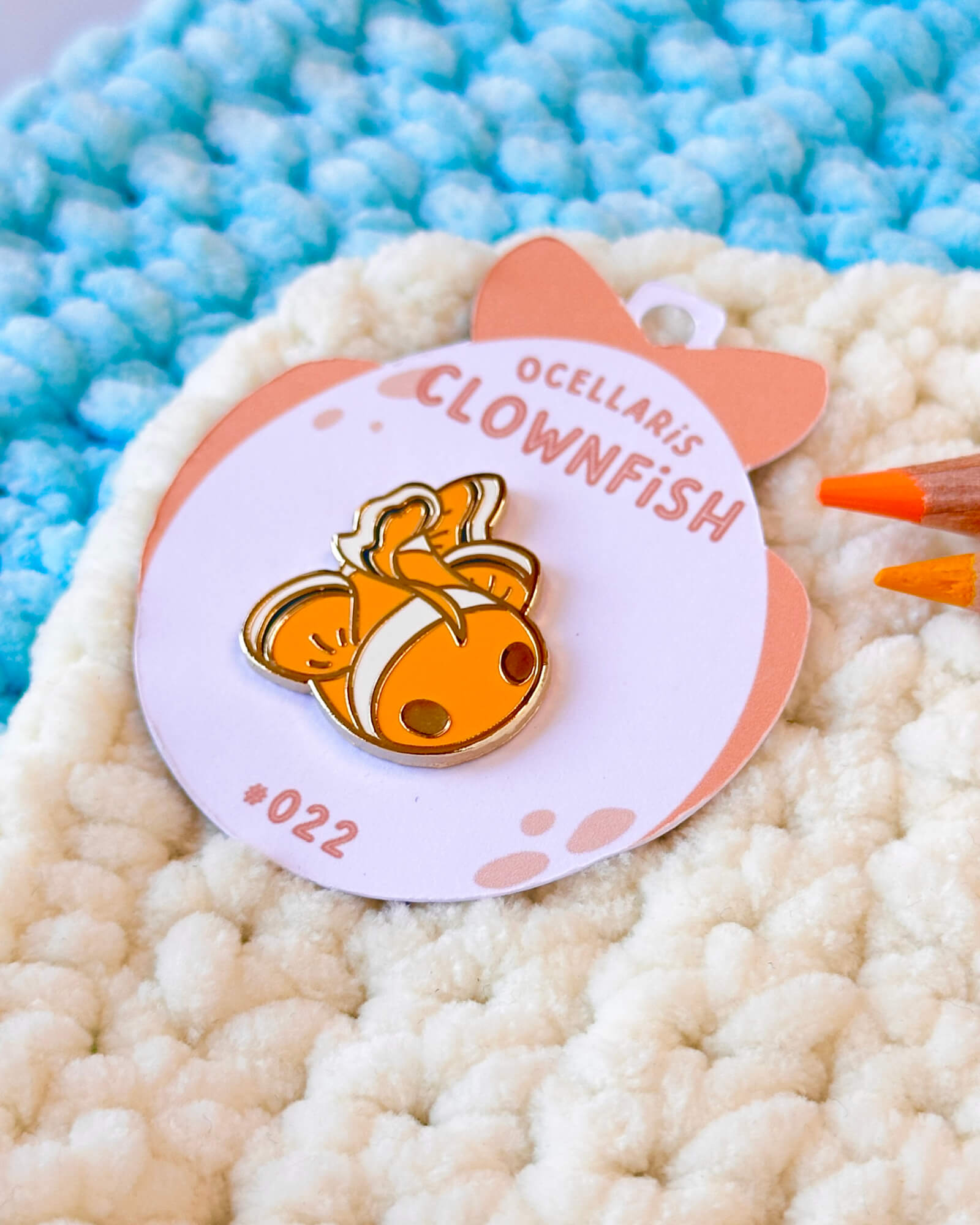 A cute enamel pin featuring the fluttery clownfish! This cozy enamel pin is part of my Critumi wildlife series and makes a wonderful gift for both pin badge and animal lovers. Made with gold plated metal and hard enamel.