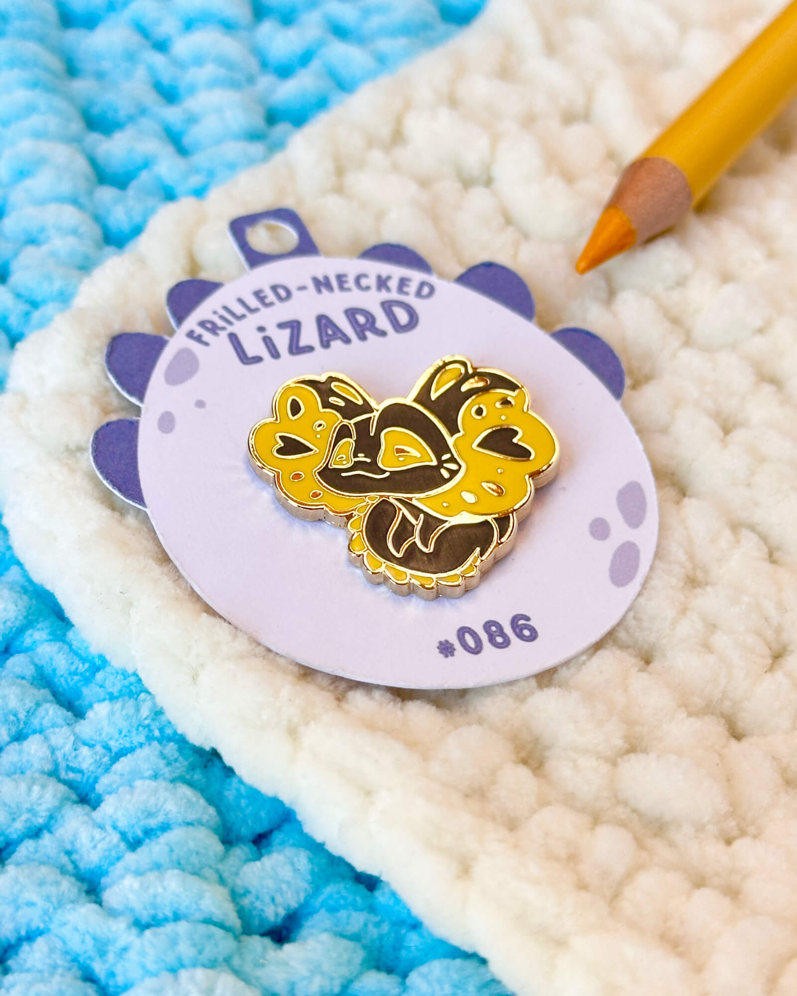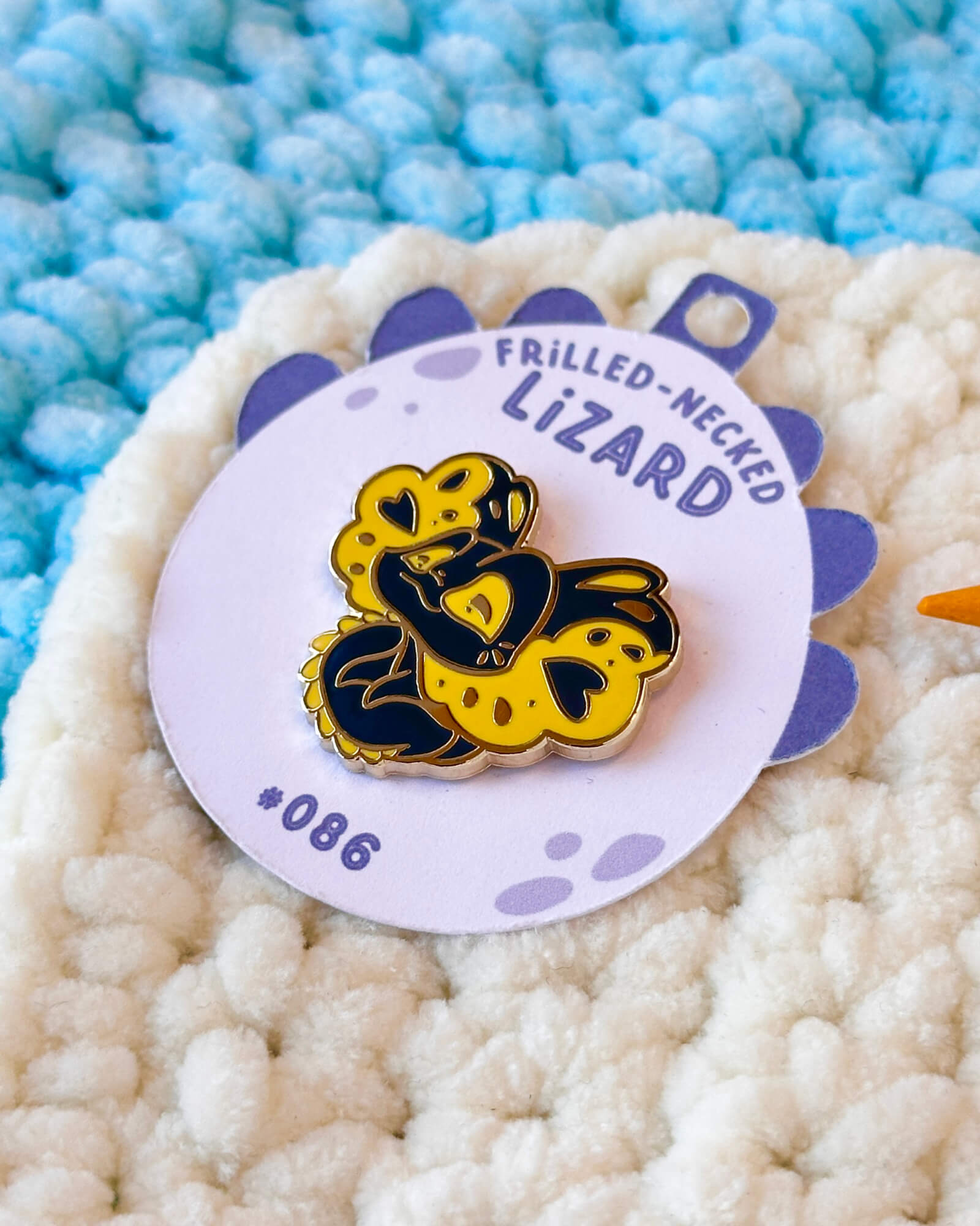 A cute enamel pin featuring the frilled-necked lizzard! This cozy enamel pin is part of my Critumi wildlife series and makes a wonderful gift for both pin badge and animal lovers. Made with gold plated metal and hard enamel.