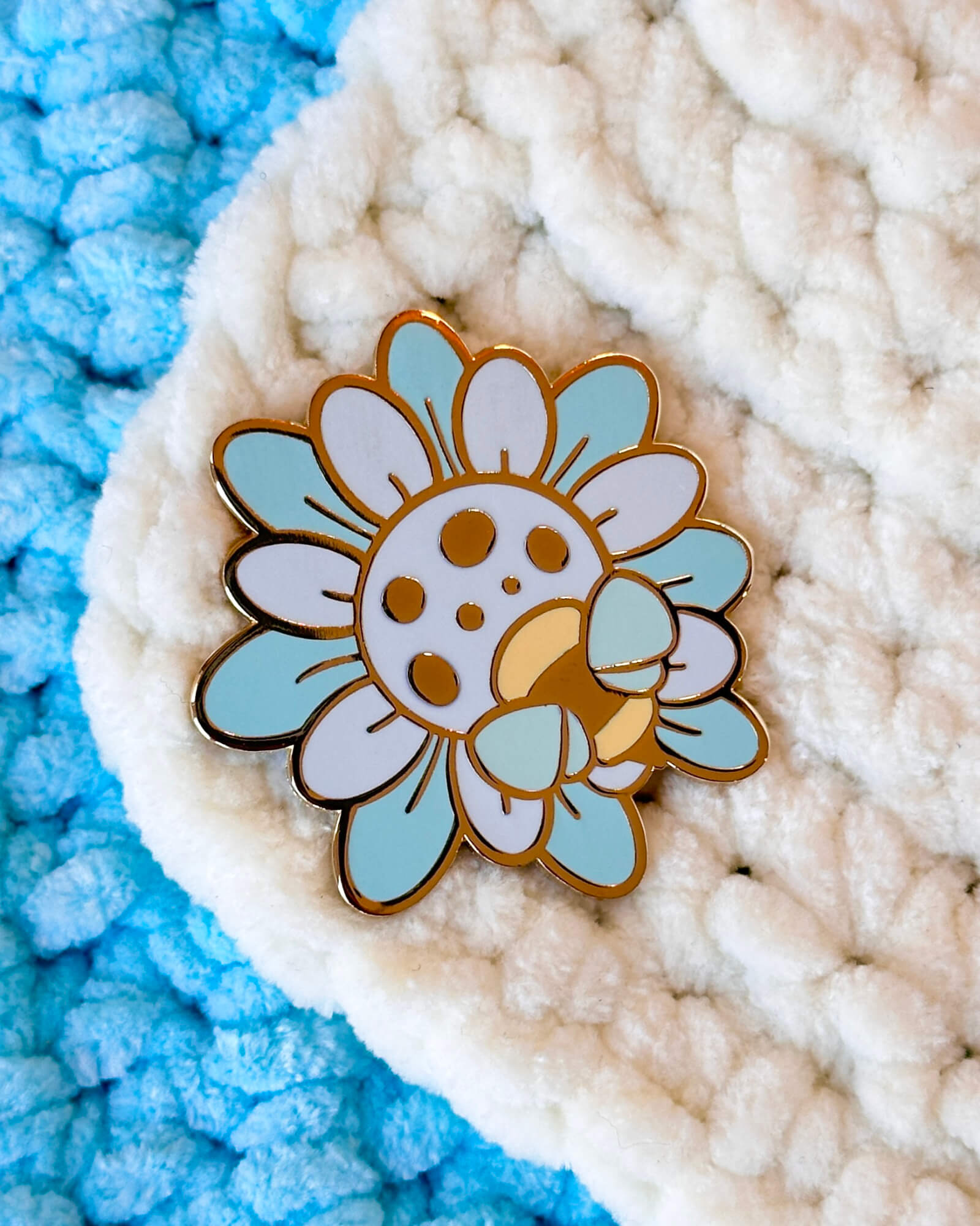A lovely enamel pin featuring a frosty bumblebee wildflower.