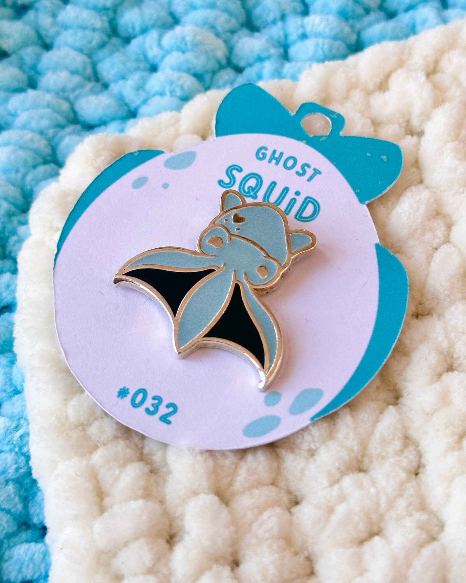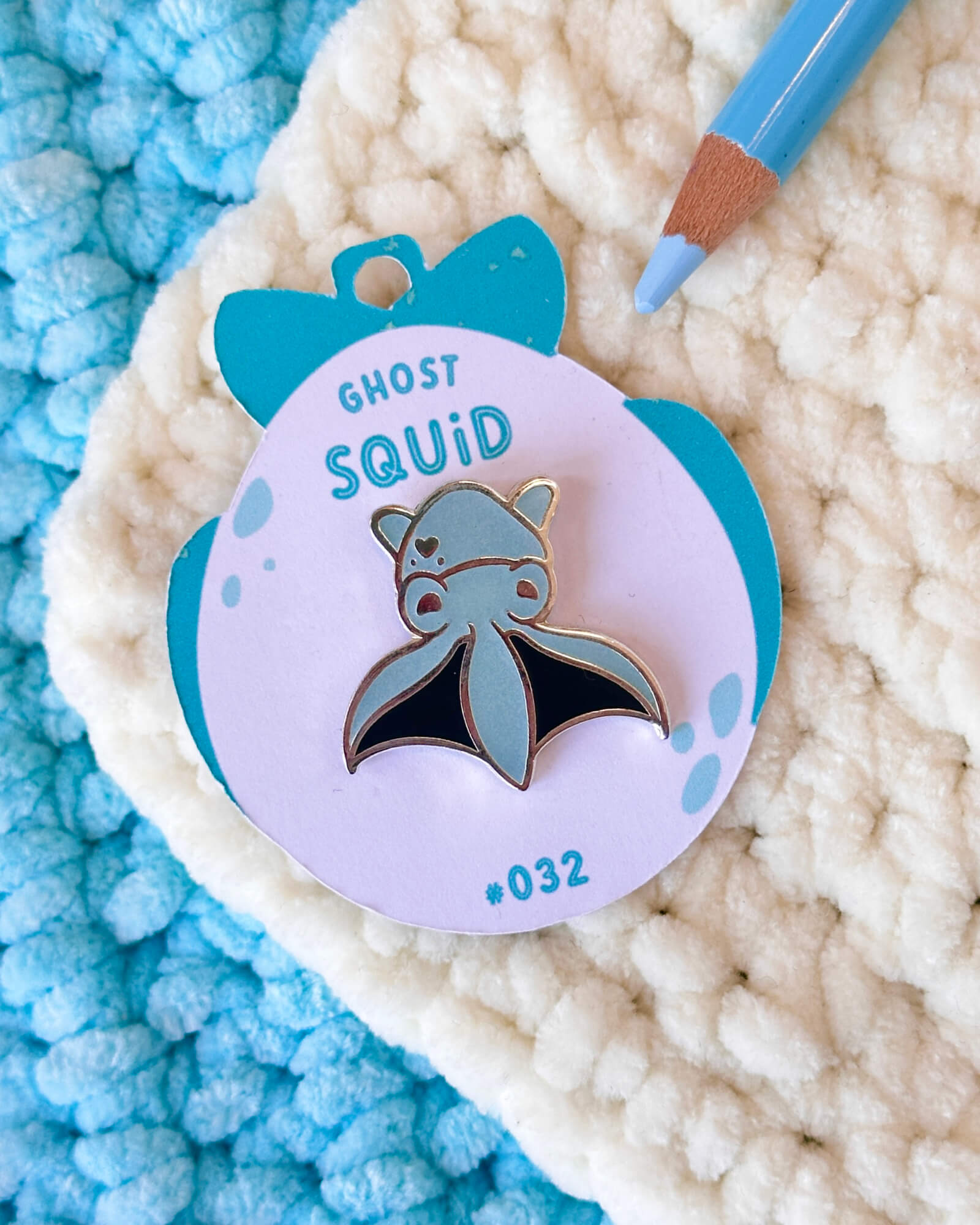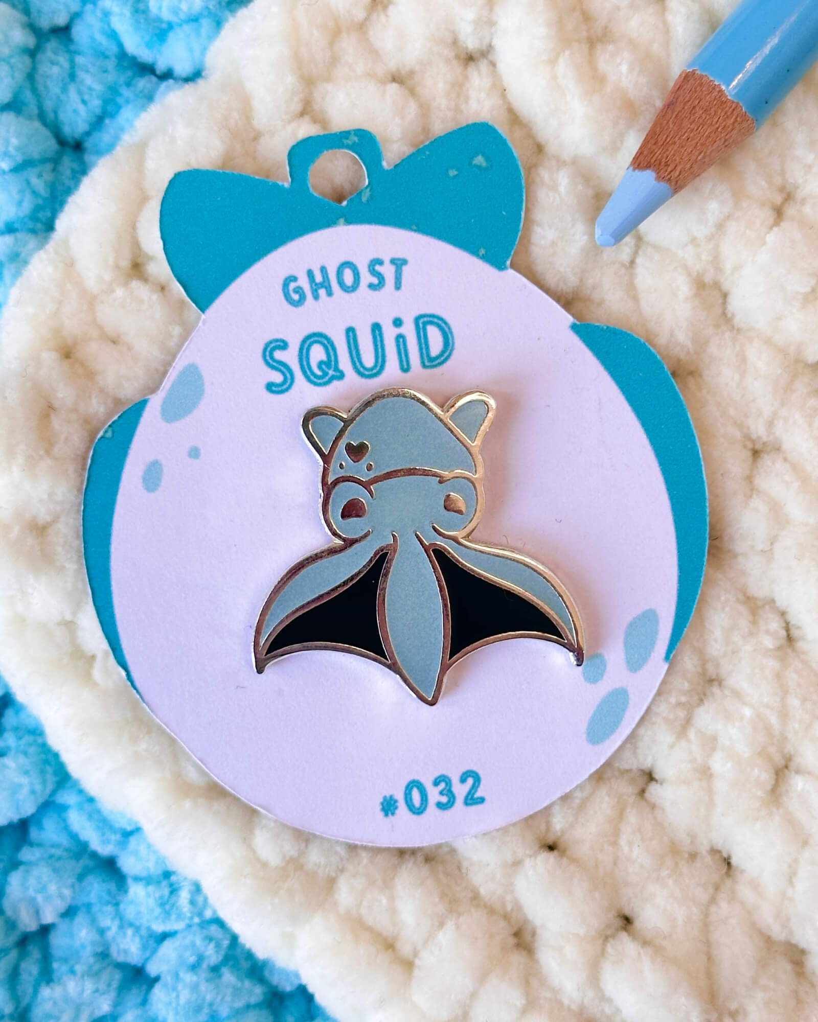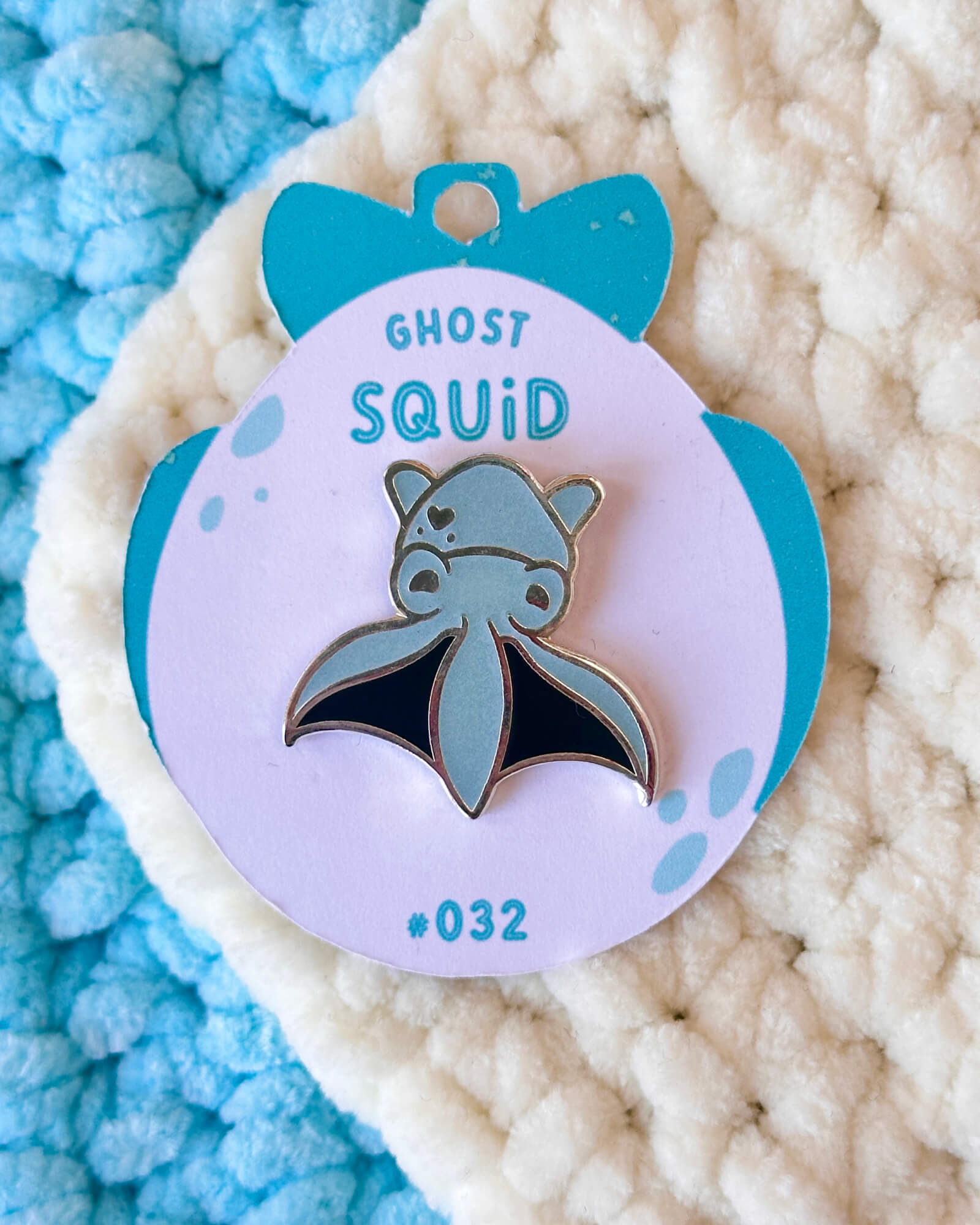 A cute enamel pin featuring the ghost squid! This cozy enamel pin is part of my Critumi wildlife series and makes a wonderful gift for both pin badge and animal lovers. Made with silver plated metal, glow powder and hard enamel.
