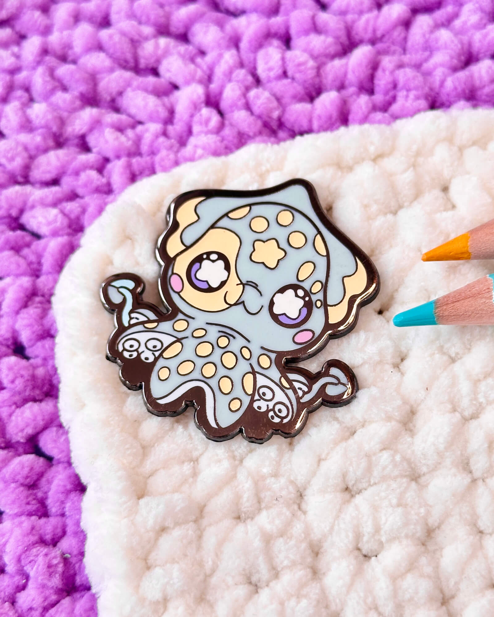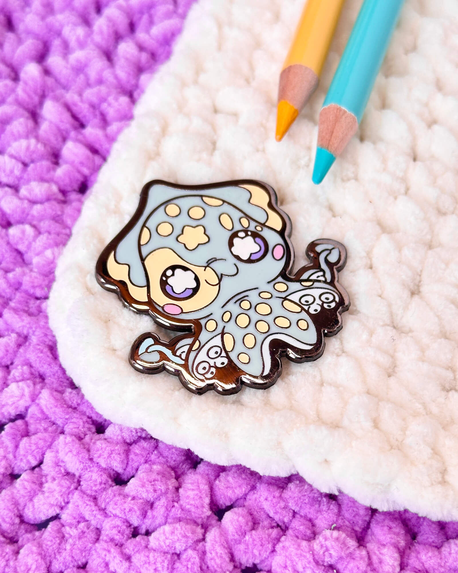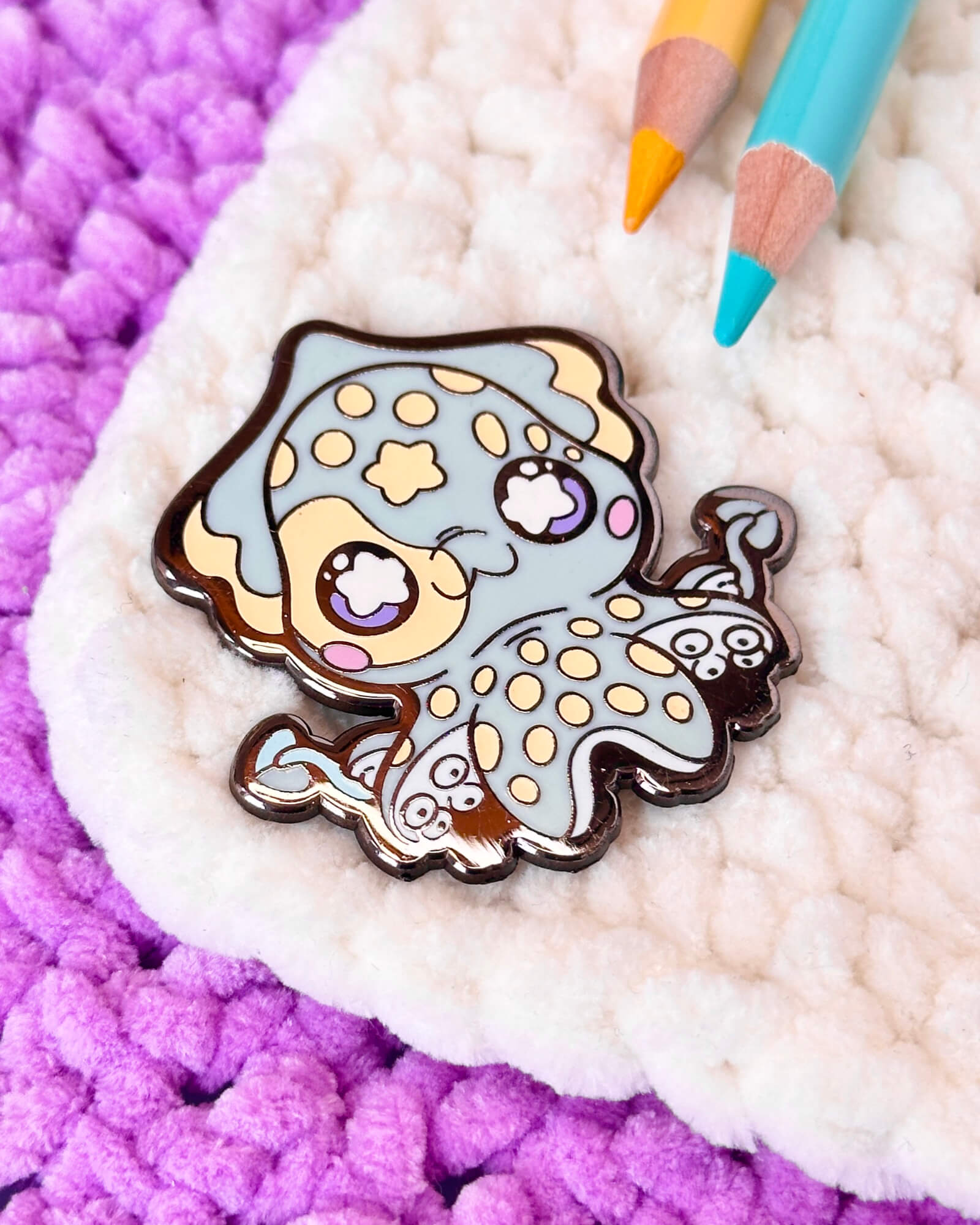 A cosmic enamel pin featuring the Japanese Firefly Squid.