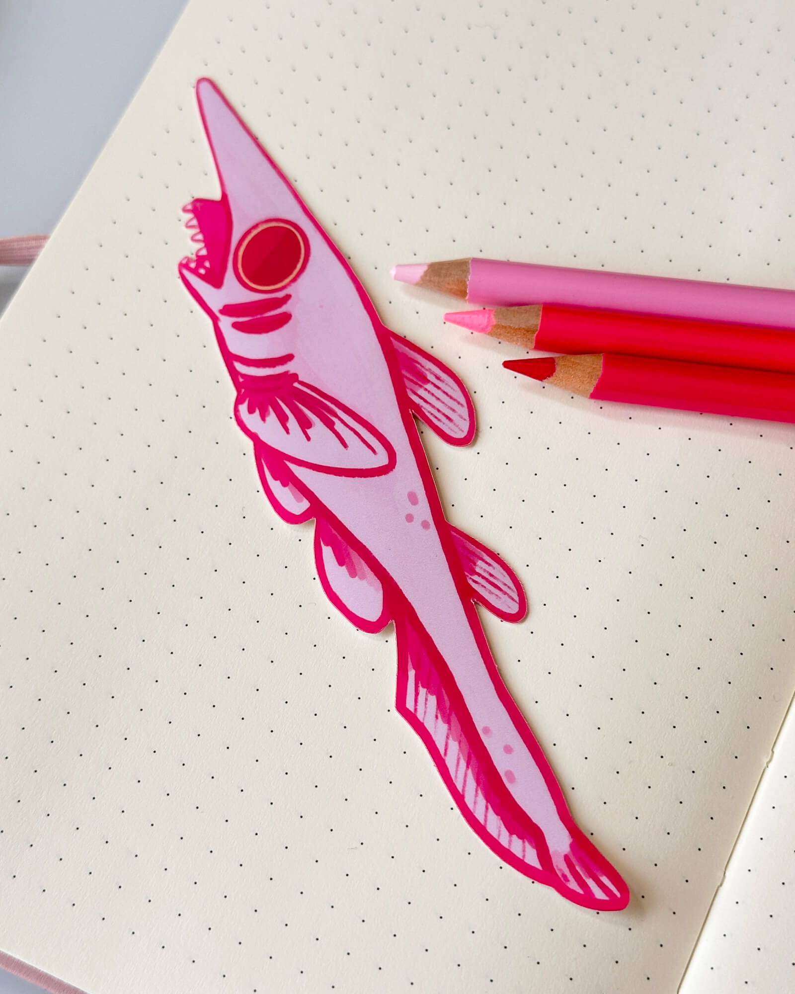 A lovely long boiii sticker featuring the Goblin Shark Illustrated by Evy Benita. This sticker is approximately 15cm (6 inches) long.