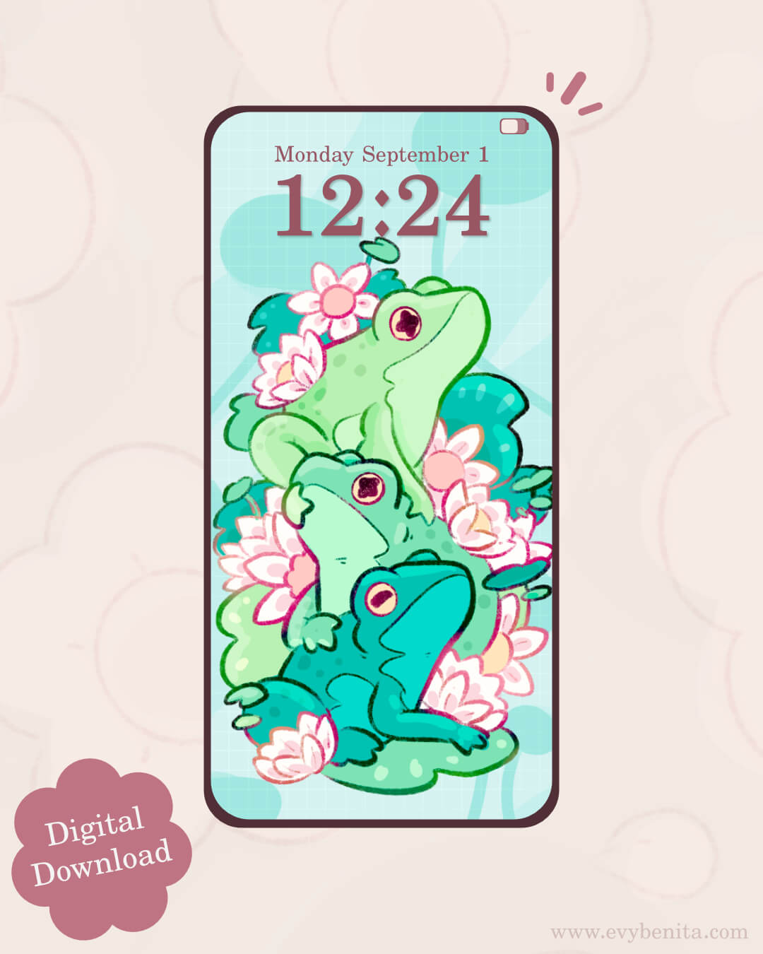 Introducing a lovely wallpaper pack featuring Green Frog Stack! Illustrated by Evy Benita, this wallpaper pack is perfect for personalising your phone screen.