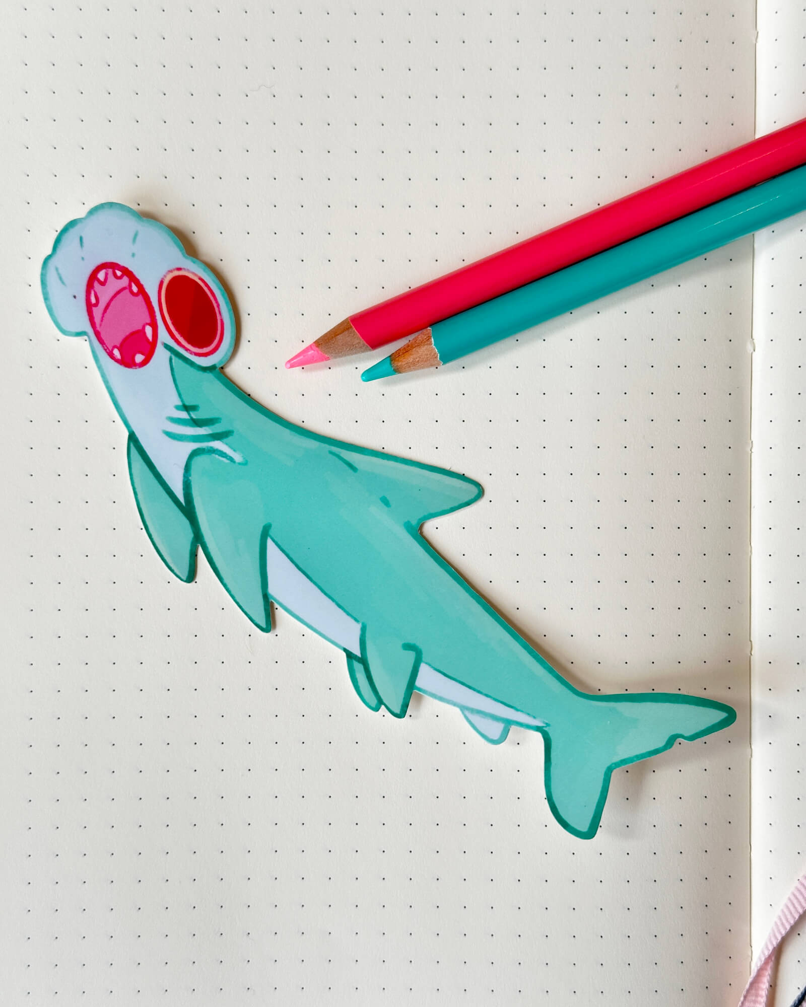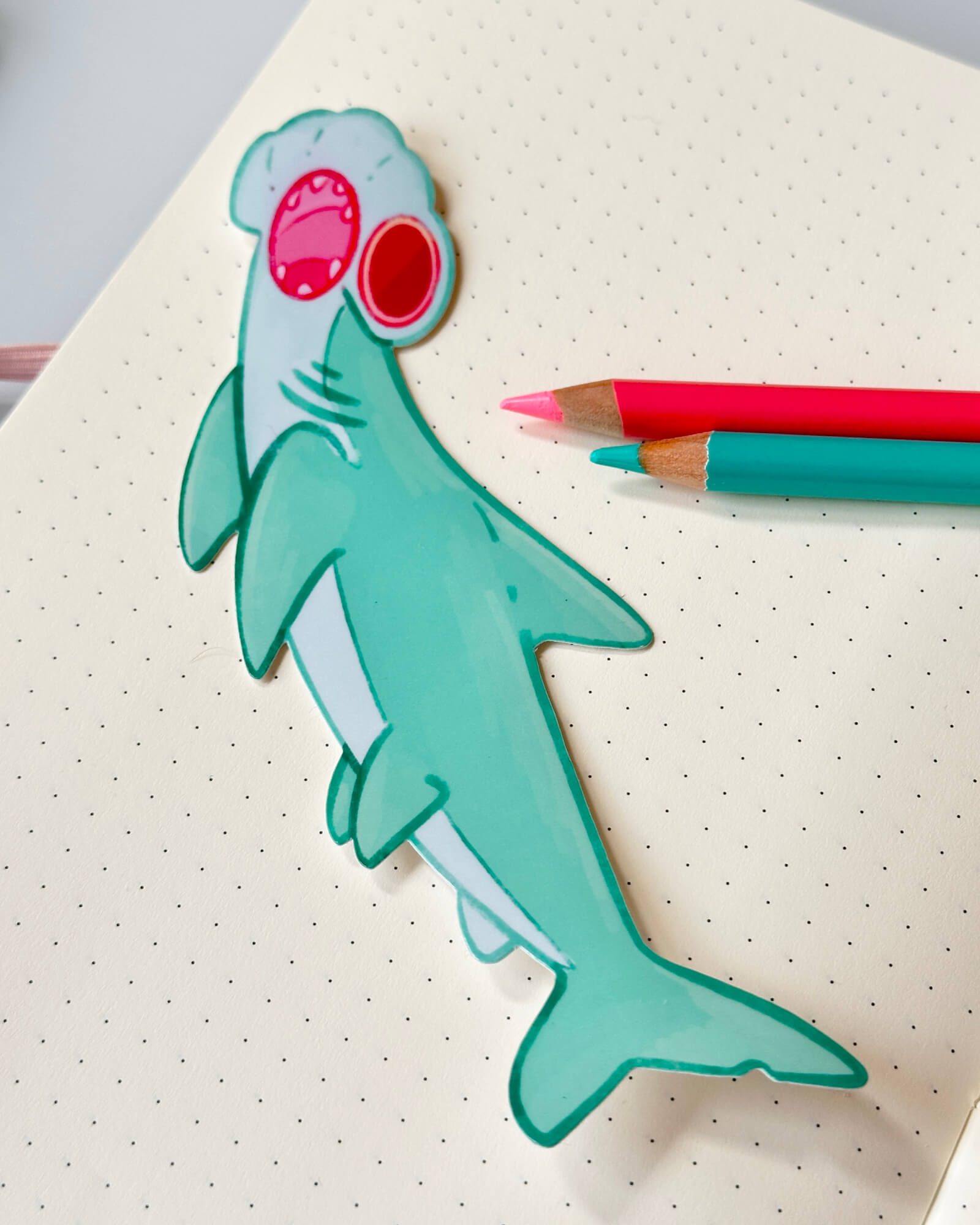 A lovely long boiii sticker featuring the Hammerhead Shark Illustrated by Evy Benita. This sticker is approximately 15cm (6 inches) long.