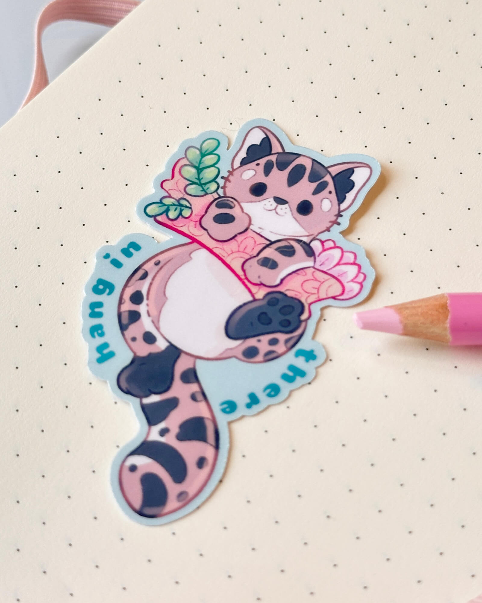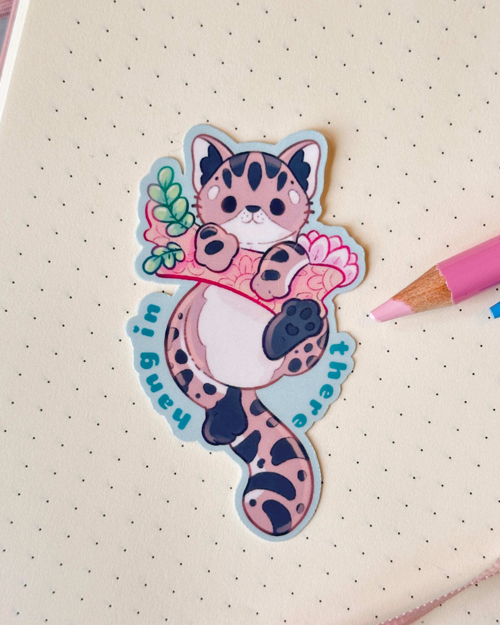 A super cute water-resistant die-cut sticker featuring the Hang in there fishing Cat. Illustrated by Evy Benita. This sticker is approximately two inches on the longest side.