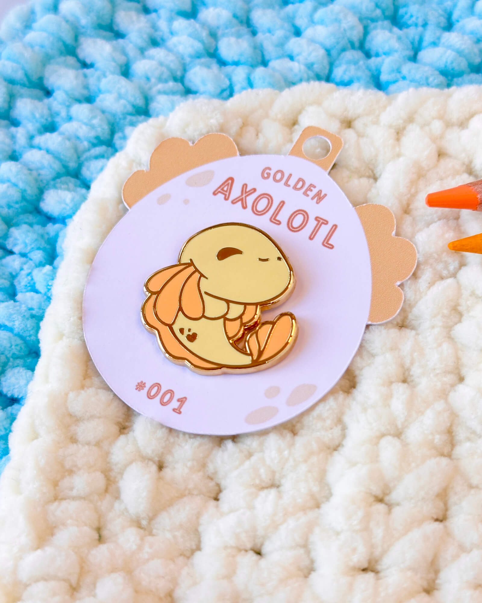 A cute enamel pin featuring a happy golden axolotl.