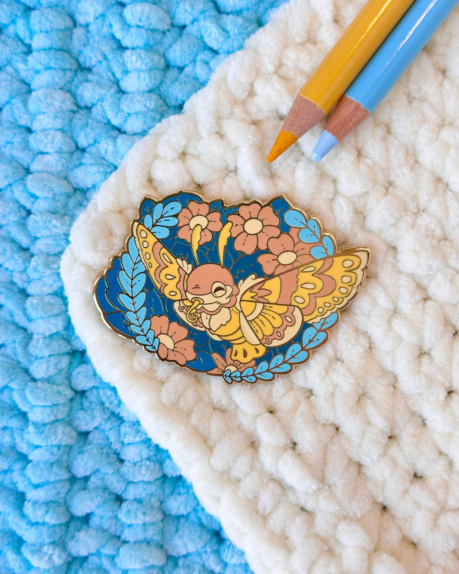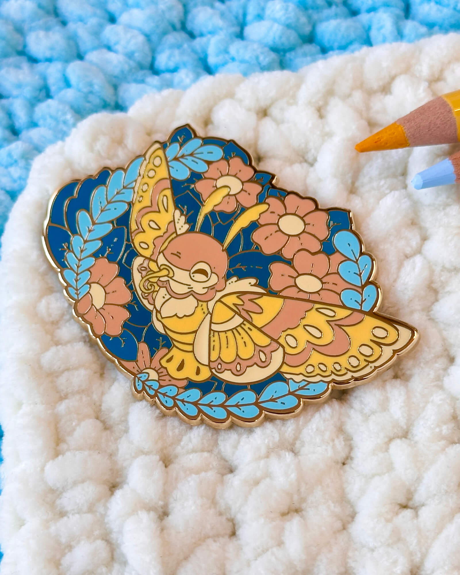 A lovely enamel pin featuring a hummingbird hawk moth.