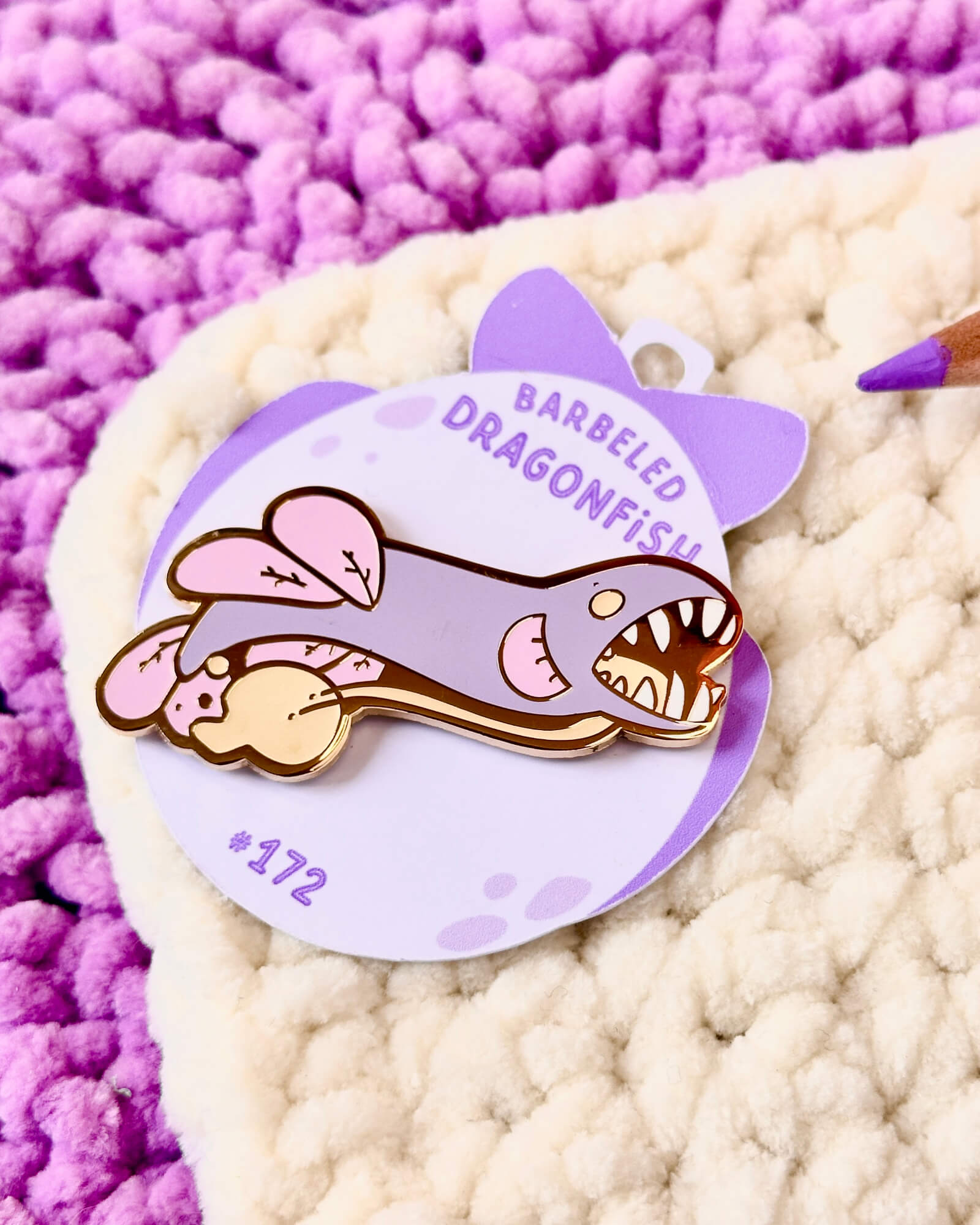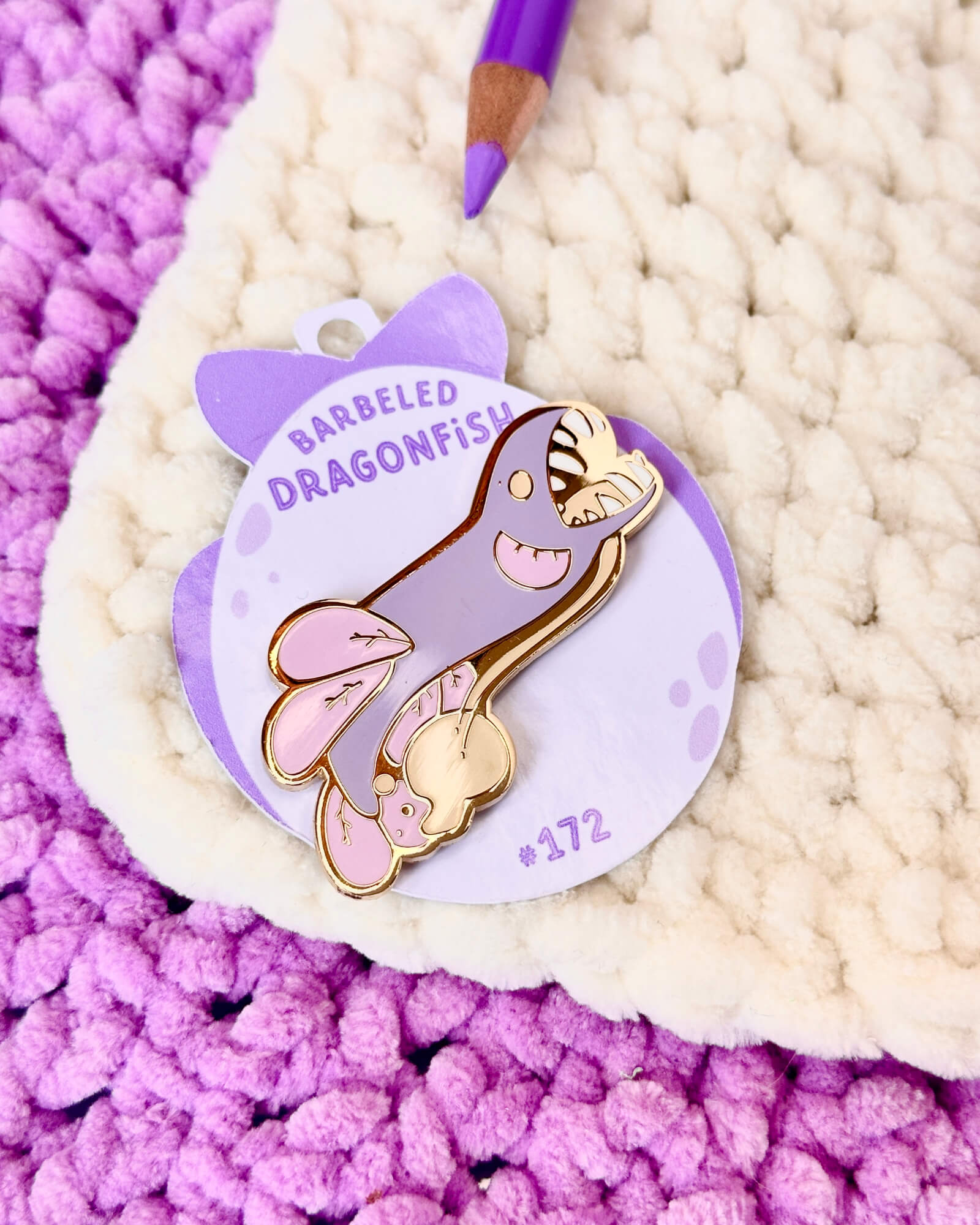 A cute enamel pin featuring a lilac barbeled dragonfish.