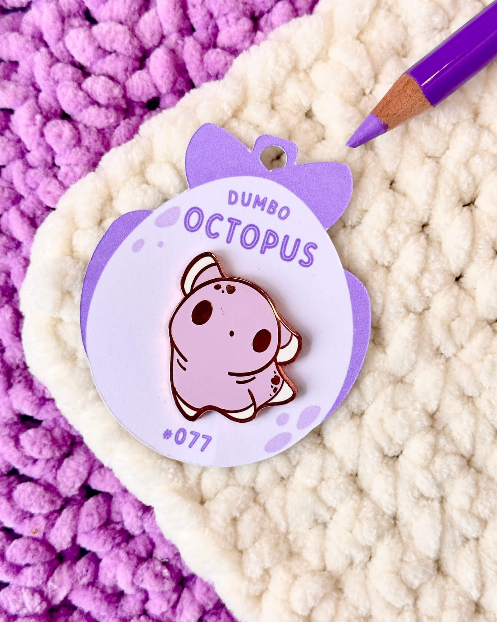 A cute enamel pin featuring the lilac dumbo octopus! This cozy enamel pin is part of my Critumi wildlife series and makes a wonderful gift for both pin badge and animal lovers. Made with rose gold plated metal and hard enamel.