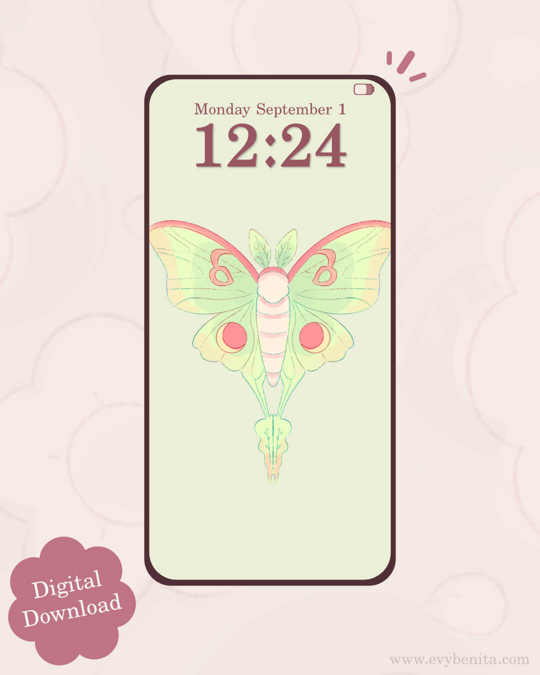 Introducing a lovely wallpaper pack featuring Luna Moth! Illustrated by Evy Benita, this wallpaper pack is perfect for personalising your phone screen.