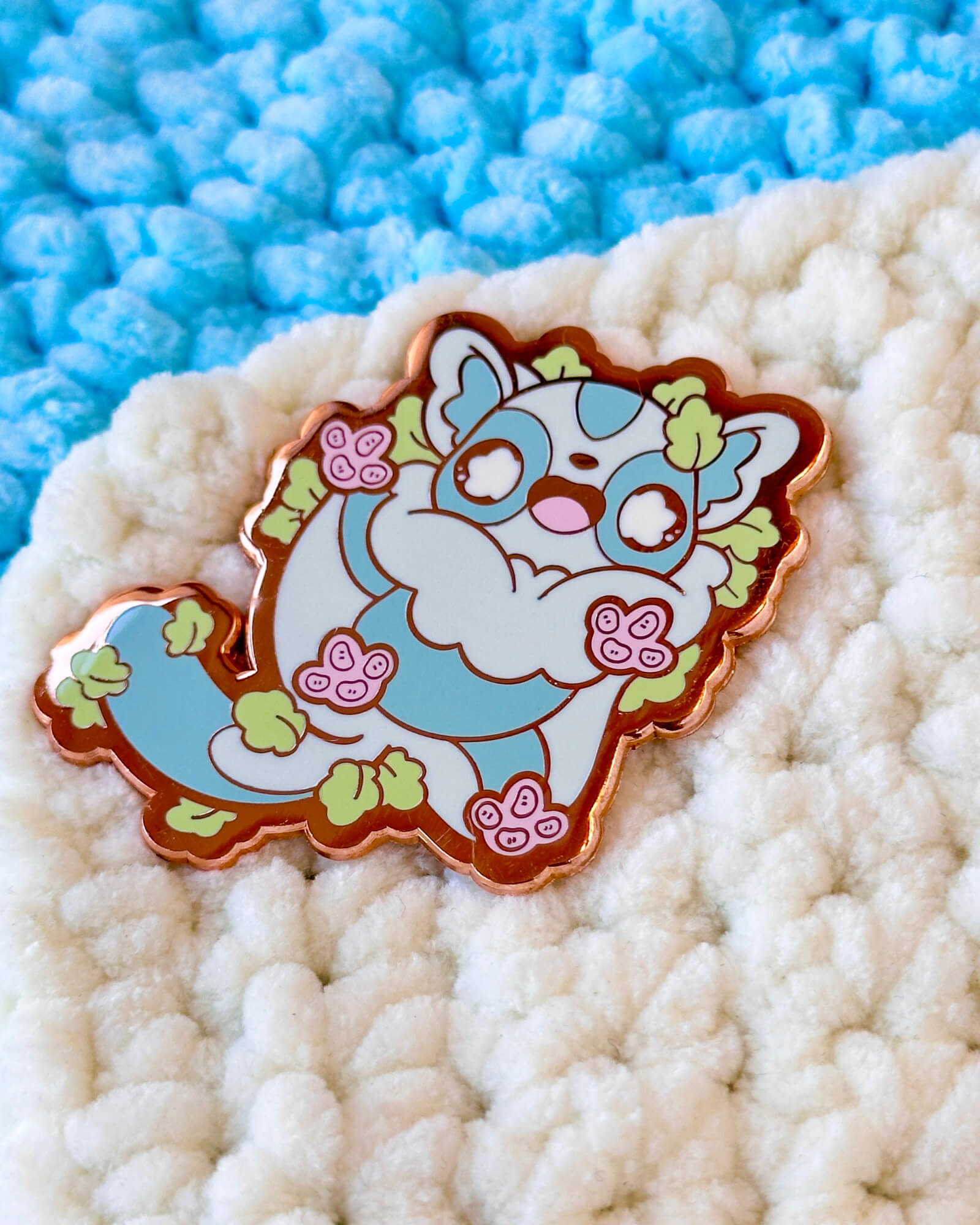 A charming enamel pin featuring the Mahogany Sugar Glider.