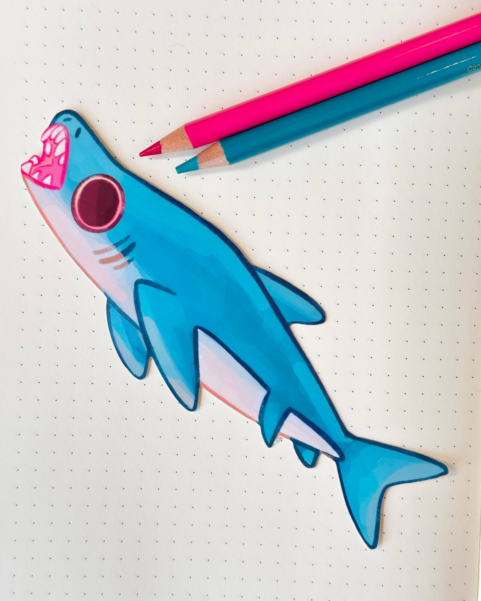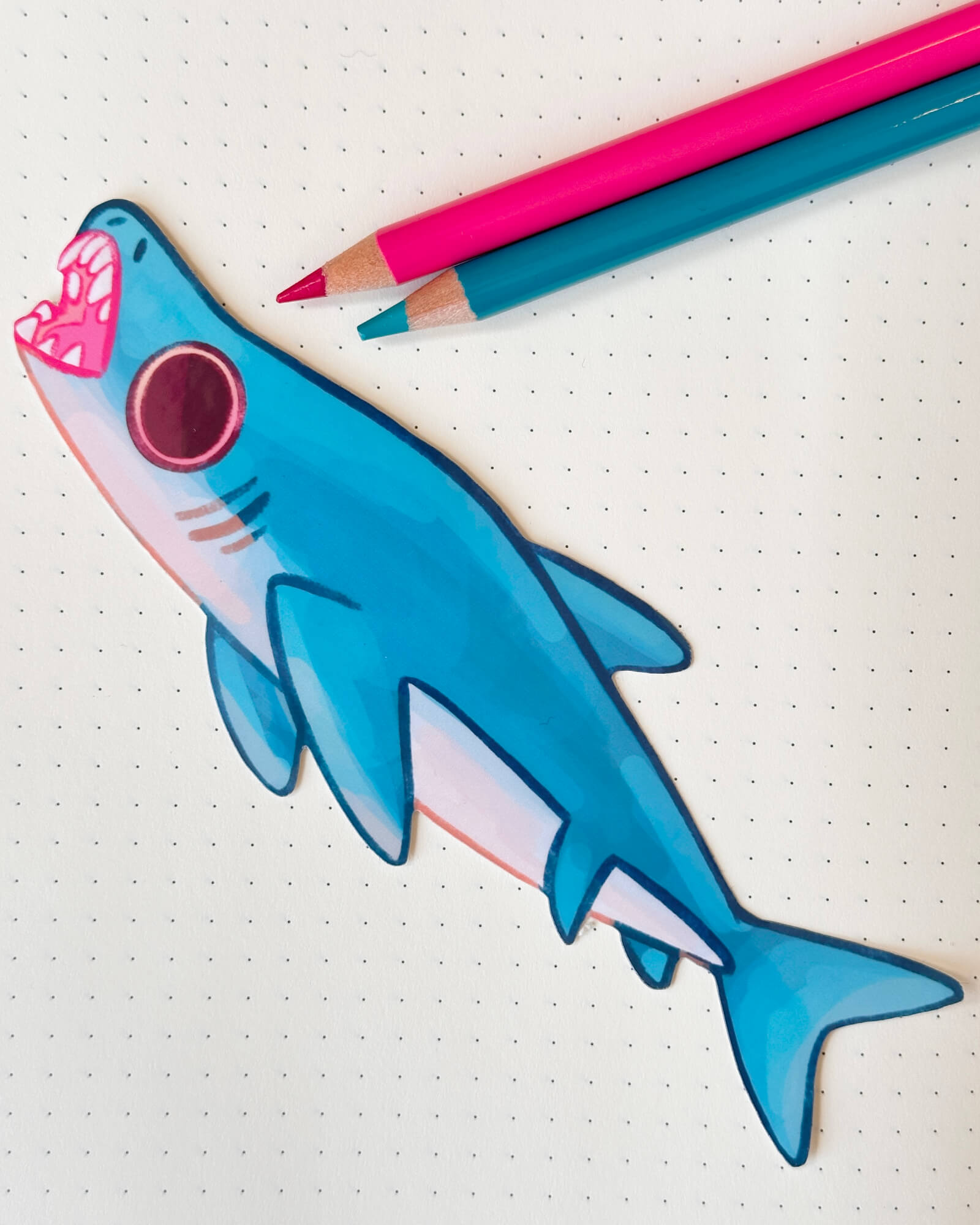 A lovely long boiii sticker featuring the Megalodon Shark Illustrated by Evy Benita. This sticker is approximately 15cm (6 inches) long.