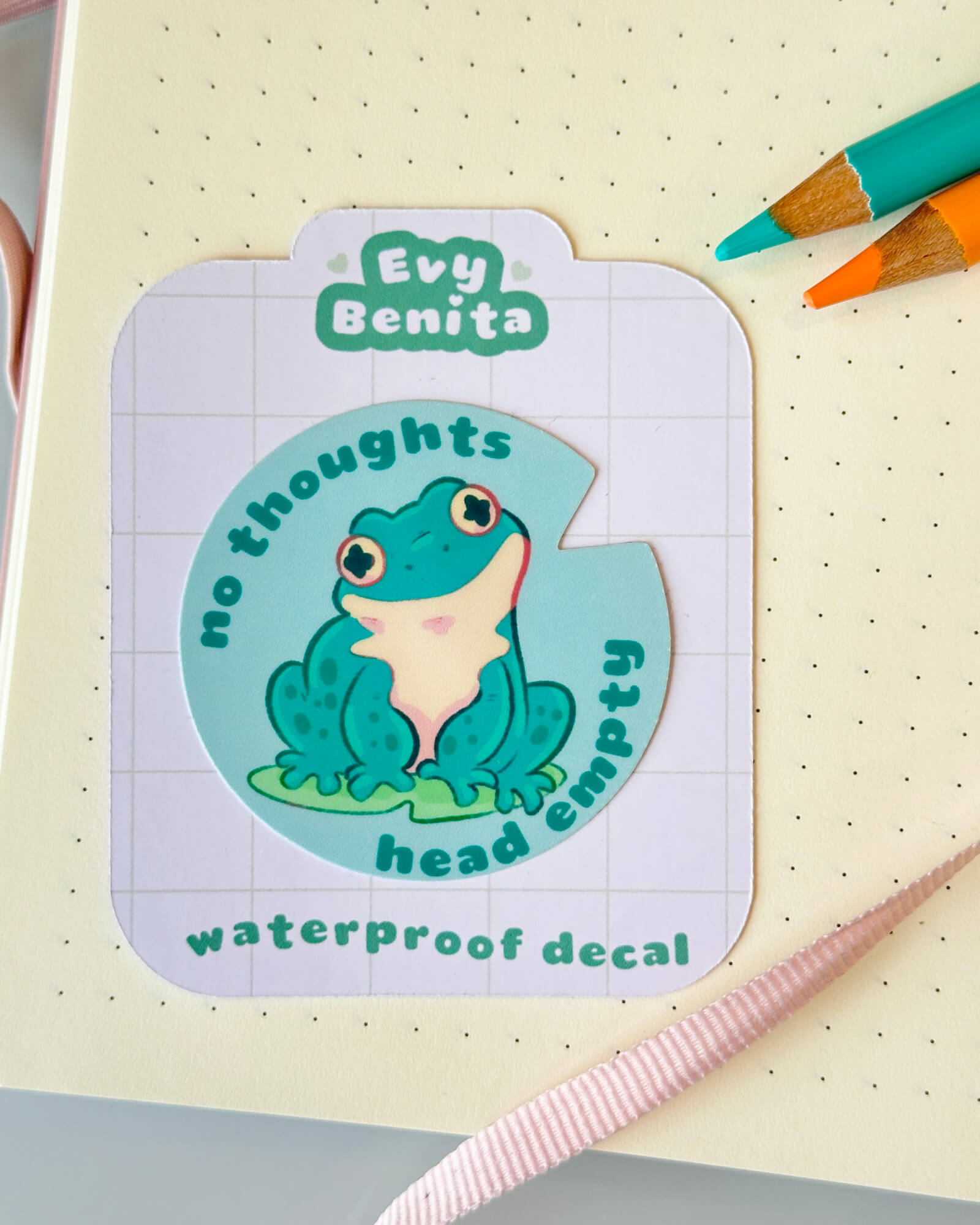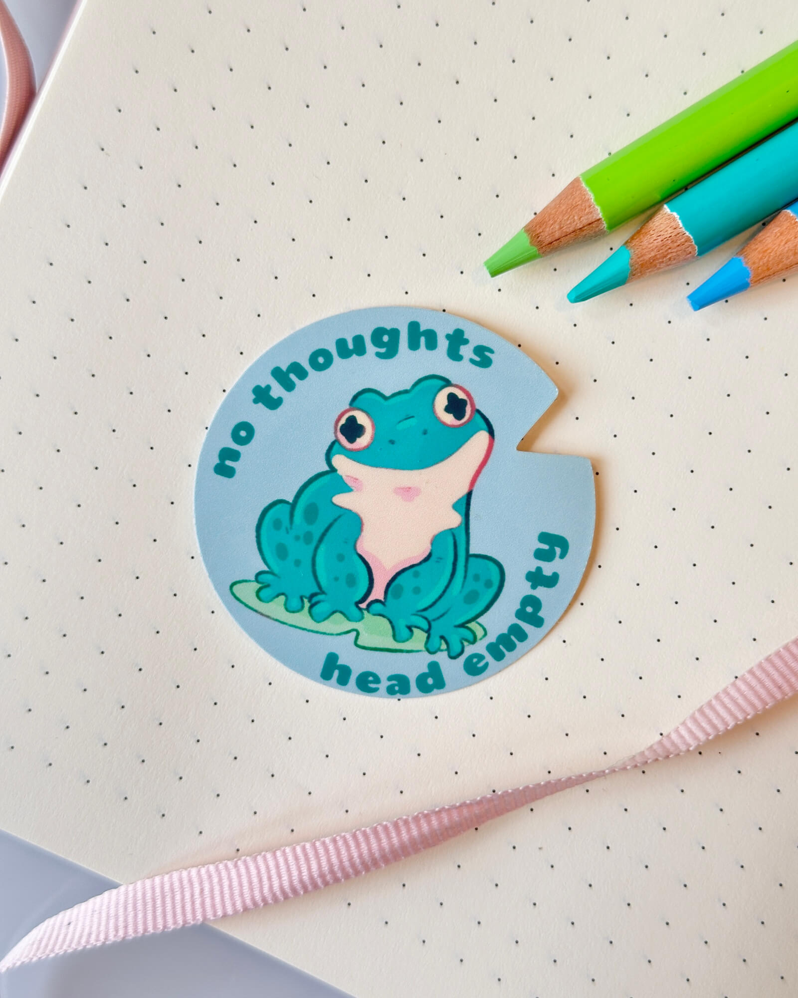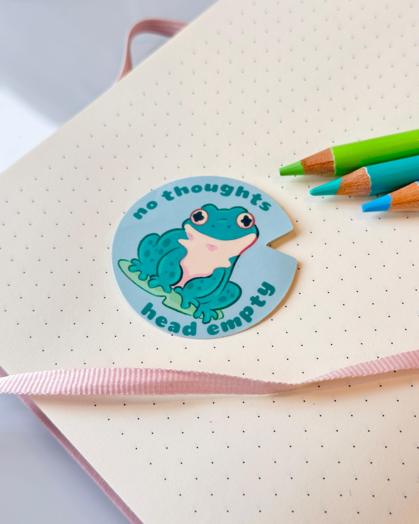 A super cute water-resistant die-cut sticker featuring the No Thoughts Head Empty Toad