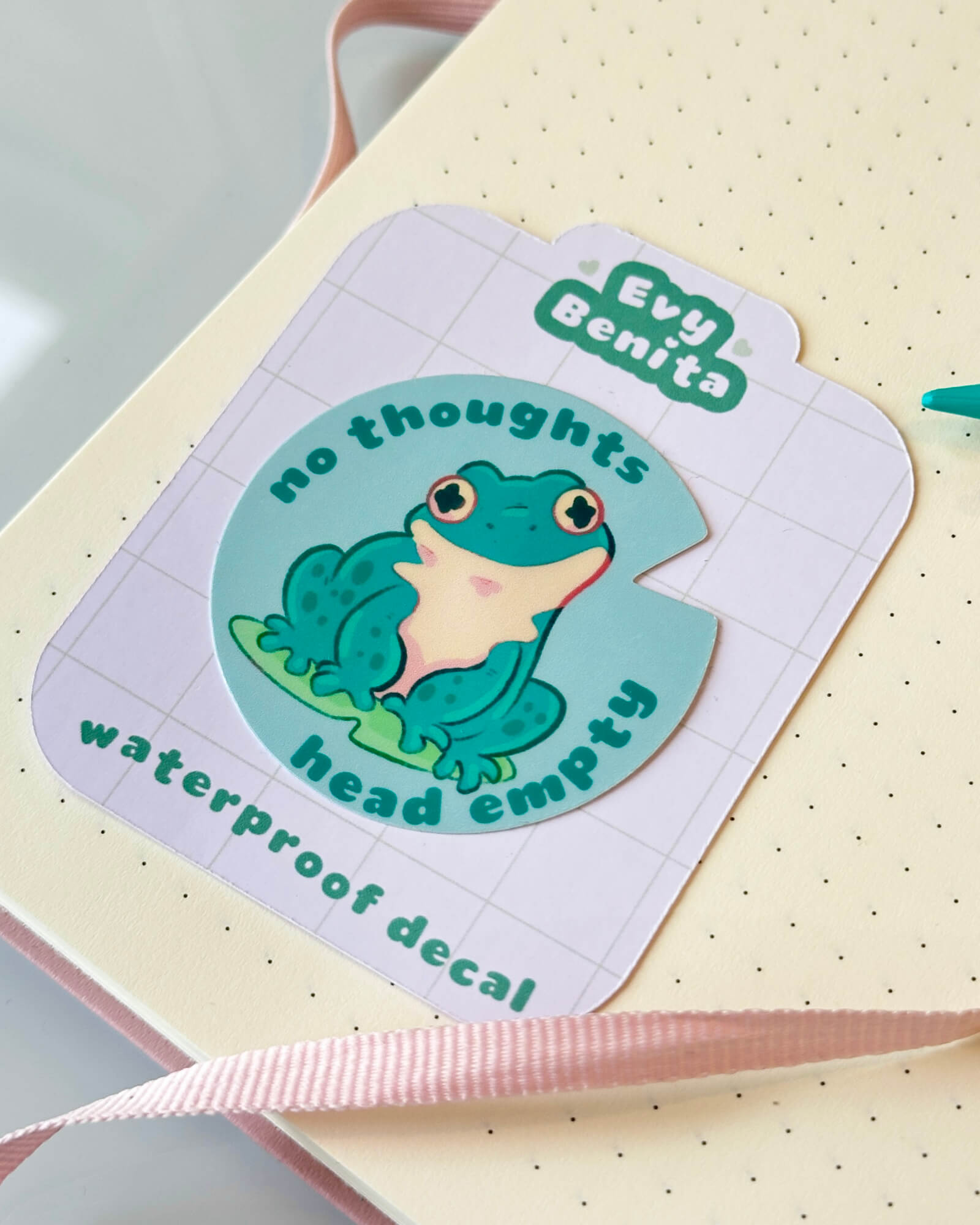 A super cute water-resistant die-cut sticker featuring the No Thoughts Head Empty Toad. Illustrated by Evy Benita. This sticker is approximately two inches on the longest side.