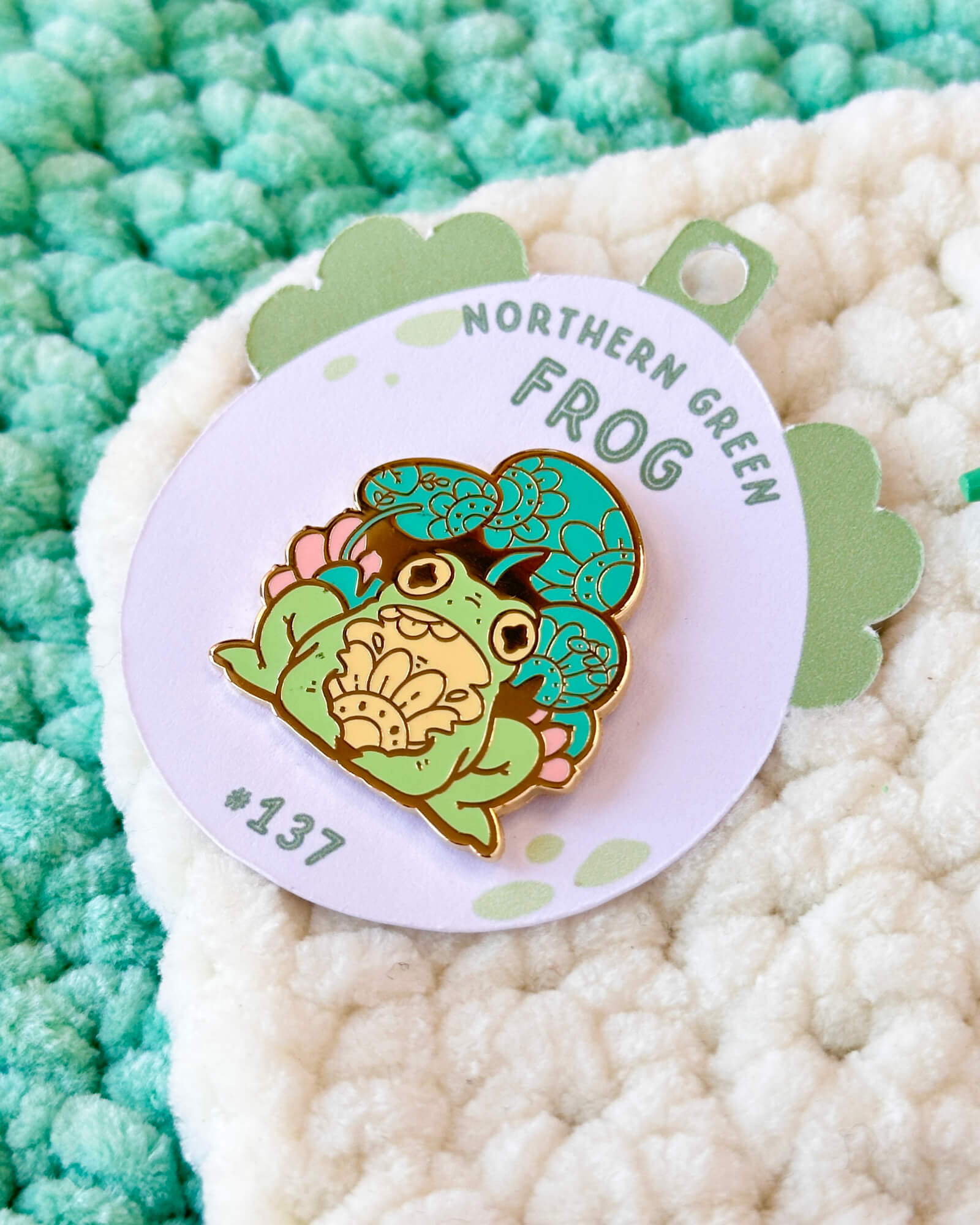 A cute enamel pin featuring the northern green frog! This cozy enamel pin is part of my Critumi wildlife series and makes a wonderful gift for both pin badge and animal lovers. Made with gold plated metal and hard enamel.