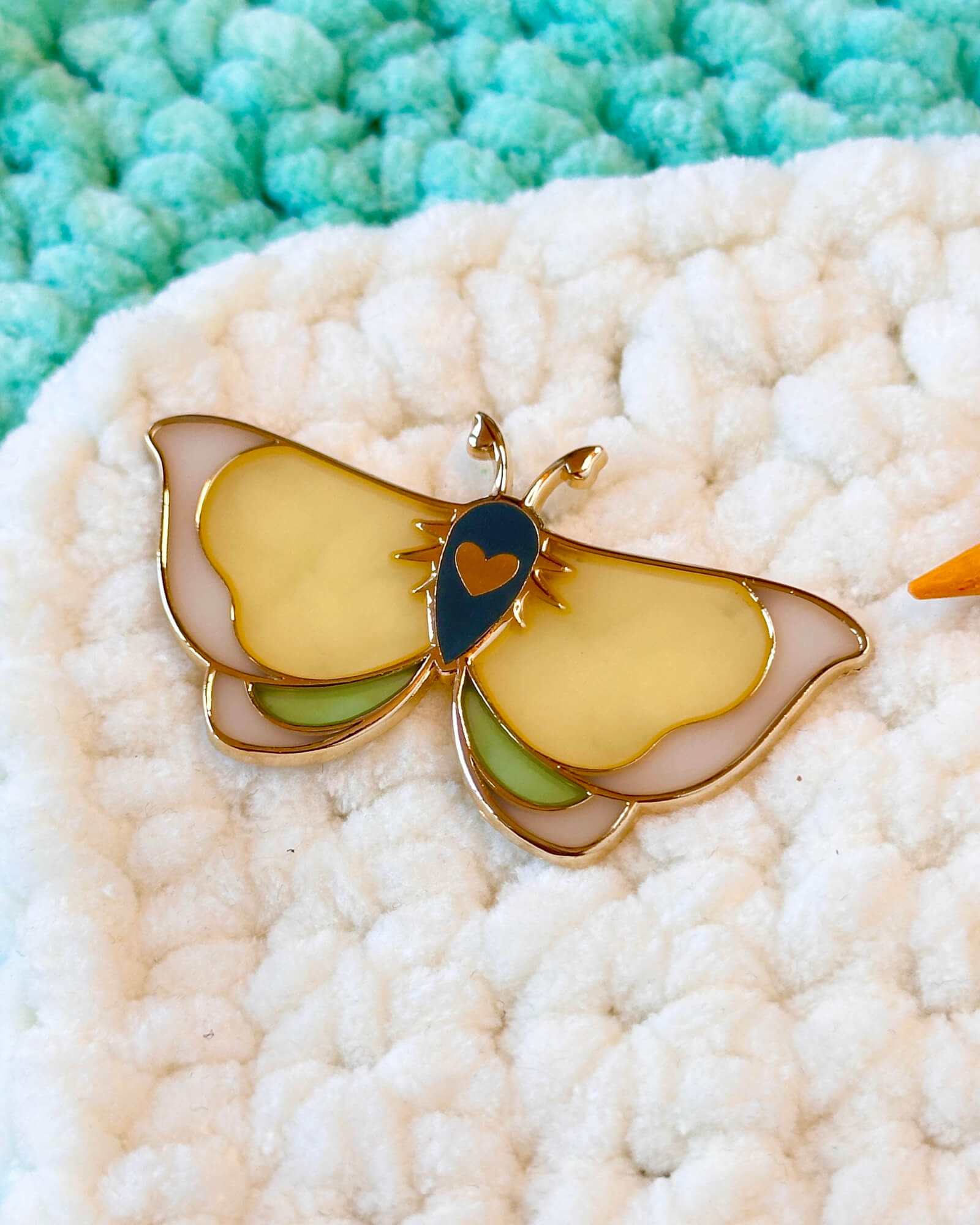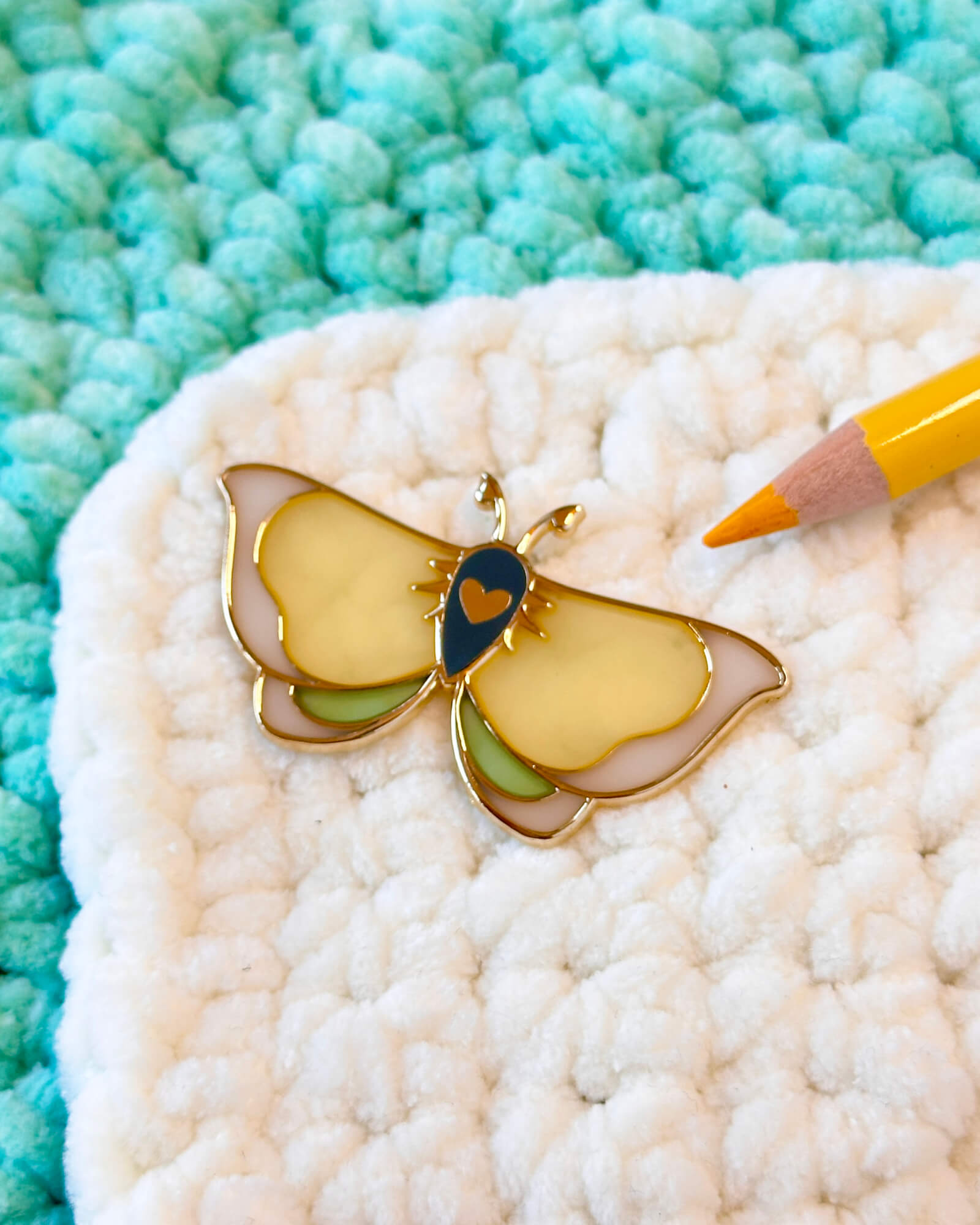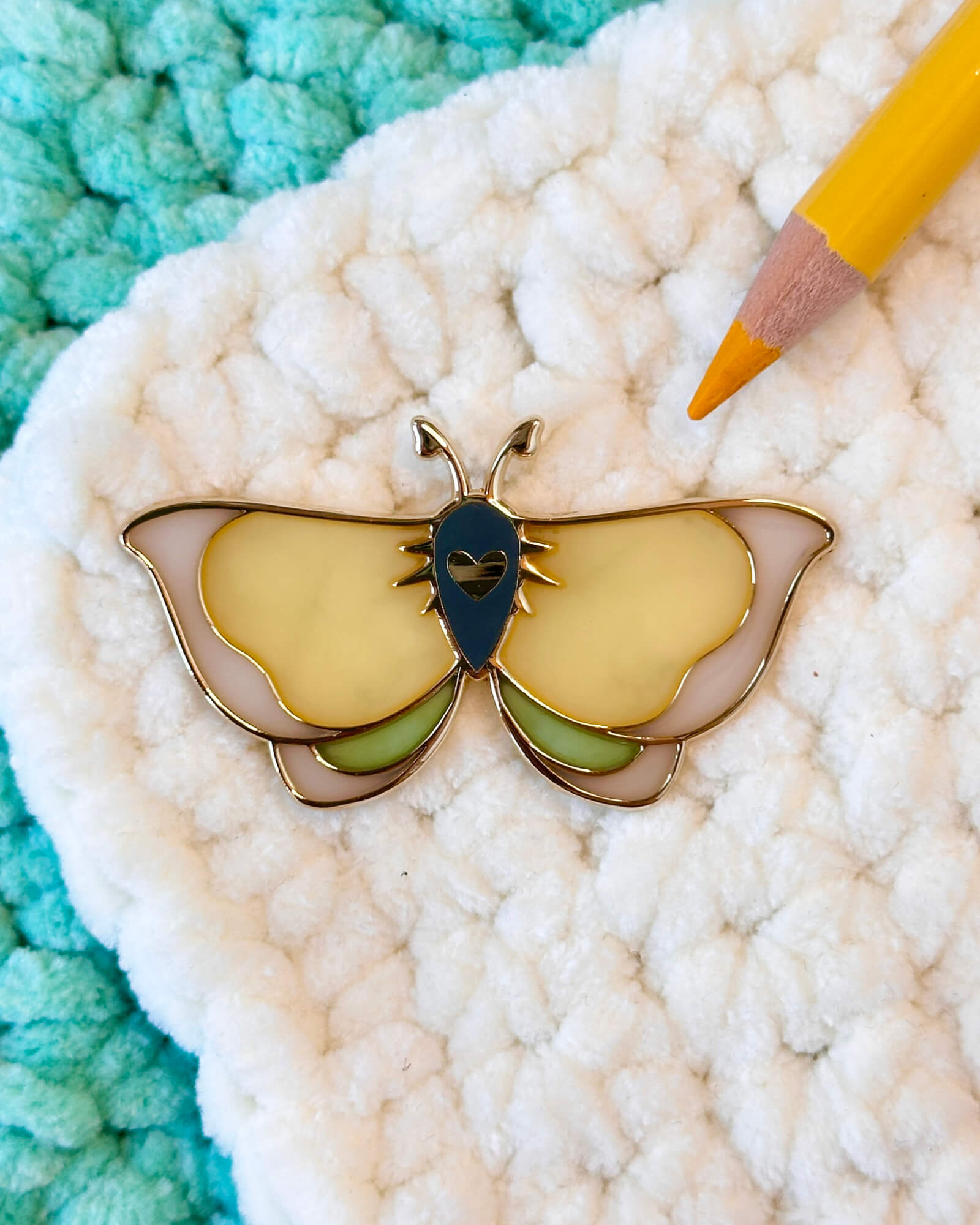 A lovely enamel pin featuring an ornithogalum suncatcher moth.