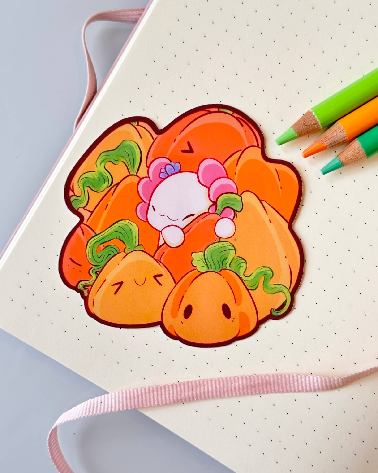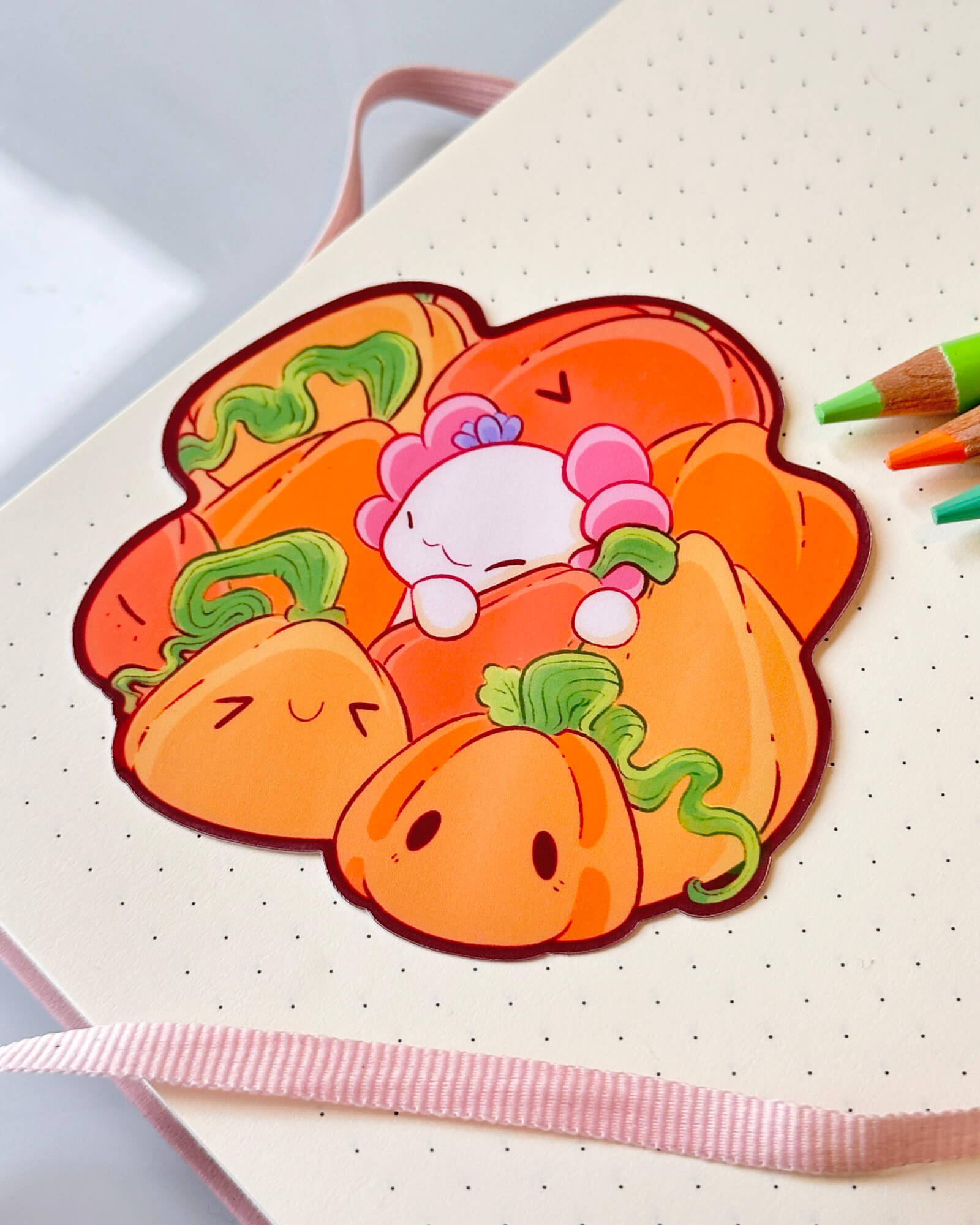 A super cute water-resistant die-cut sticker featuring the Pumpkin Patch Lotl. Illustrated by Evy Benita. This sticker is approximately two inches on the longest side.