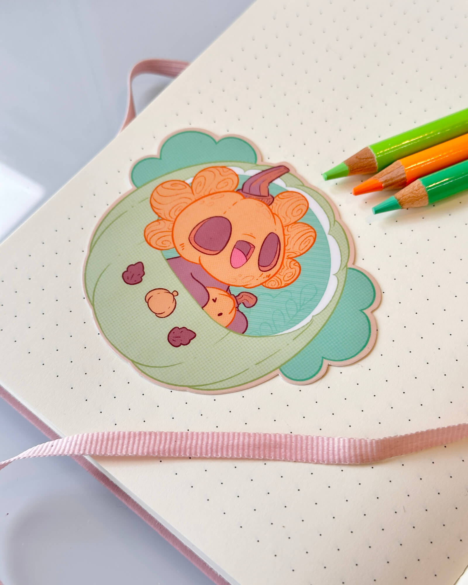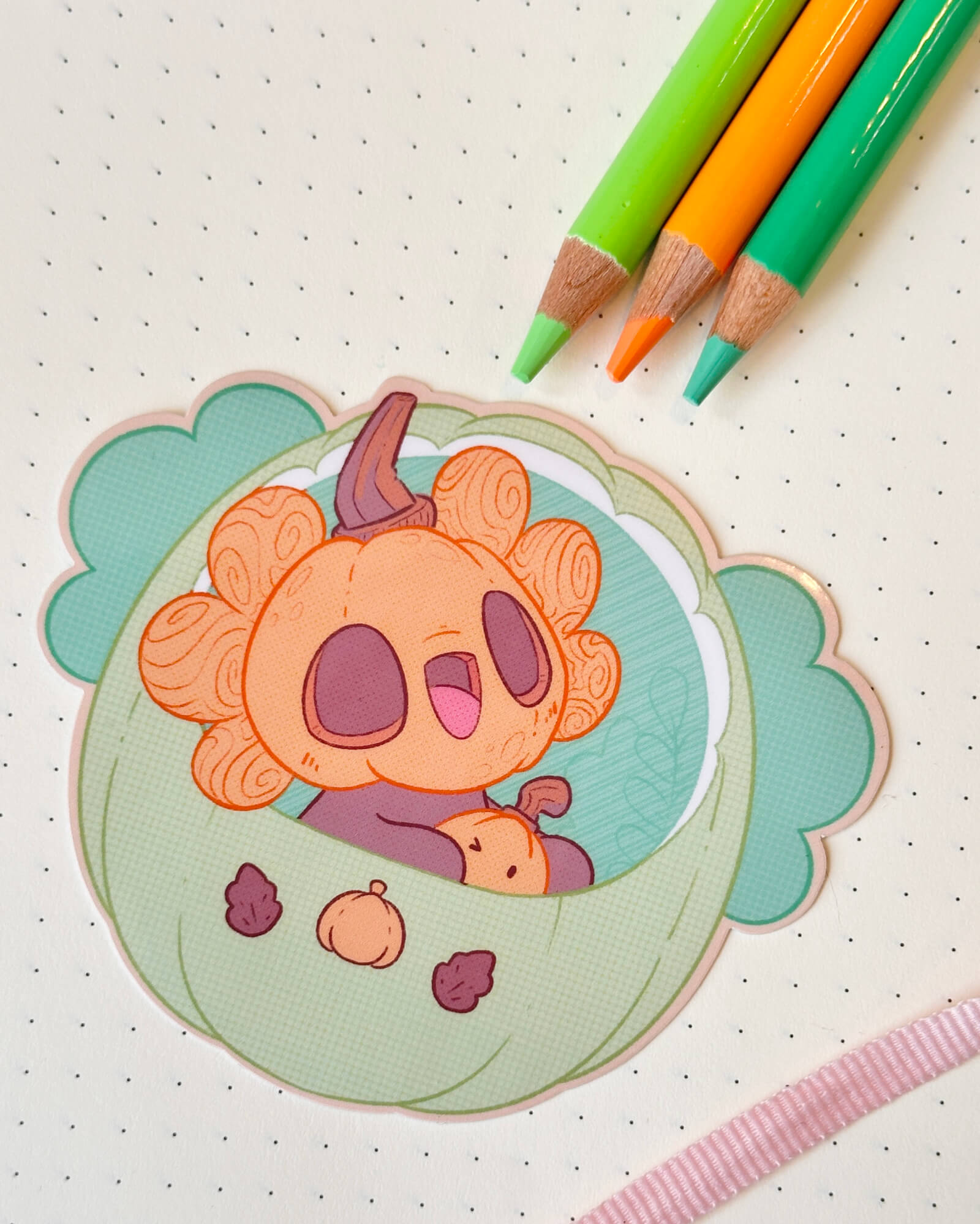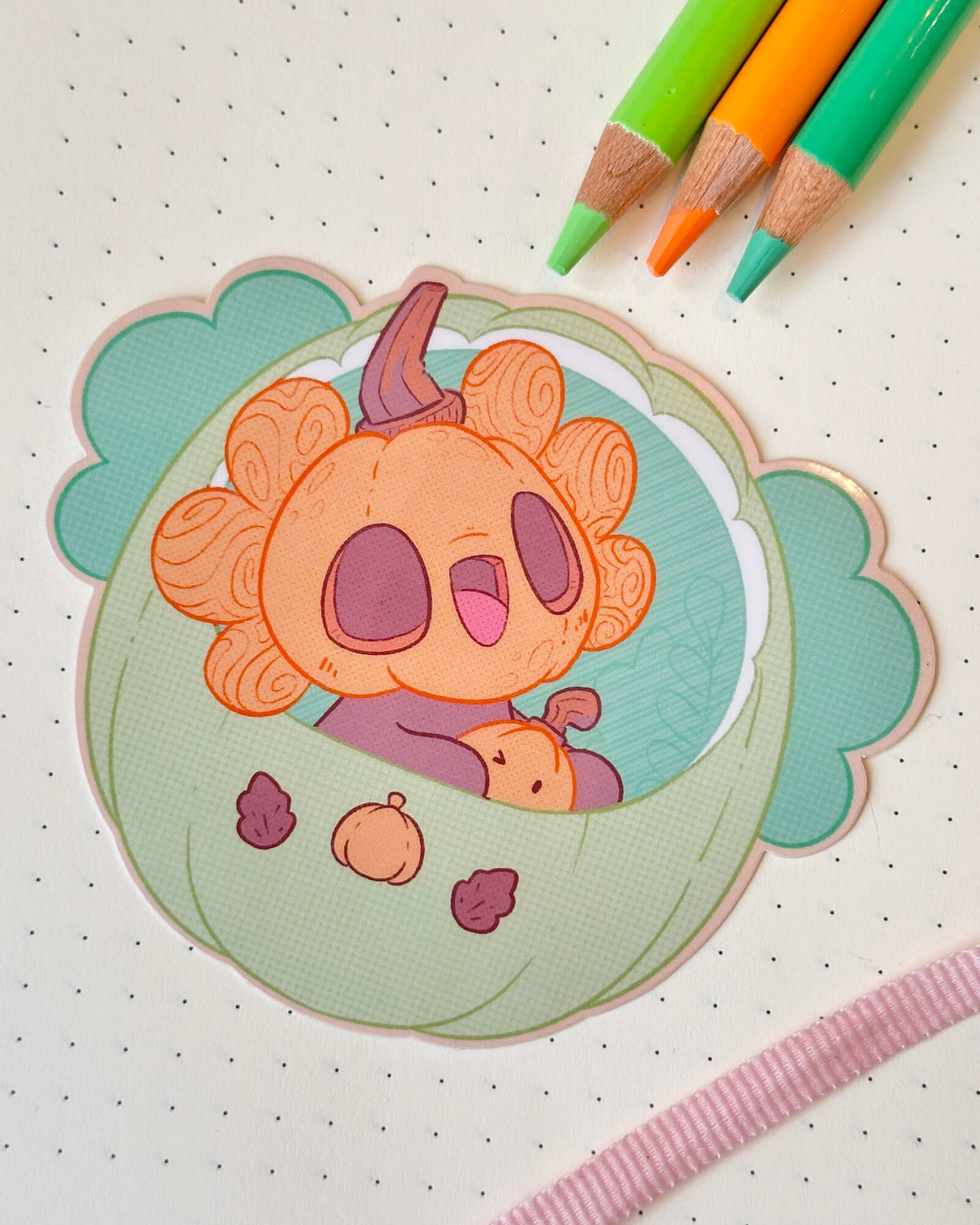 A super cute water-resistant die-cut sticker featuring the Pumpkin Patch Lotlgotchi. Illustrated by Evy Benita. This sticker is approximately two inches on the longest side.
