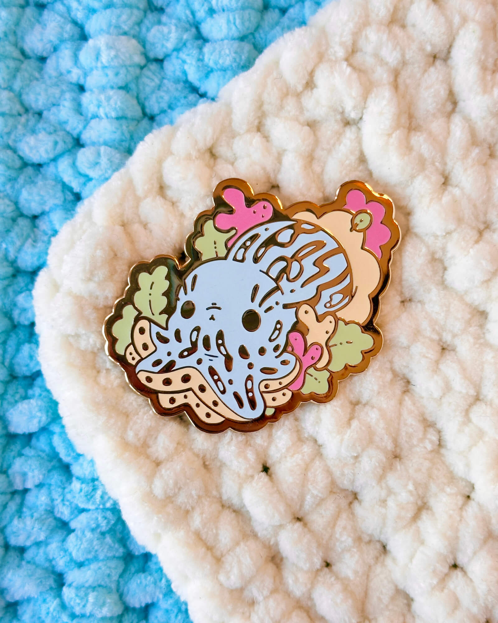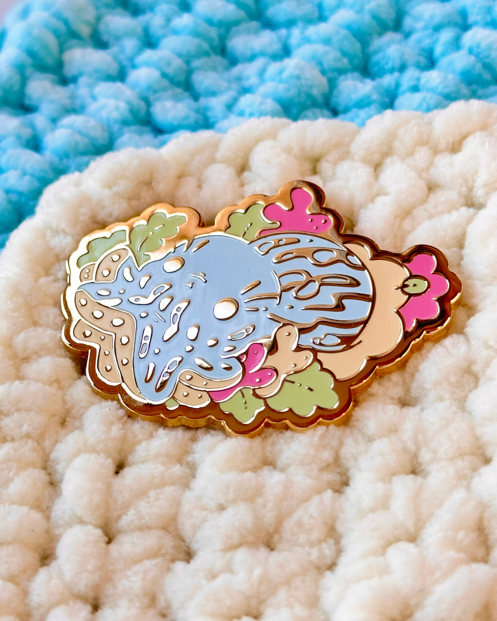 A bubbly enamel pin featuring the Pyjama Squid.