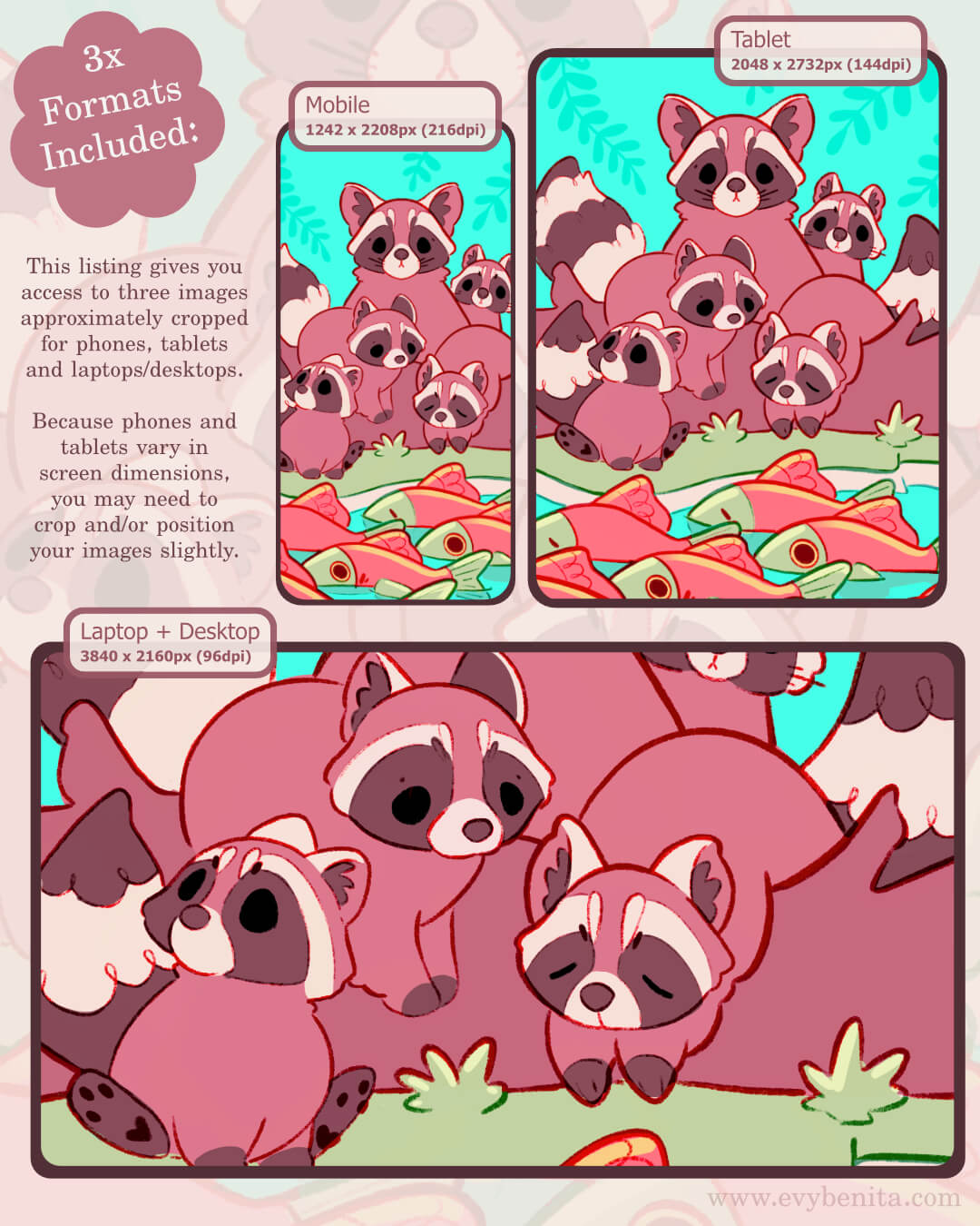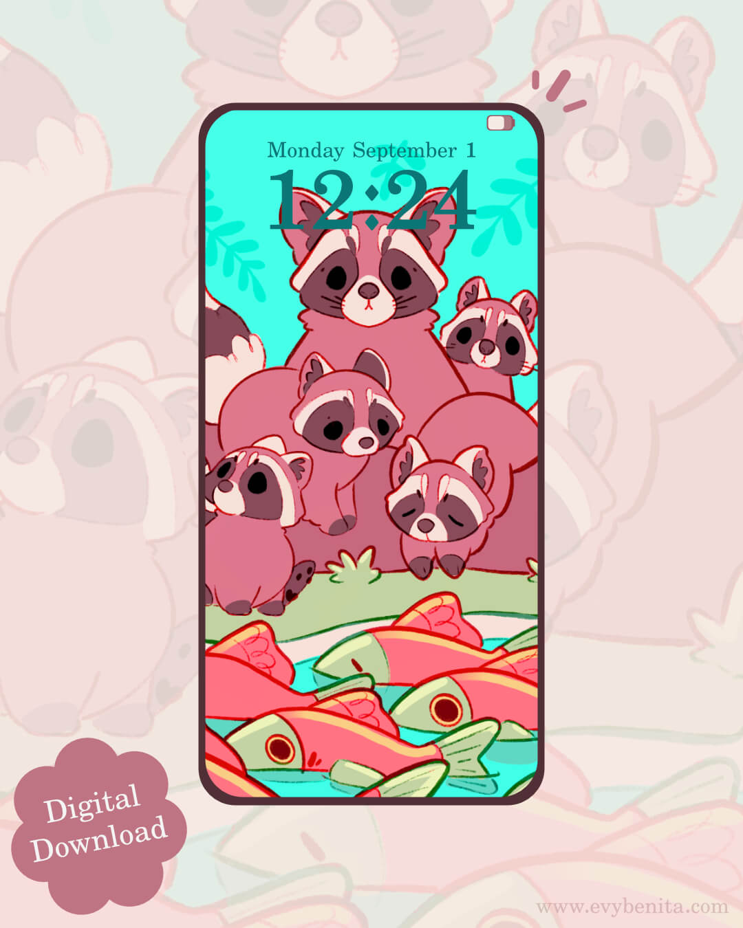 A digital wallpaper pack featuring a cozy raccoon family and sockeye salmon ~