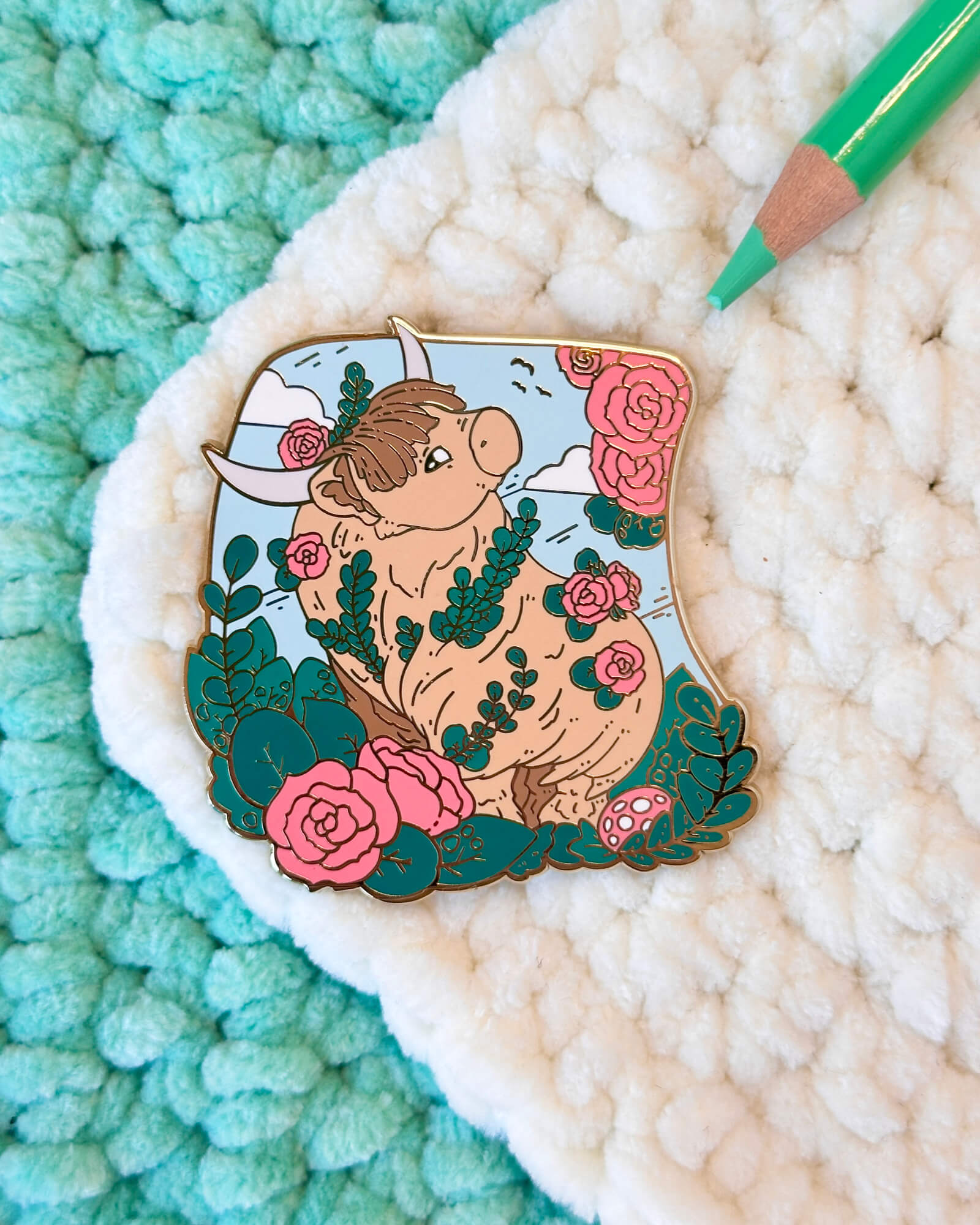 A lovely enamel pin featuring a red rose highland cow.