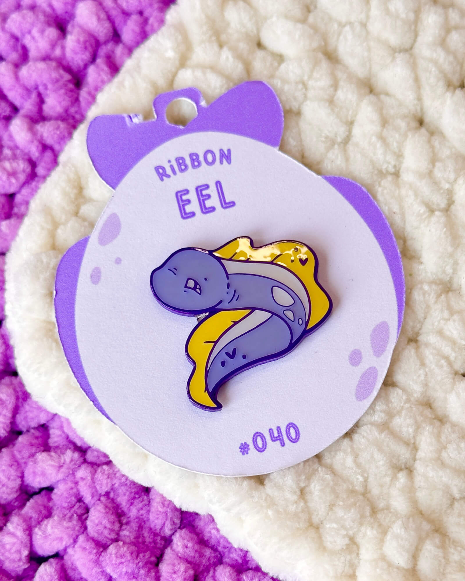 A cute enamel pin featuring a ribbon eel.