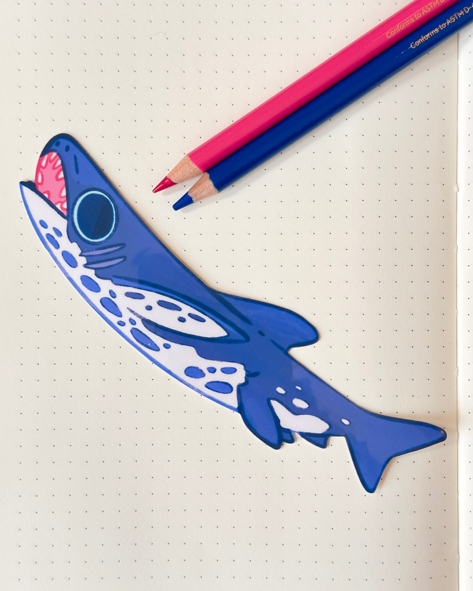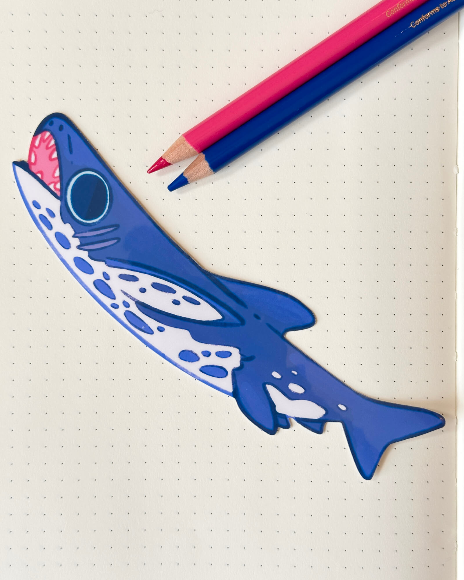 A lovely long boiii sticker featuring the Salmon Shark Illustrated by Evy Benita. This sticker is approximately 15cm (6 inches) long.