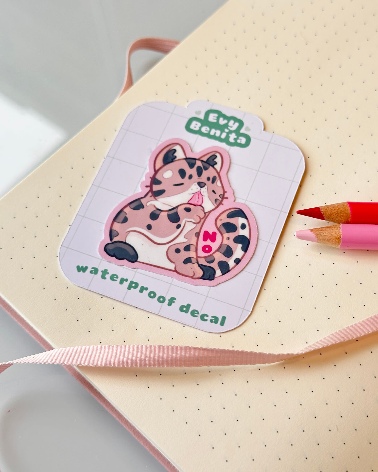 A super cute water-resistant die-cut sticker featuring the Sassy Fishing Cat (licking paw). Illustrated by Evy Benita. This sticker is approximately two inches on the longest side.
