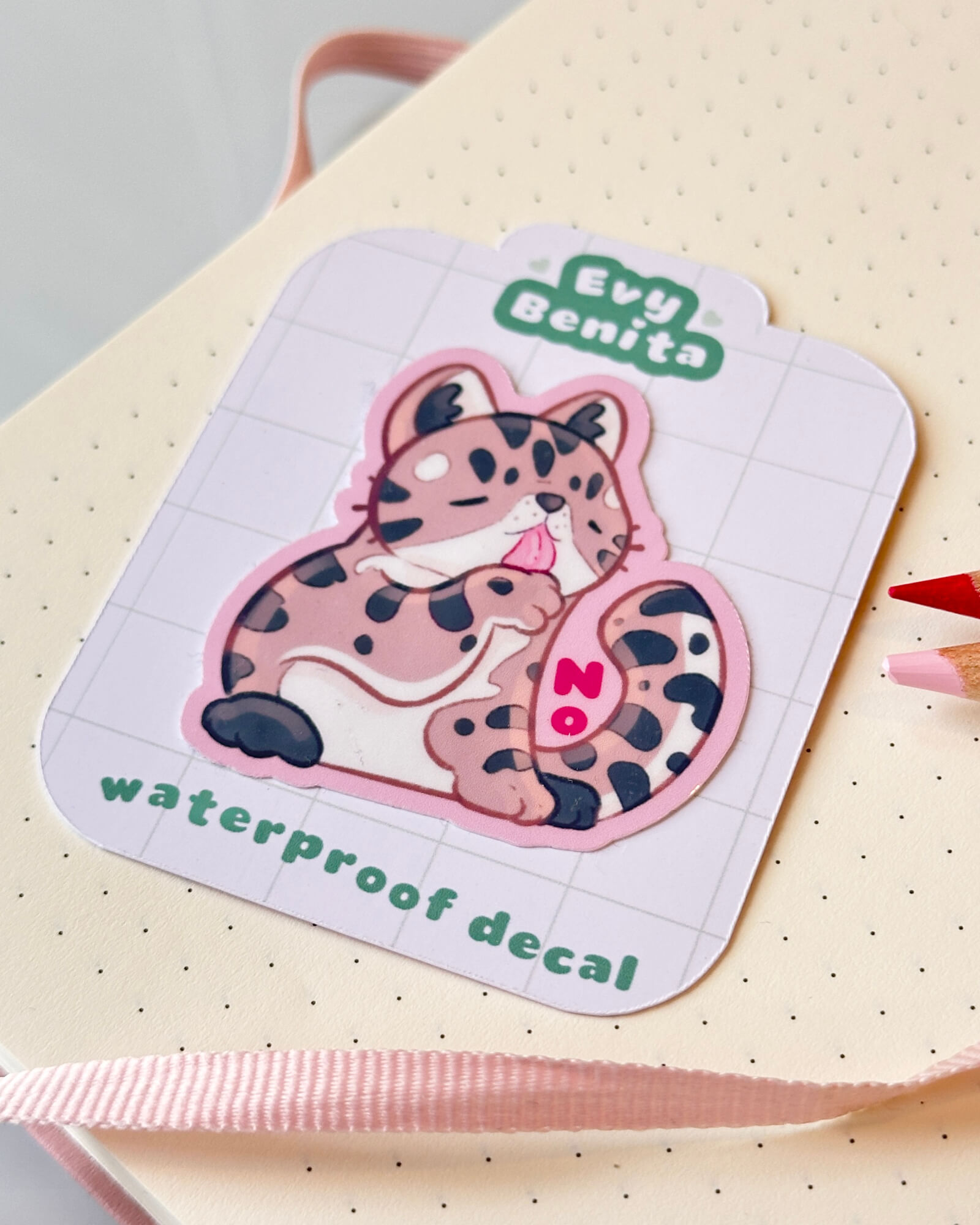 A super cute water-resistant die-cut sticker featuring the Sassy Fishing Cat (licking paw)