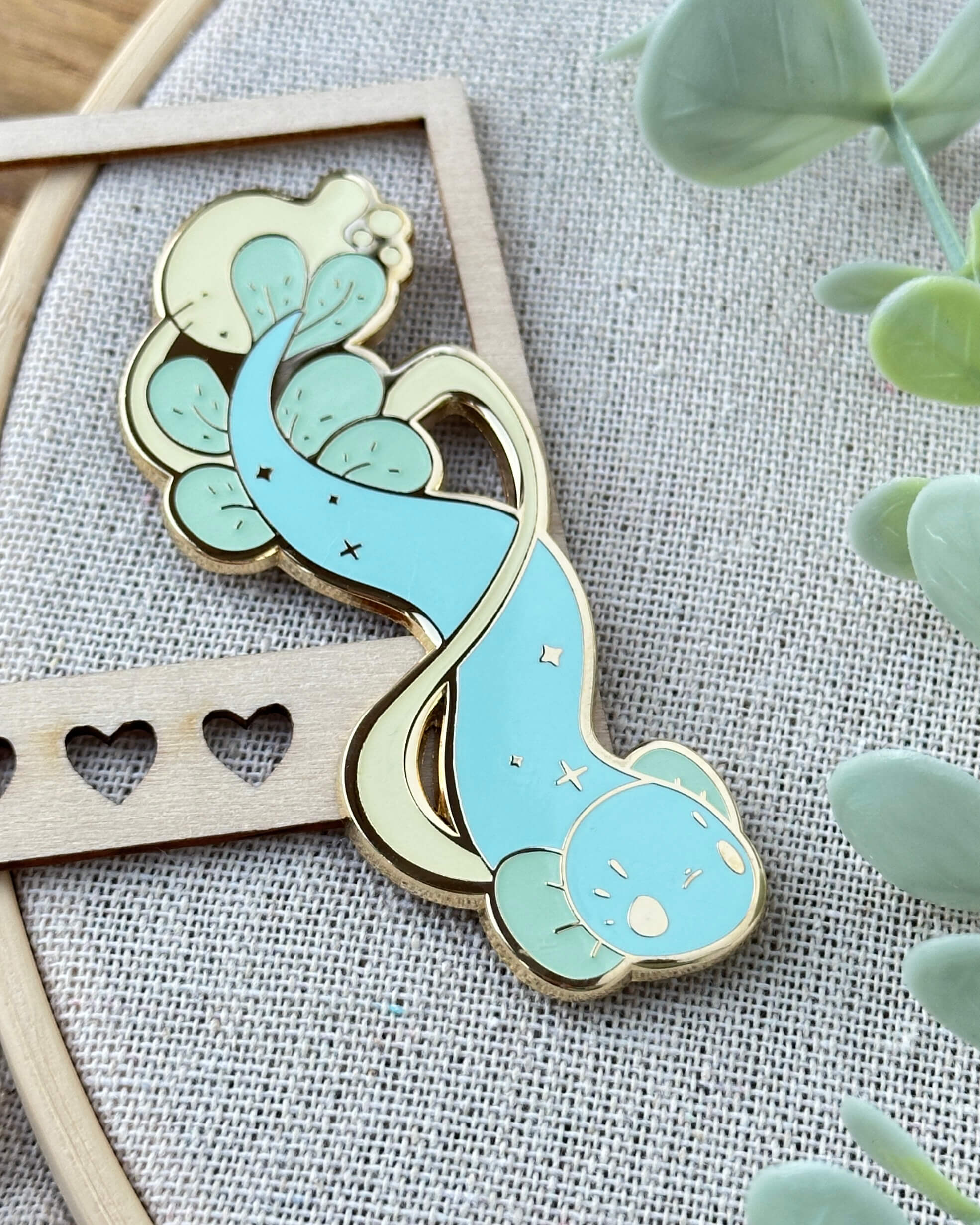 A lovely enamel pin featuring a seafoam dragonfish.