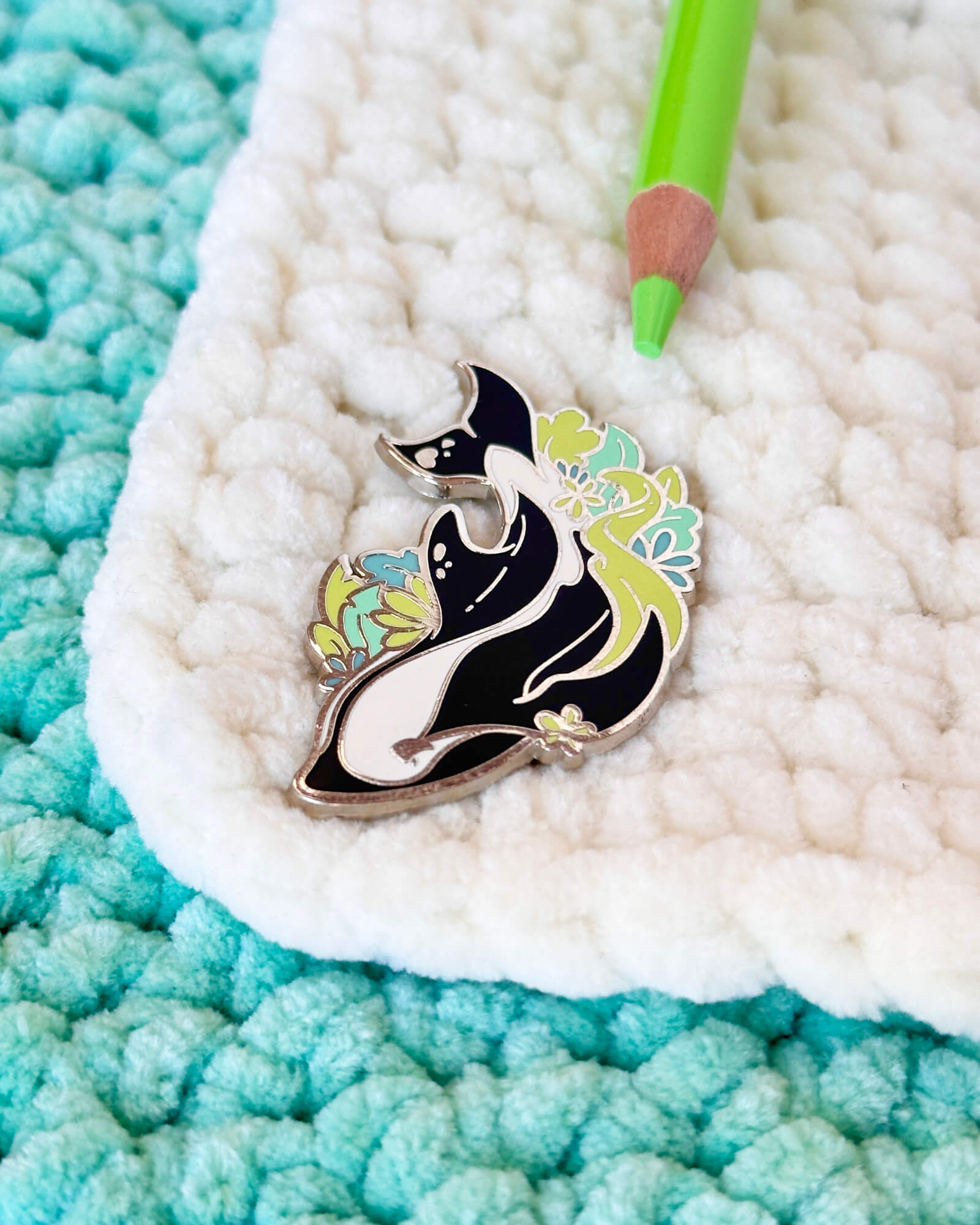 A lovely enamel pin featuring a seaweed hourglass dolphin.