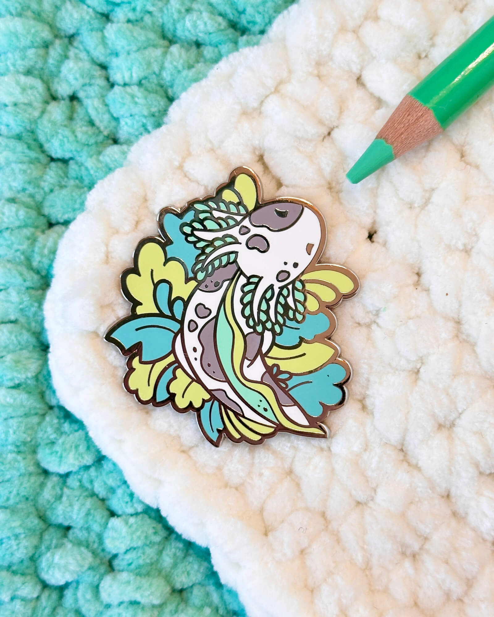 A lovely enamel pin featuring a seaweed speckled axolotl.