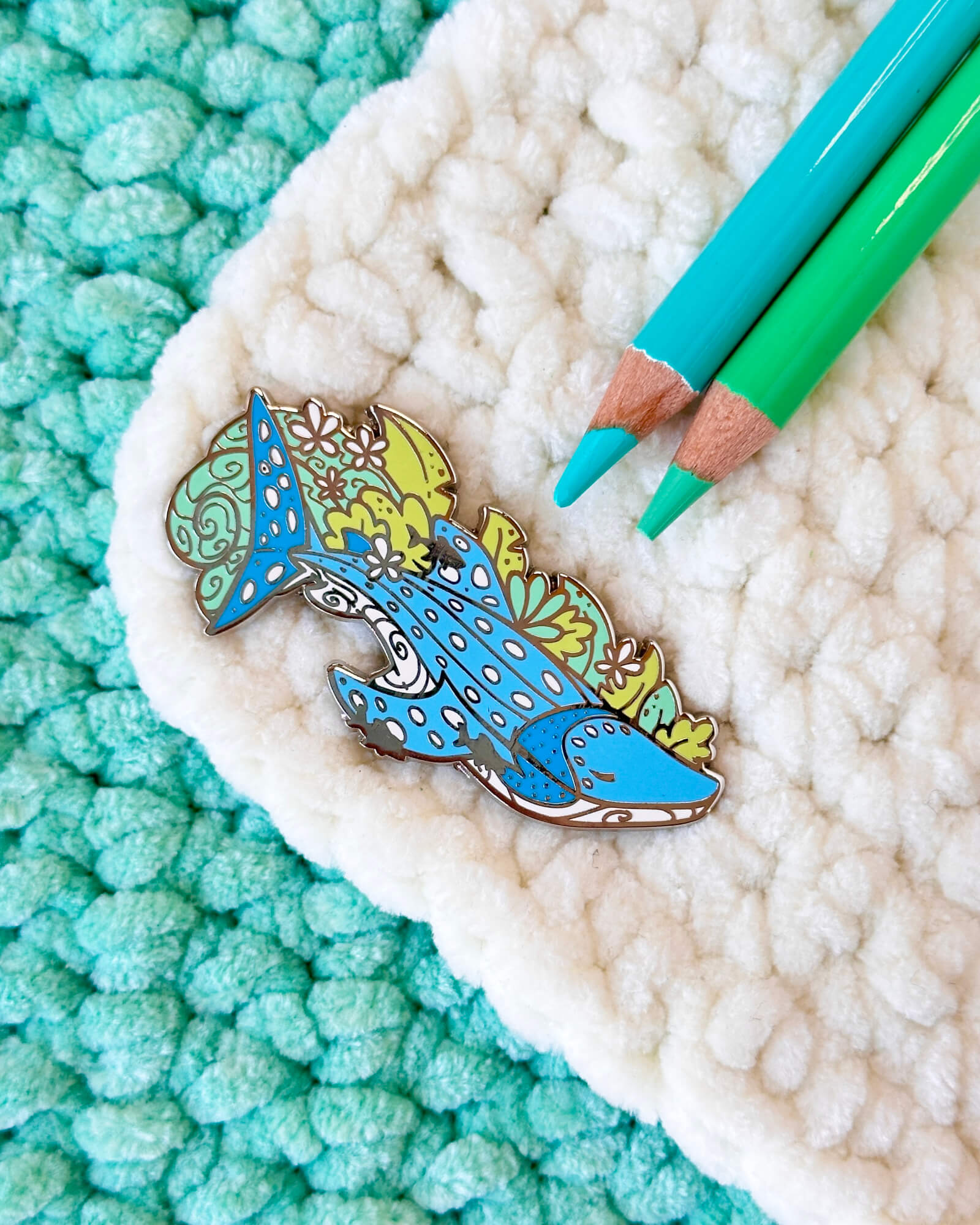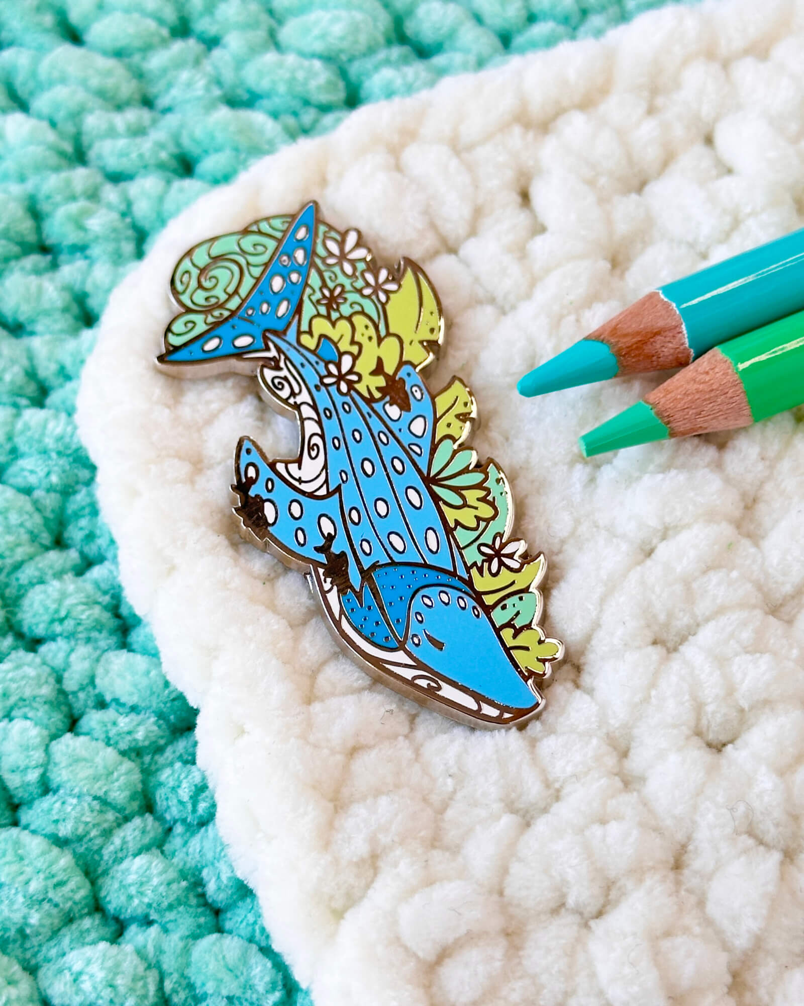 Showcase your love for wildlife with this lovely seaweed whale shark enamel pin badge! A wonderful gift for both pin badge and animal lovers.