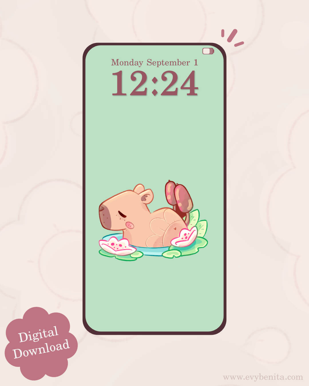 Introducing a lovely wallpaper pack featuring Sleepy Pond Capybara! Illustrated by Evy Benita, this wallpaper pack is perfect for personalising your phone screen.