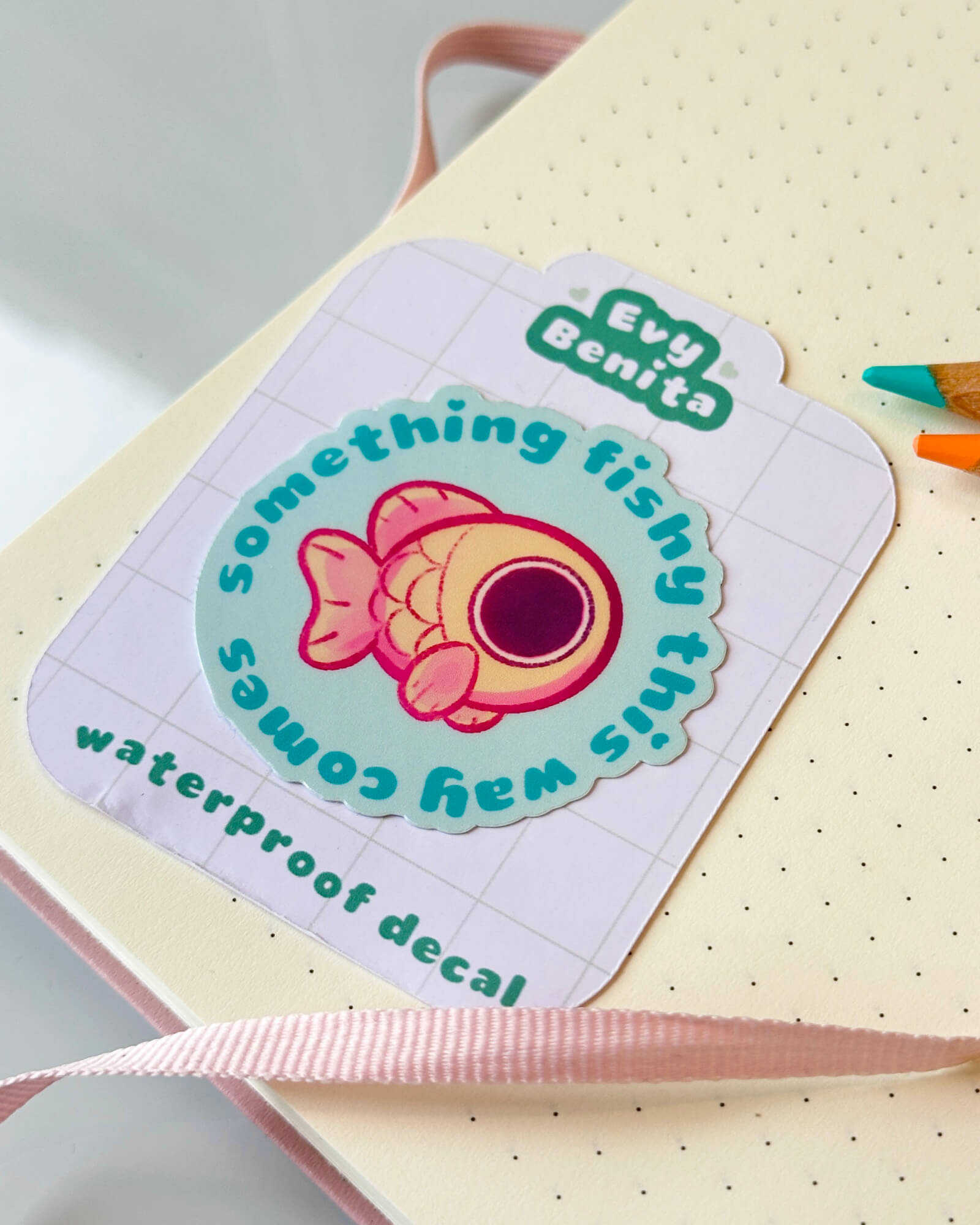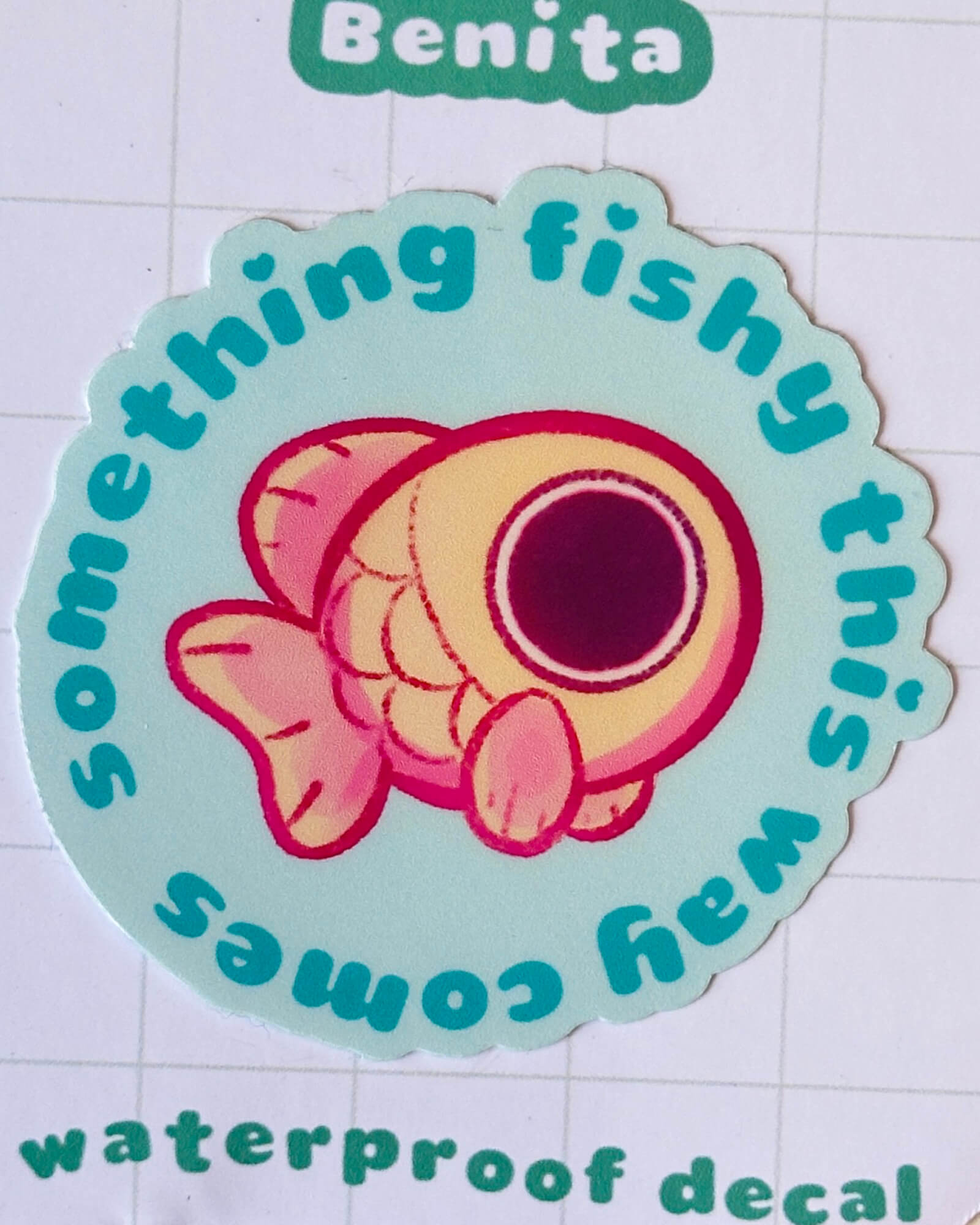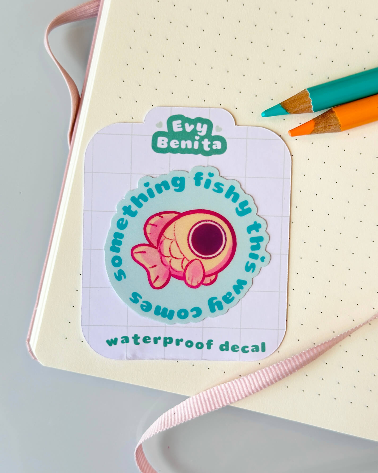 A super cute water-resistant die-cut sticker featuring the Something Fishy This Way Comes. Illustrated by Evy Benita. This sticker is approximately two inches on the longest side.