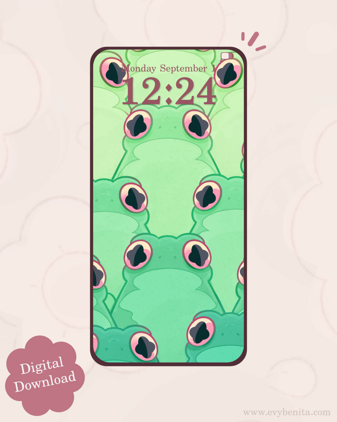 Introducing a lovely wallpaper pack featuring Staring Frogs! Illustrated by Evy Benita, this wallpaper pack is perfect for personalising your phone screen.