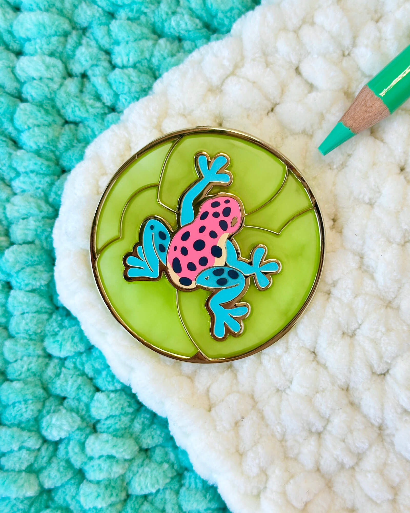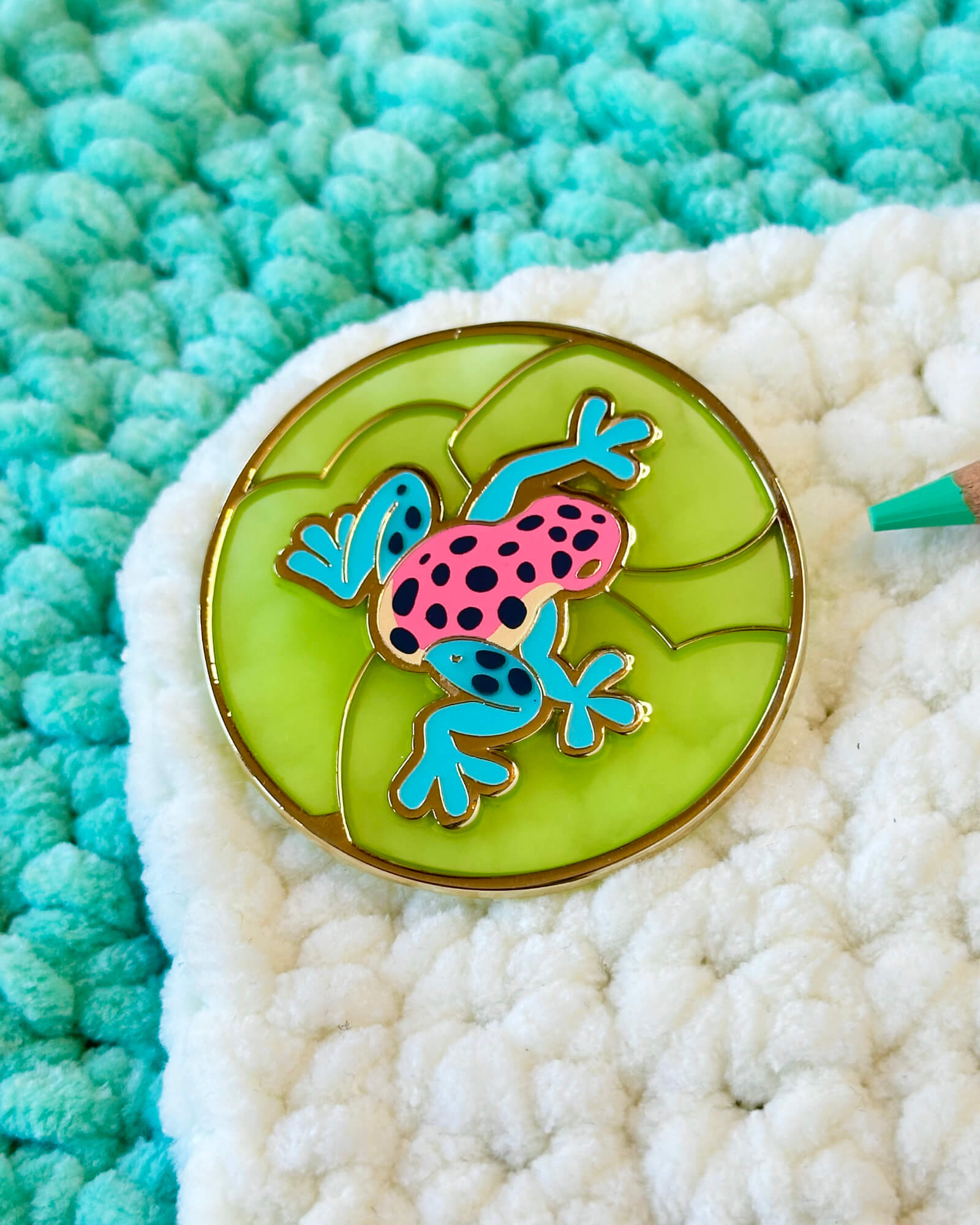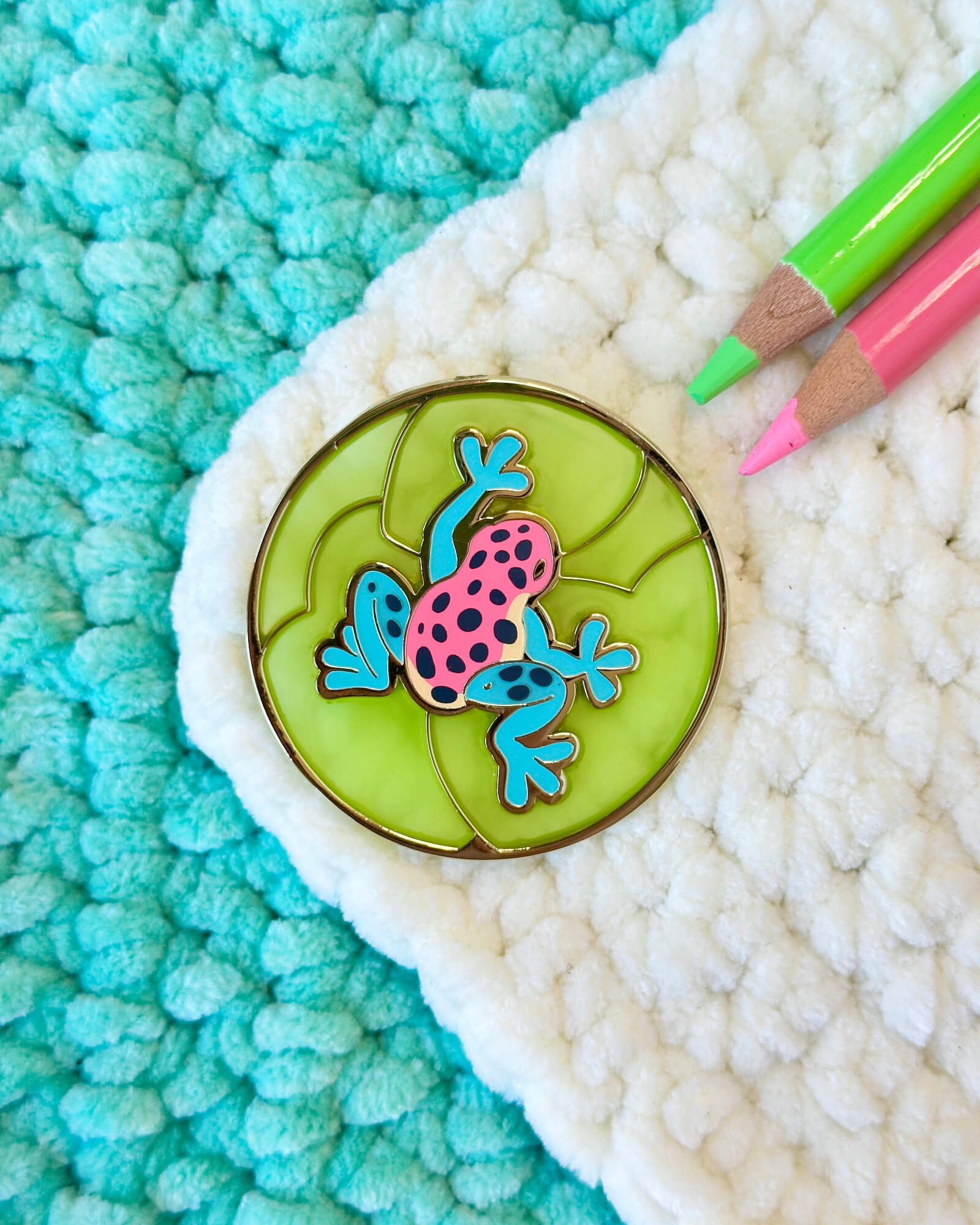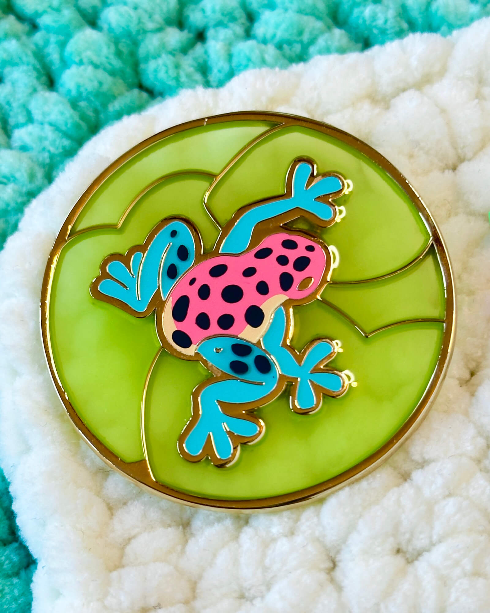 A lovely enamel pin featuring a strawberry poison dart frog.